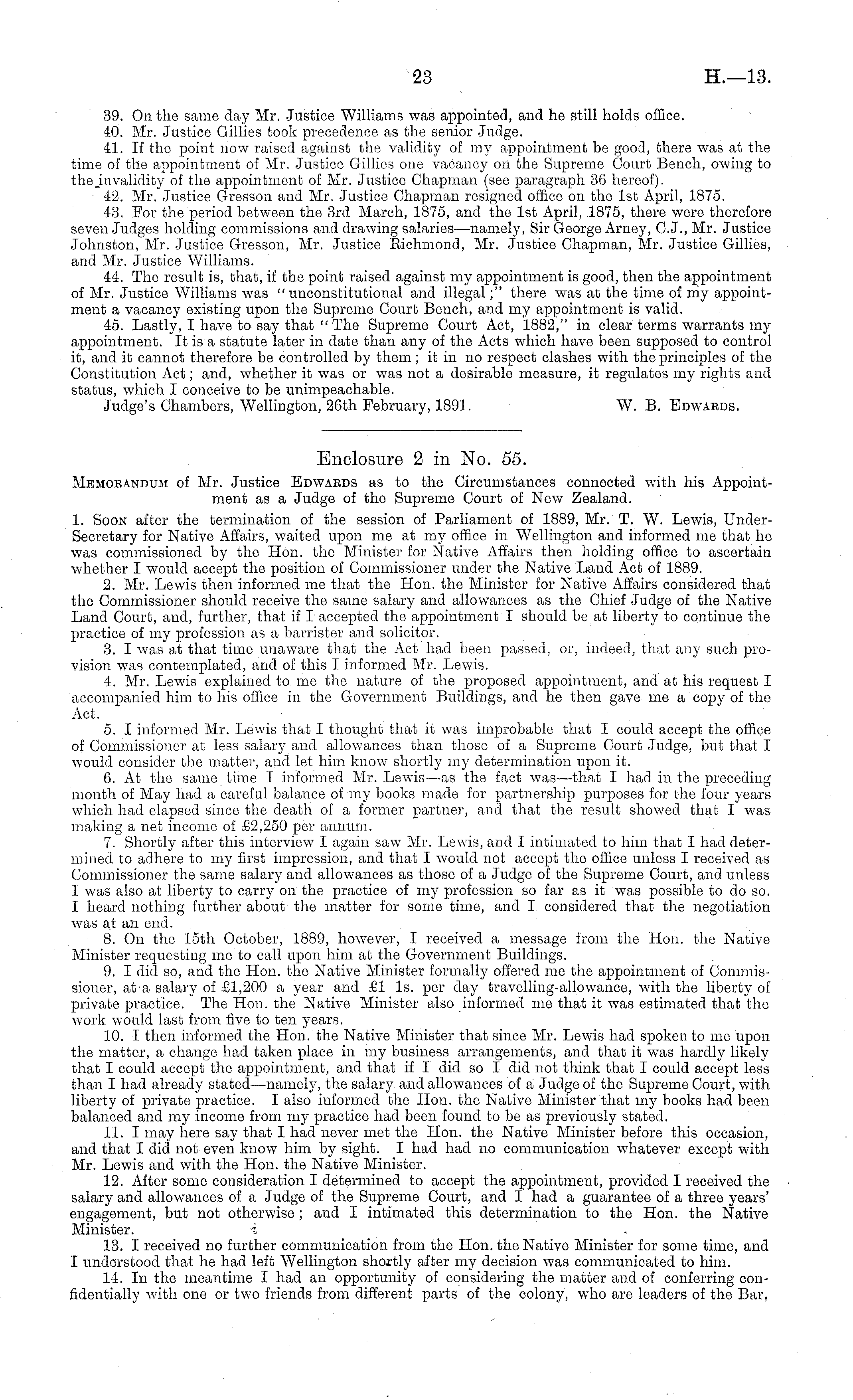 Enclosure 2 in No. 55. Memorandum of Mr. Justice Edwaeds as to the Circumstances connected with his Appointment as a Judge of the Supreme Court of New Zealand. 1. Soon after the termination of the session of Parliament of 1889, Mr. T. W. Lewis, Undersecretary for Native Affairs, waited upon me at my office in Wellington and informed me that he was commissioned by the Hon. the Minister for Native Affairs then holding office to ascertain whether I would accept the position of Commissioner under the Native Land Act of 1889. 2. Mr. Lewis then informed me that the Hon. the Minister for Native Affairs considered that the Commissioner should receive the same salary and allowances as the Chief Judge of the Native Land Court, and, further, that if I accepted the appointment I should be at liberty to continue the practice of my profession as a barrister and solicitor. 3. I was at that time unaware that the Act had been passed, or, indeed, that any such provision was contemplated, and of this I informed Mr. Lewis. 4. Mr. Lewis explained to me the nature of the proposed appointment, and at his request I accompanied him to his office in the Government Buildings, and he then gave me a copy of the Act. 5. I informed Mr. Lewis that I thought that it was improbable that I could accept the office of Commissioner at less salary and allowances than those of a Supreme Court Judge, but that I would consider the matter, and let him know shortly my determination upon it. 6. At the same time I informed Mr. Lewis—as the fact was —that I had in the preceding month of May had a careful balance of my books made for partnership purposes for the four years which had elapsed since the death of a former partner, and that the result showed that I was making a net income of £2,250 per annum. 7. Shortly after this interview I again saw Mr. Lewis, and I intimated to him that I had determined to adhere to my first impression, and that I would not accept the office unless I received as Commissioner the same salary and allowances as those of a Judge of the Supreme Court, and unless I was also at liberty to carry on the practice of my profession so far as it was possible to do so. I heard nothing further about the matter for some time, and I considered that the negotiation was at an end. 8. On the 15th October, 1889, however, I received a message from the Hon. the Native Minister requesting me to call upon him at the Government Buildings. 9. I did so, and the Hon. the Native Minister formally offered me the appointment of Commissioner, at a salary of £1,200 a year and £1 Is. per day travelling-allowance, with the liberty of private practice. The Hon. the Native Minister also informed me that it was estimated that the work would last from five to ten years. 10. I then informed the Hon. the Native Minister that since Mr. Lewis had spoken to me upon the matter, a change had taken place in my business arrangements, and that it was hardly likely that I could accept the appointment, and that if I did so I did not think that I could accept less than I had already stated —namely, the salary and allowances of a Judge of the Supreme Court, with liberty of private practice. I also informed the Hon. the Native Minister that my books had been balanced and my income from my practice had been found to be as previously stated. 11. I may here say that I had never met the Hon. the Native Minister before this occasion, and that I did not even know him by sight. I had had no communication whatever except with Mr. Lewis and with the Hon. the Native Minister. 12. After some consideration I determined to accept the appointment, provided I received the salary and allowances of a Judge of the Supreme Court, and I had a guarantee of a three years' engagement, but not otherwise ; and I intimated this determination to the Hon. the Native Minister. 13. I received no further communication from the Hon. the Native Minister for some time, and I understood that he had left Wellington shortly after my decision was communicated to him. 14. In the meantime I had an opportunity of considering the matter and of conferring confidentially with one or two friends from different parts of the colony, who are leaders of the Bar,