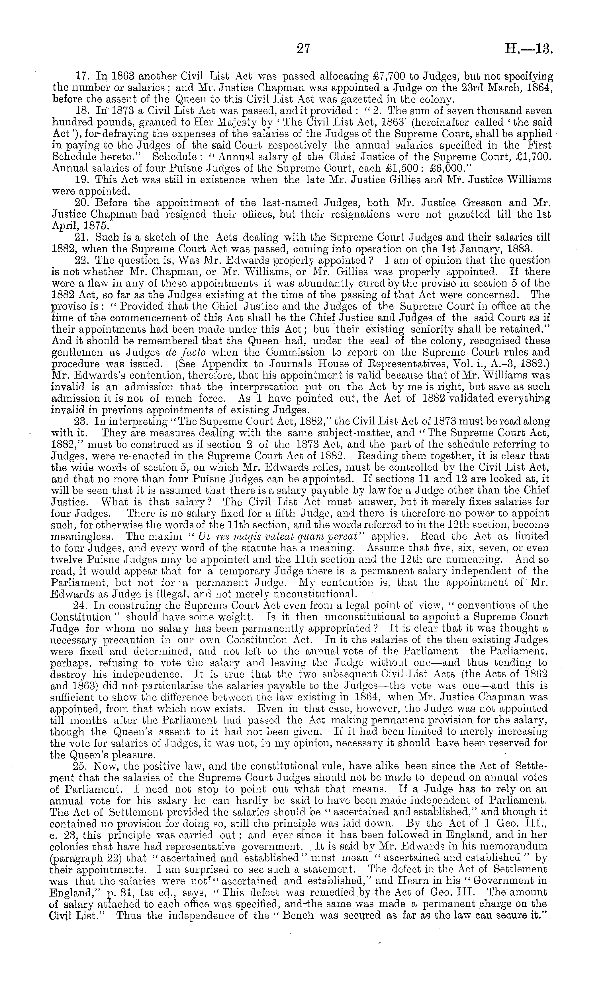 17. In 1863 another Civil List Act was passed allocating £7,700 to Judges, but not specifying the number or salaries; and Mr. Justice Chapman was appointed a Judge on the 23rd March, 1864, before the assent of the Queen to this Civil List Act was gazetted in the colony. 18. In 1873 a Civil List Act was passed, and it provided : " 2. The sum of seven thousand seven hundred pounds, granted to Her Majesty by ' The Civil List Act, 1863' (hereinafter called ' the said Act'), for-defraying the expenses of the salaries of the Judges of the Supreme Court, shall be applied in paying to the Judges of the said Court respectively the annual salaries specified in the First Schedule hereto." Schedule : " Annual salary of the Chief Justice of the Supreme Court, £1,700. Annual salaries of four Puisne Judges of the Supreme Court, each £1,500: £6,000." 19. This Act was still in existence when the late Mr. Justice Gillies and Mr. Justice Williams were appointed. 20. Before the appointment of the last-named Judges, both Mr. Justice Gresson and Mr. Justice Chapman had resigned their offices, but their resignations were not gazetted till the Ist April, 1875. 21. Such is a sketch of the Acts dealing with the Supreme Court Judges and their salaries till 1882, when the Supreme Court Act was passed, coming into operation on the Ist January, 1883. 22. The question is, Was Mr. Edwards properly appointed ? lam of opinion that the question is not whether Mr. Chapman, or Mr. Williams, or Mr. Gillies was properly appointed. If there were a flaw in any of these appointments it was abundantly cured by the proviso in section 5 of the 1882 Act, so far as the Judges existing at the time of the passing of that Act were concerned. The proviso is : " Provided that the Chief Justice and the Judges of the Supreme Court in office at the time of the commencement of this Act shall be the Chief Justice and Judges of the said Court as if their appointments had been made under this Act; but their existing seniority shall be retained." And it should be remembered that the Queen had, under the seal of the colony, recognised these gentlemen as Judges de facto when the Commission to report on the Supreme Court rules and procedure was issued. (See Appendix to Journals House of Kepresentatives, Vol. L, A.-3, 1882.) Mr. Edwards's contention, therefore, that his appointment is valid because that of Mr. Williams was invalid is an admission that the interpretation put on the Act by me is right, but save as such admission it is not of much force. As I have pointed out, the Act of 1882 validated everything invalid in previous appointments of existing Judges. 23. In interpreting "The Supreme Court Act, 1882," the Civil List Act of 1873 must be read along with it. They are measures dealing with the same subject-matter, and "The Supreme Court Act, 1882," must be construed as if section 2 of the 1873 Act, and the part of the schedule referring to Judges, were re-enacted in the Supreme Court Act of 1882. Beading them together, it is clear that the wide words of section 5, on which Mr. Edwards relies, must be controlled by the Civil List Act, and that no more than four Puisne Judges can be appointed. If sections 11 and 12 are looked at, it will be seen that it is assumed that there is a salary payable by law for a Judge other than the Chief Justice. What is that salary ? The Civil List Act must answer, but it merely fixes salaries for four Judges. There is no salary fixed for a fifth Judge, and there is therefore no power to appoint such, for otherwise the words of the 11th section, and the words referred to in the 12th section, become meaningless. The maxim "Ot res magis valeat quampereat" applies. Bead the Act as limited to four Judges, and every word of the statute has a meaning. Assume that five, six, seven, or even twelve Puisne Judges may be appointed and the 11th section and the 12th are unmeaning. And so read, it would appear that for a temporary Judge there is a permanent salary independent of the Parliament, but not for-a permanent Judge. My contention is, that the appointment of Mr. Edwards as Judge is illegal, and not merely unconstitutional. 24. In construing the Supreme Court Act even from a legal point of view, " conventions of the Constitution " should have some weight. Is it then unconstitutional to appoint a Supreme Court Judge for whom no salary has been permanently appropriated ? It is clear that it was thought a necessary precaution in our own Constitution Act. In it the salaries of the then existing Judges were fixed and determined, and not left to the annual vote of the Parliament —the Parliament, perhaps, refusing to vote the salary and leaving the Judge without one —and thus tending to destroy his independence. It is true that the two subsequent Civil List Acts (the Acts of 1362 and 1863) did not particularise the salaries payable to the Judges—the vote was one—and this is sufficient to show the difference between the law existing in 1864, when Mr. Justice Chapman was appointed, from that which now exists. Even in that case, however, the Judge was not appointed till months after the Parliament had passed the Act making permanent provision for the salary, though the Queen's assent to it had not been given. If it had been limited to merely increasing the vote for salaries of Judges, it was not, in my opinion, necessary it should have been reserved for the Queen's pleasure. 25. Now, the positive law, and the constitutional rule, have alike been since the Act of Settlement that the salaries of the Supreme Court Judges should not be made to depend on annual votes of Parliament. I need not stop to point out what that means. If a Judge has to rely on an annual vote for his salary he can hardly be said to have been made independent of Parliament. The Act of Settlement provided the salaries should be " ascertained and established," and though it contained no provision for doing so, still the principle was laid down. By the A