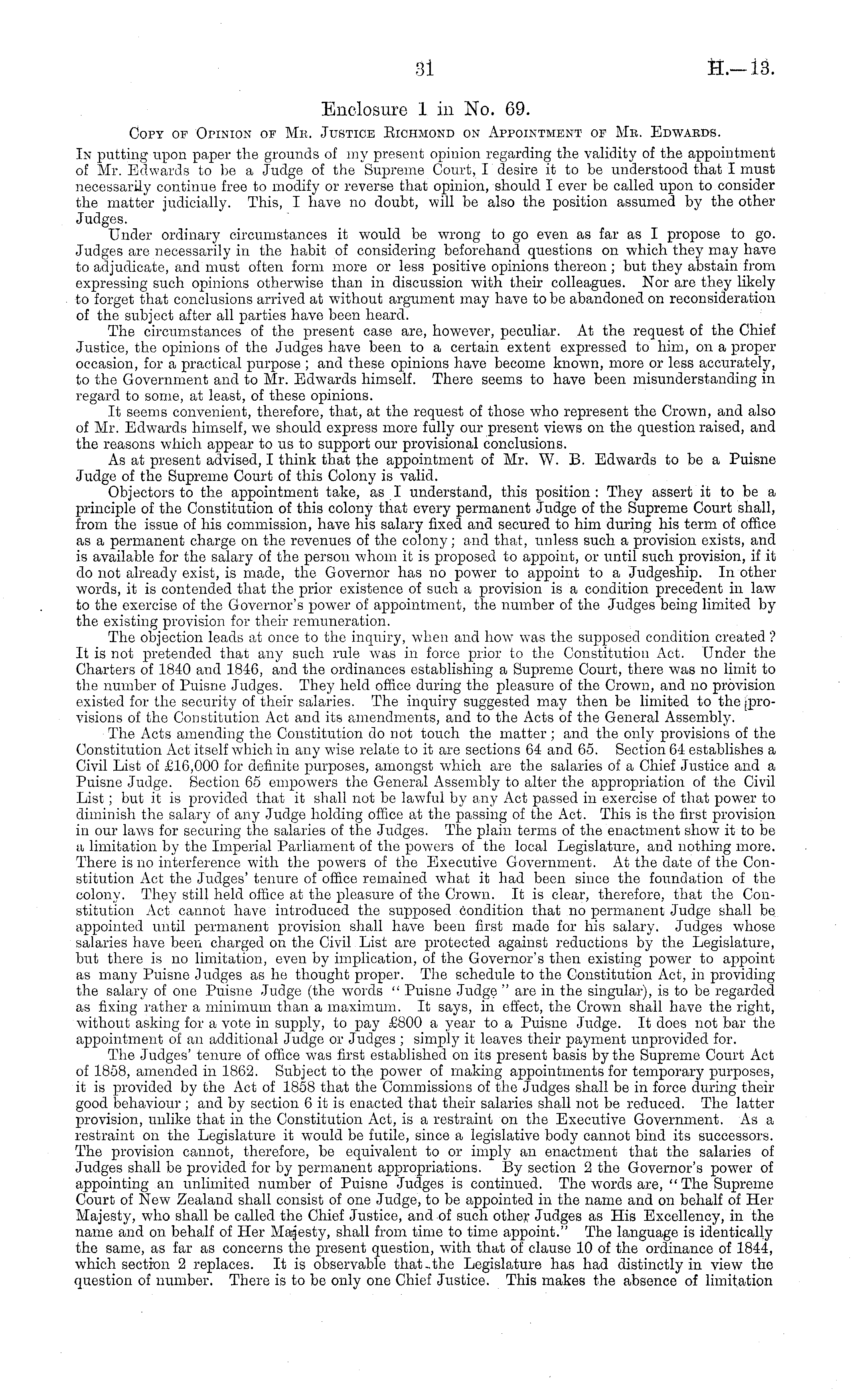 Enclosure 1 in No. 69. Copy of Opinion of Me. Justice Bichmond on Appointment of Mr. Edwaeds. In putting upon paper the grounds of my present opinion regarding the validity of the appointment of Mr. Edwards to be a Judge of the Supreme Court, I desire it to be understood that I must necessarily continue free to modify or reverse that opinion, should I ever be called upon to consider the matter judicially. This, I have no doubt, will be also the position assumed by the other Judges. Under ordinary circumstances it would be wrong to go even as far as I propose to go. Judges are necessarily in the habit of considering beforehand questions on which they may have to adjudicate, and must often form more or less positive opinions thereon ; but they abstain from expressing such opinions otherwise than in discussion with their colleagues. Nor are they likely to forget that conclusions arrived at without argument may have to be abandoned on reconsideration of the subject after all parties have been heard. The circumstances of the present case are, however, peculiar. At the request of the Chief Justice, the opinions of the Judges have been to a certain extent expressed to him, on a proper occasion, for a practical purpose ; and these opinions have become known, more or less accurately, to the Government and to Mr. Edwards himself. There seems to have been misunderstanding in regard to some, at least, of these opinions. It seems convenient, therefore, that, at the request of those who represent the Crown, and also of Mr. Edwards himself, we should express more fully our present views on the question raised, and the reasons which appear to us to support our provisional conclusions. As at present advised, I think that the appointment of Mr. W. B. Edwards to be a Puisne Judge of the Supreme Court of this Colony is valid. Objectors to the appointment take, as I understand, this position : They assert it to be a principle of the Constitution of this colony that every permanent Judge of the Supreme Court shall, from the issue of his commission, have his salary fixed and secured to him during his term of office as a permanent charge on the revenues of the colony; and that, unless such a provision exists, and is available for the salary of the person whom it is proposed to appoint, or until such provision, if it do not already exist, is made, the Governor has no power to appoint to a Judgeship. In other words, it is contended that the prior existence of such a provision is a condition precedent in law to the exercise of the Governor's power of appointment, the number of the Judges being limited by the existing provision for their remuneration. The objection leads at once to the inquiry, when and how was the supposed condition created ? It is not pretended that any such rule was in force prior to the Constitution Act. Under the Charters of 1840 and 1846, and the ordinances establishing a Supreme Court, there was no limit to the number of Puisne Judges. They held office during the pleasure of the Crown, and no provision existed for the security of their salaries. The inquiry suggested may then be limited to the visions of the Constitution Act and its amendments, and to the Acts of the General Assembly. The Acts amending the Constitution do not touch the matter ; and the only provisions of the Constitution Act itself which in any wise relate to it are sections 64 and 65. Section 64 establishes a Civil List of £16,000 for definite purposes, amongst which are the salaries of a Chief Justice and a Puisne Judge. Section 65 empowers the General Assembly to alter the appropriation of the Civil List; but it is provided that it shall not be lawful by any Act passed in exercise of that power to diminish the salary of any Judge holding office at the passing of the Act. This is the first provision in our laws for securing the salaries of the Jixdges. The plain terms of the enactment show it to be a limitation by the Imperial Parliament of the powers of the local Legislature, and nothing more. There is no interference with the powers of the Executive Government. At the date of the Constitution Act the Judges' tenure of office remained what it had been since the foundation of the colony. They still held office at the pleasure of the Crown. It is clear, therefore, that the Constitution Act cannot have introduced the supposed condition that no permanent Judge shall be appointed until permanent provision shall have been first made for his salary. Judges whose salaries have been charged on the Civil List are protected against reductions by the Legislature, but there is no limitation, even by implication, of the Governor's then existing power to appoint as many Puisne Judges as he thought proper. The schedule to the Constitution Act, in providing the salary of one Puisne Judge (the words " Puisne Judge " are in the singular), is to be regarded as fixing rather a minimum than a maximum. It says, in effect, the Crown shall have the right, without asking for a vote in supply, to pay £800 a year to a Puisne Judge. It does not bar the appointment of an additional Judge or Judges ; simply it leaves their payment unprovided for. The Judges' tenure of office was first established on its present basis by the Supreme Court Act of 1858, amended in 1862. Subject to the power of making appointments for temporary purposes, it is provided by the Act of 1858 that the Commissions of the Judges shall be in force during their good behaviour ; and by section 6it is enacted that their salaries shall not be reduced. The latter provision, unlike that in the Constitution Act, is a restraint on the Executive Government. As a restraint on the Legislature it would be futile, since a legislative body cannot bind its successors. The provision cannot, therefore, be equivalent to or imply an enactment that the salaries of Judges shall be provided for by permanent appropriations. By section 2 the Governor's power of appointing an unlimited number of Puisne 