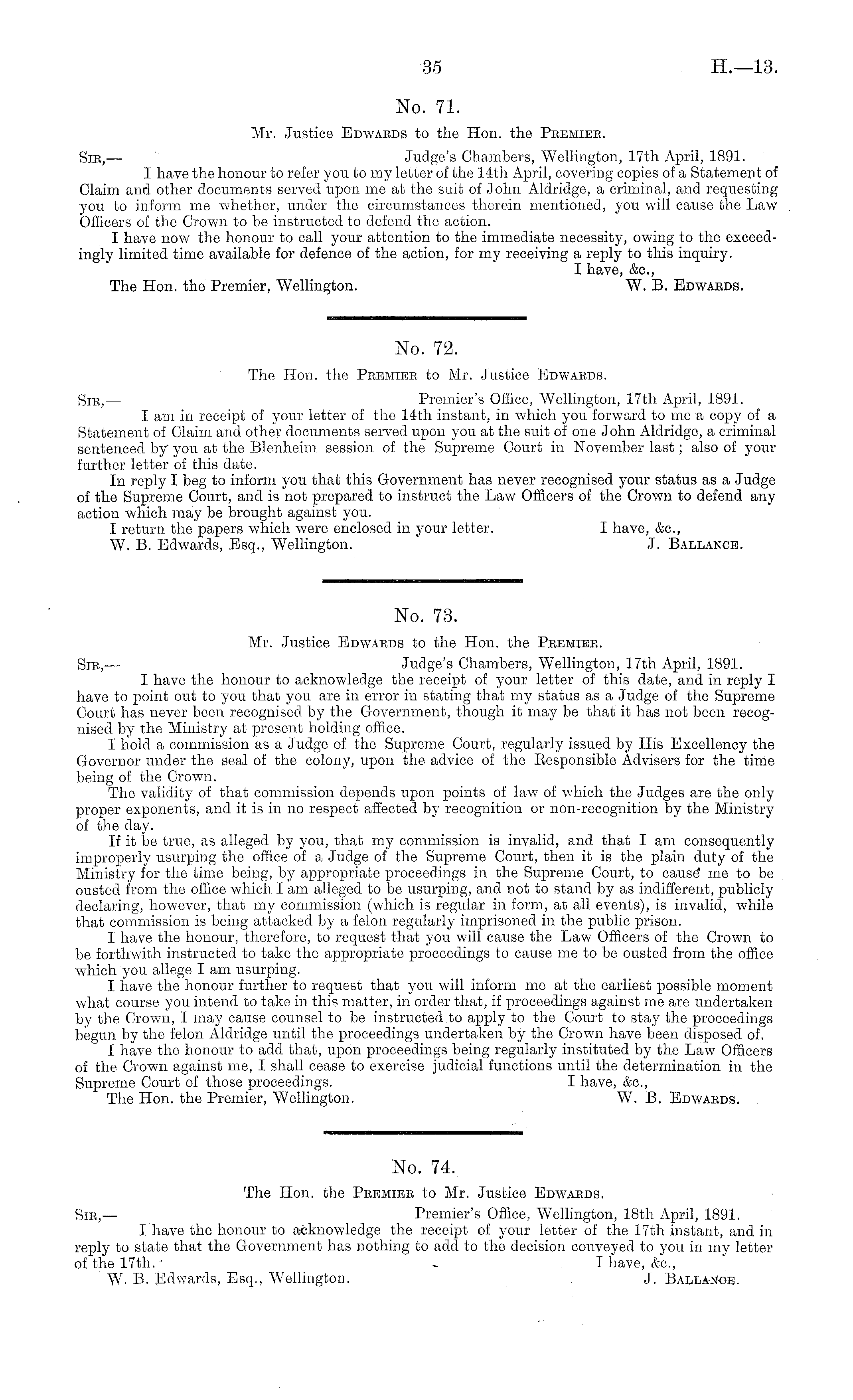 No. 72. The Hon. the Pkemieb to Mr. Justice Edwaeds. Sib,— Premier's Office, Wellington, 17th April, 1891. I am in receipt of your letter of the 14th instant, in which you forward to me a copy of a Statement of Claim and other documents served upon you at the suit of one John Aldridge, a criminal sentenced by you at the Blenheim session of the Supreme Court in November last; also of your further letter of this date. In reply I beg to inform you that this Government has never recognised your status as a Judge of the Supreme Court, and is not prepared to instruct the Law Officers of the Crown to defend any action which may be brought against you. I return the papers which were enclosed in your letter. I have, &c, W. B. Edwards, Esq., Wellington. J. Ballance.