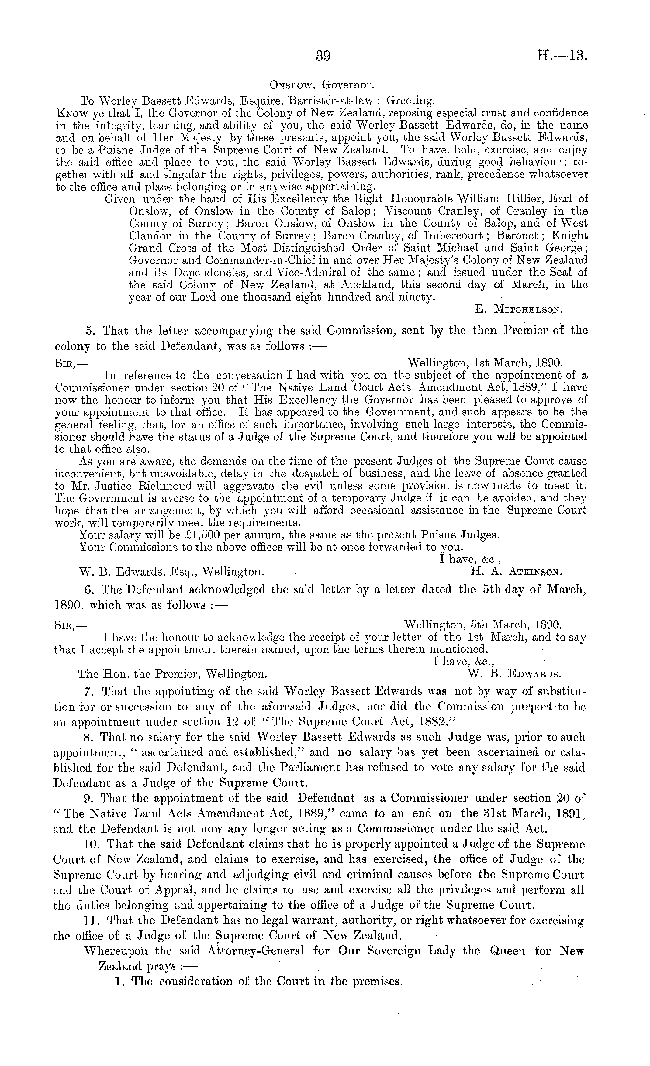 Onslow, Governor. To Worley Bassett Edwards, Esquire, Barrister-at-law : Greeting. Know ye that I, the Governor of the Colony of New Zealand, reposing especial trust and confidence in the integrity, learning, and ability of you, the said Worley Bassett Edwards, do, in the name and on behalf of Her Majesty by these presents, appoint you, the said Worley Bassett Edwards, to be a Puisne Judge of the Supreme Court of New Zealand. To have, hold, exercise, and enjoy the said office and place to you, the said Worley Bassett Edwards, during good behaviour; together with all and singular the rights, privileges, powers, authorities, rank, precedence whatsoever to the office and place belonging or in anywise appertaining. Given under the hand of His Excellency the Right Honourable William Hillier, Earl of Onslow, of Onslow in the County of Salop; Viscount Cranley, of Cranley in the County of Surrey; Baron Onslow, of Onslow in the County of Salop, and of West Clandon in the County of Surrey; Baron Cranley, of Imbercourt; Baronet; Knight Grand Cross of the Most Distinguished Order of Saint Michael and Saint George; Governor and Commander-in-Chief in and over Her Majesty's Colony of New Zealand and its Dependencies, and Vice-Admiral of the same; and issued under the Seal of the said Colony of New Zealand, at Auckland, this second day of March, in the year of our Lord one thousand eight hundred and ninety. E. Mitchelson. 5. That the letter accompanying the said Commission,, sent by the then Premier of the colony to the said Defendant, was as follows : — Sib,— Wellington, Ist March, 1890. Iv reference to the conversation I had with you on the subject of the appointment of a Commissioner under section 20 of "The Native Land Court Acts Amendment Act, 1889," I have now the honour to inform you that His Excellency the Governor has been pleased to approve of your appointment to that office. It has appeared to the Government, and such appears to be the general feeling, that, for an office of such importance, involving such large interests, the Commissioner should have the status of a Judge of the Supreme Court, and therefore you will be appointed to that office also. As you are"aware, the demands on the time of the present Judges of the Supreme Court cause inconvenient, but unavoidable, delay in the despatch of business, and the leave of absence granted to Mr. Justice Richmond will aggravate the evil unless some provision is now made to meet it. The Government is averse to the appointment of a temporary Judge if it can be avoided, and they hope that the arrangement, by which you will afford occasional assistance in the Supreme Court work, will temporarily meet the requirements. Your salary will be £1,500 per annum, the same as the present Puisne Judges. Your Commissions to the above offices will be at once forwarded to you. I have, &c, W. B. Edwards, Esq., Wellington. H. A. Atkinson. 6. The Defendant acknowledged the said letter by a letter dated the sth day of March, 1890, which was as follows : — Sin,— Wellington, sth March, 1890. I have the honour to acknowledge the receipt of your letter of the Ist March, and to say that I accept the appointment therein named, upon the terms therein mentioned. I have, &c, The Hon. the Premier, Wellington. W. B. Edwaeds. 7. That the appointing of the said Worley Bassett Edwards was not by way of substitution for or succession to any of the aforesaid Judges, nor did the Commission purport to be an appointment under section 12 of " The Supreme Court Act, 1882." 8. That no salary for the said Worley Bassett Edwards as such Judge was, prior to such appointment, " ascertained and established," and no salary has yet been ascertained or established for the said Defendant, and the Parliament has refused to vote any salary for the said Defendant as a Judge of the Supreme Court. 9. That the appointment of the said Defendant as a Commissioner under section 20 of " The Native Land Acts Amendment Act, 1889," came to an end on the 31st March, 1891, and the Defendant is not now any longer acting as a Commissioner under the said Act. 10. That the said Defendant claims that he is properly appointed a Judge of the Supreme Court of New Zealand, and claims to exercise, and has exercised, the office of Judge of the Supreme Court by hearing and adjudging civil and criminal causes before the Supreme Court and the Court of Appeal, and he claims to use and exercise all the privileges and perform all the duties belonging and appertaining to the office of a Judge of the Supreme Court. 11. That the Defendant has no legal warrant, authority, or right whatsoever for exercising the office of a Judge of the Supreme Court of New Zealand. Whereupon the said Attorney-General for Our Sovereign Lady the Queen for New Zealand prays : — 1. The consideration of the Court in the premises.