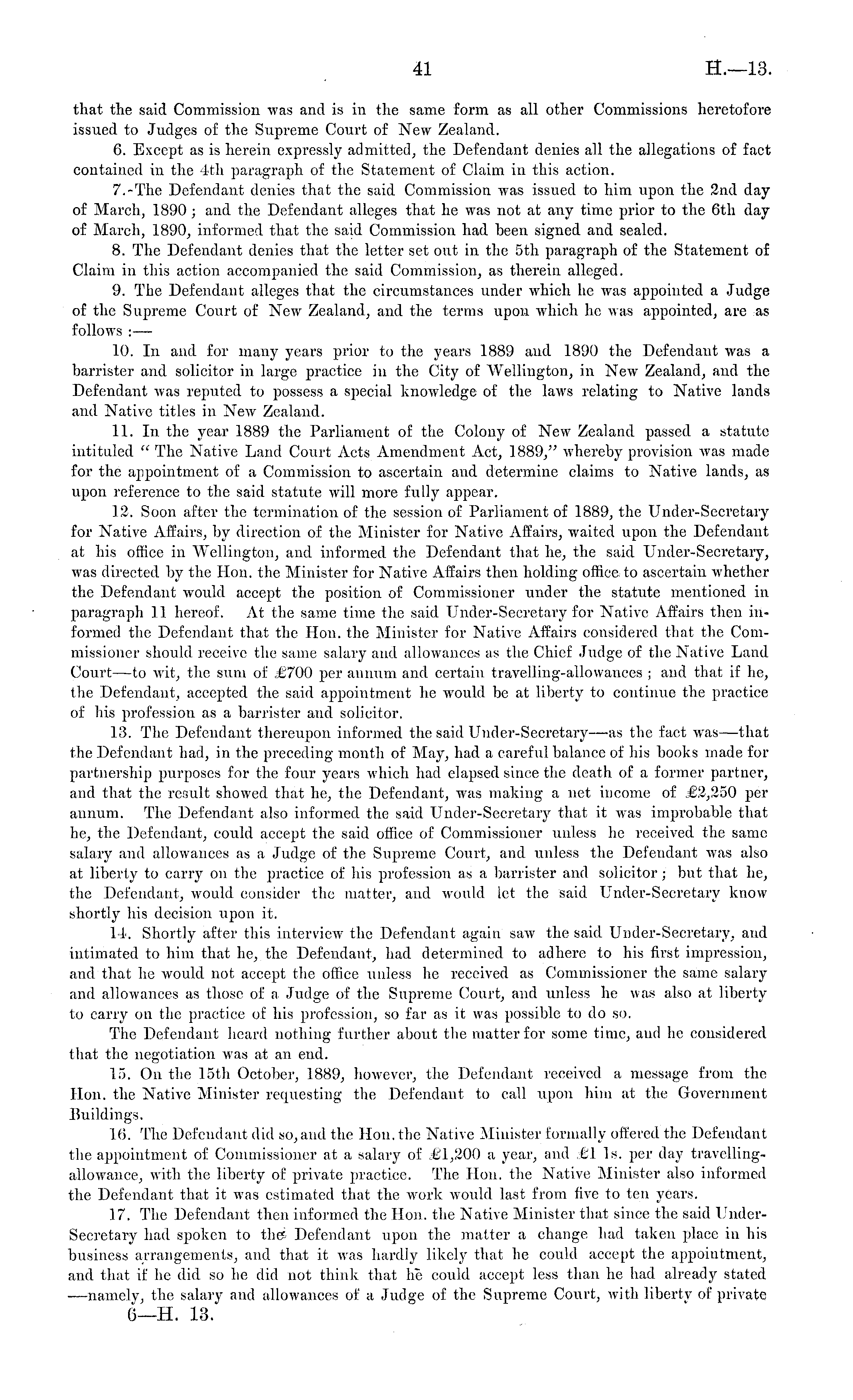 that the said Commission was and is in the same form as all other Commissions heretofore issued to Judges of the Supreme Court of New Zealand. 6. Except as is herein expressly admitted, the Defendant denies all the allegations of fact contained in the 4th paragraph of the Statement of Claim in this action. 7.-The Defendant denies that the said Commission was issued to him upon the 2nd day of March, 1890; and the Defendant alleges that he was not at any time prior to the 6th day of March, 1890, informed that the said Commission had been signed and sealed. 8. The Defendant denies that the letter set out in the sth paragraph of the Statement of Claim in this action accompanied the said Commission, as therein alleged. 9. The Defendant alleges that the circumstances under which he was appointed a Judge of the Supreme Court of New Zealand, and the terms upon which he was appointed, are as follows : — 10. In and for many years prior to the years 1889 and 1890 the Defendant was a barrister and solicitor in large practice in the City of Wellington, in New Zealand, and the Defendant was reputed to possess a special knowledge of the laws relating to Native lands and Native titles in New Zealand. 11. In the year 1889 the Parliament of the Colony of New Zealand passed a statute intituled " The Native Land Court Acts Amendment Act, 1889," whereby provision was made for the appointment of a Commission to ascertain and determine claims to Native lands, as upon reference to the said statute will more fully appear. 12. Soon after the termination of the session of Parliament of 1889, the Under-Secrctary for Native Affairs, by direction of the Minister for Native Affairs, waited upon the Defendant at his office in Wellington, and informed the Defendant that he, the said Under-Secretary, was directed by the Hon. the Minister for Native Affairs then holding office to ascertain whether the Defendant would accept the position of Commissioner under the statute mentioned in paragraph 11 hereof. At the same time the said Under-Secretary for Native Affairs then informed the Defendant that the Hon. the Minister for Native Affairs considered that the Commissioner should receive the same salary and allowances as the Chief Judge of the Native Land Court — to wit, the sum of ,£7OO per annum and certain travelling-allowances ; and that if he, the Defendant, accepted the said appointment he would be at liberty to continue the practice of his profession as a barrister and solicitor. 13. The Defendant thereupon informed the said Under-Secretary —as the fact was —-that the Defendant had, in the preceding month of May, had a careful balance of his books made for partnership purposes for the four years which had elapsed since the death of a former partner, and that the result showed that he, the Defendant, was making a net income of £2,250 per annum. The Defendant also informed the said Under-Secretary that it was improbable that he, the Defendant, could accept the said office of Commissioner unless he received the same salary and allowances as a Judge of the Supreme Court, and unless the Defendant was also at liberty to carry on the practice of his profession as a barrister and solicitor; but that he, the Defendant, would consider the matter, and would let the said Under-Secretary know shortly his decision upon it. 14. Shortly after this interview the Defendant again saw the said Under-Secretary, and intimated to him that he, the Defendant, had determined to adhere to his first impression, and that he would not accept the office unless he received as Commissioner the same salary and allowances as those of a Judge of the Supreme Court, and unless he was also at liberty to carry on the practice of his profession, so far as it was possible to do so. The Defendant heard nothing further about the matter for some time, and he considered that the negotiation was at an end. 15. On the 15th October, 1889, however, the Defendant received a message from the Hon. the Native Minister requesting the Defendant to call upon him at the Government Buildings. 1(5. The Defendant did so,and the Hon. the Native Minister formally offered the Defendant the appointment of Commissioner at a salary of £1,200 a year, and LI Is. per day travellingallowance, with the liberty of private practice. The Hon. the Native Minister also informed the Defendant that it was estimated that the work would last from five to ten years. 17. The Defendant then informed the Hon. the Native Minister that since the said Undersecretary had spoken to the? Defendant upon the matter a change had taken place in his business arrangements, and that it was hardly likely that he could accept the appointment, and that if he did so he did not think that he could accept less than he had already stated -—namely, the salary and allowances of a Judge of the Supreme Court, with liberty of private G—H. 13.