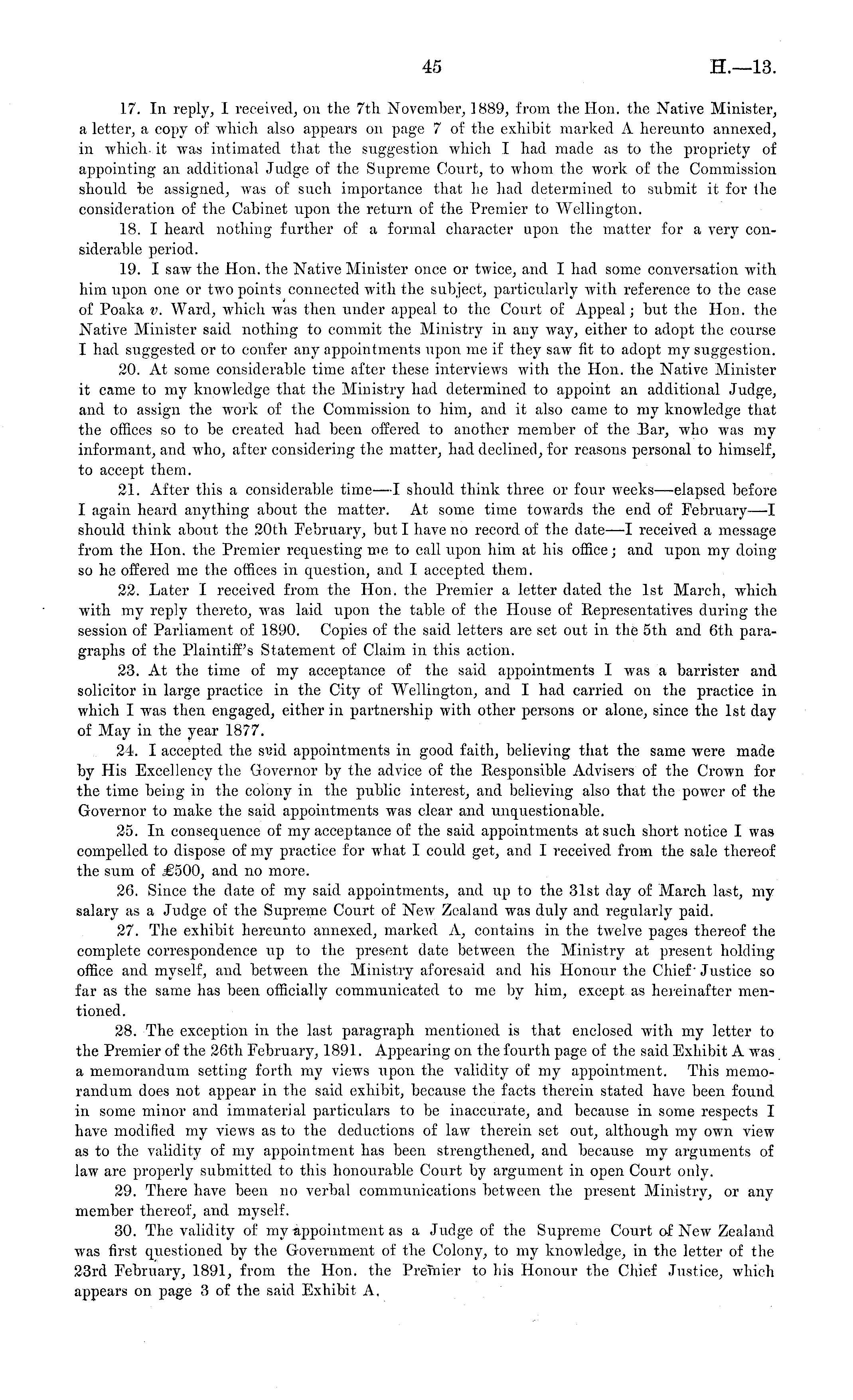 17. In reply, I received, on the 7th November, 1889, from the Hon. the Native Minister, a letter, a copy of which also appears on page 7 of the exhibit marked A hereunto annexed, in which it was intimated that the suggestion which I had made as to the propriety of appointing an additional Judge of the Supreme Court, to whom the work of the Commission should be assigned, was of such importance that he had determined to submit it for the consideration of the Cabinet upon the return of the Premier to Wellington. 18. I heard nothing further of a formal character upon the matter for a very considerable period. 19. I saw the Hon. the Native Minister once or twice, and I had some conversation with him upon one or two points connected with the subject, particularly with reference to the case of Poaka v. Ward, which was then under appeal to the Court of Appeal; but the Hon. the Native Minister said nothing to commit the Ministry in any way, either to adopt the course I had suggested or to confer any appointments upon me if they saw fit to adopt my suggestion. 20. At some considerable time after these interviews with the Hon. the Native Minister it came to my knowledge that the Ministry had determined to appoint an additional Judge, and to assign the work of the Commission to him, and it also came to my knowledge that the offices so to be created had been offered to another member of the Bar, who was my informant, and who, after considering the matter, had declined, for reasons personal to himself, to accept them. 21. After this a considerable time —I should think three or four weeks—elapsed before I again heard anything about the matter. At some time towards the end of February—l should think about the 20th February, but I have no record of the date—l received a message from the Hon. the Premier requesting roe to call upon him at his office; and upon my doing so he offered me the offices in question, and I accepted them. 22. Later I received from the Hon. the Premier a letter dated the Ist March, which with my reply thereto, was laid upon the table of the House of Representatives during the session of Parliament of 1890. Copies of the said letters are set out in the sth and 6th paragraphs of the Plaintiff's Statement of Claim in this action. 23. At the time of my acceptance of the said appointments I was a barrister and solicitor in large practice in the City of Wellington, and I had carried on the practice in which I was then engaged, either in partnership with other persons or alone, since the Ist day of May in the year 1877. 24. I accepted the suid appointments in good faith, believing that the same were made by His Excellency the Governor by the advice of the Responsible Advisers of the Crown for the time being in the colony in the public interest, and believing also that the power of the Governor to make the said appointments was clear and unquestionable. 25. In consequence of my acceptance of the said appointments at such short notice I was compelled to dispose of my practice for what I could get, and I received from the sale thereof the sum of £500, and no more. 26. Since the date of my said appointments, and up to the 31st day of March last, my salary as a Judge of the Supreme Court of New Zealand was duly and regularly paid. 27. The exhibit hereunto annexed, marked A, contains in the twelve pages thereof the complete correspondence up to the present date between the Ministry at present holding office and myself, and between the Ministry aforesaid and his Honour the Chief' Justice so far as the same has been officially communicated to me by him, except as hereinafter mentioned. 28. The exception in the last paragraph mentioned is that enclosed with my letter to the Premier of the 26th February, 1891. Appearing on the fourth page of the said Exhibit A was a memorandum setting forth my views upon the validity of my appointment. This memorandum does not appear in the said exhibit, because the facts therein stated have been found in some minor and immaterial particulars to be inaccurate, and because in some respects I have modified my views as to the deductions of law therein set out, although my own view as to the validity of my appointment has been strengthened, and because my arguments of law are properly submitted to this honourable Court by argument in open Court oidy. 29. There have been no verbal communications between the present Ministry, or any member thereof, and myself. 30. The validity of my appointment as a Judge of the Supreme Court of New Zealand was first questioned by the Government of the Colony, to my knowledge, in the letter of the 23rd February, 1891, from the Hon. the Premier to his Honour the Chief Justice, which appears on page 3 of the said Exhibit A,