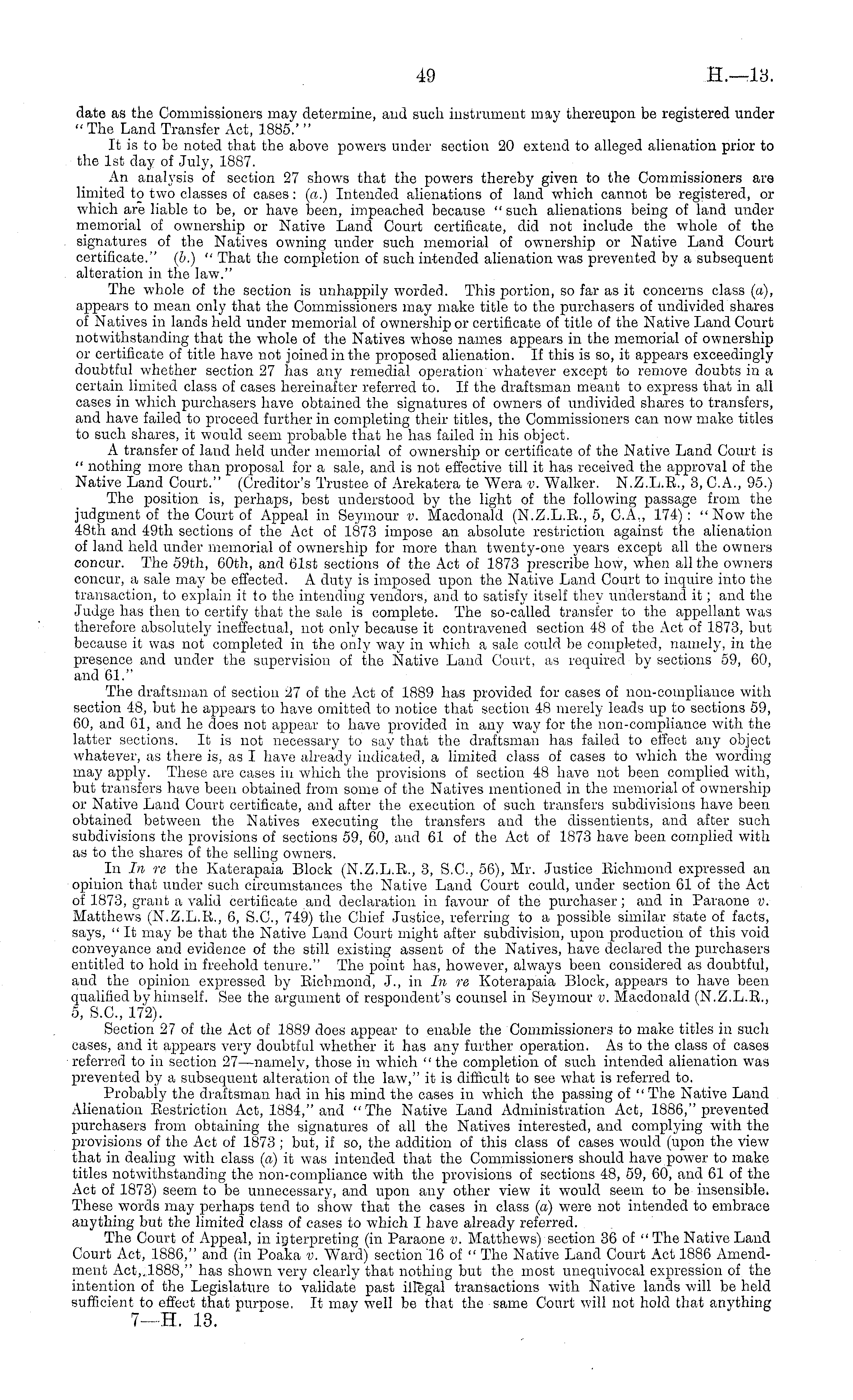 date as the Commissioners may determine, and such instrument may thereupon be registered under " The Land Transfer Act, 1885.' " It is to be noted that the above powers under section 20 extend to alleged alienation prior to the Ist day of July, 1887. An analysis of section 27 shows that the powers thereby given to the Commissioners are limited to two classes of cases: (a.) Intended alienations of land which cannot be registered, or which are liable to be, or have been, impeached because " such alienations being of land under memorial of ownership or Native Land Court certificate, did not include the whole of the signatures of the Natives owning under such memorial of ownership or Native Land Court certificate." (b.) " That the completion of such intended alienation was prevented by a subsequent alteration in the law." The whole of the section is unhappily worded. This portion, so far as it concerns class (a), appears to mean only that the Commissioners may make title to the purchasers of undivided shares of Natives in lands held under memorial of ownership or certificate of title of the Native Land Court notwithstanding that the whole of the Natives whose names appears in the memorial of ownership or certificate of title have not joined in the proposed alienation. If this is so, it appears exceedingly doubtful whether section 27 has any remedial operation whatever except to remove doubts in a certain limited class of cases hereinafter referred to. If the draftsman meant to express that in all cases in which purchasers have obtained the signatures of owners of undivided shares to transfers, and have failed to proceed further in completing their titles, the Commissioners can now make titles to such shares, it would seem probable that he has failed in his object. A transfer of land held under memorial of ownership or certificate of the Native Land Court is " nothing more than proposal for a sale, and is not effective till it has received the approval of the Native Land Court." (Creditor's Trustee of Arekatera te Wera v. Walker. N.Z.L.E., 3, C.A., 95.) The position is, perhaps, best understood by the light of the following passage from the judgment of the Court of Appeal in Seymour v. Macdonald (N.Z.L.E., 5, G.A., 174): " Now the 48th and 49th sections of the Act of 1873 impose an absolute restriction against the alienation of land held under memorial of ownership for more than twenty-one years except all the owners concur. The 59th, 60th, and 61st sections of the Act of 1873 prescribe how, when all the owners concur, a sale may be effected. A duty is imposed upon the Native Land Court to inquire into the transaction, to explain it to the intending vendors, and to satisfy itself they understand it; and the Judge has then to certify that the sale is complete. The so-called transfer to the appellant was therefore absolutely ineffectual, not only because it contravened section 48 of the Act of 1873, but because it was not completed in the only way in which a sale could be completed, namely, in the presence and under the supervision of the Native Laud Court, as required by sections 59, 60, and 61." The draftsman of section 27 of the Act of 1889 has provided for cases of uou-compliance with section 48, but he appears to have omitted to notice that section 48 merely leads up to sections 59, 60, and 61, and he does not appear to have provided in any way for the non-compliance with the latter sections. It is not necessary to say that the draftsman has failed to effect any object whatever, as there is, as I have already indicated, a limited class of cases to which the wording may apply. These are cases in which the provisions of section 48 have not been complied with, but transfers have been obtained from some of the Natives mentioned in the memorial of ownership or Native Land Court certificate, and after the execution of such transfers subdivisions have been obtained between the Natives executing the transfers and the dissentients, and after such subdivisions the provisions of sections 59, 60, and 61 of the Act of 1873 have been complied with as to the shares of the selling owners. In In re the Katerapaia Block (N.Z.L.E., 3, S.C., 56), Mr. Justice Eichmond expressed an opinion that under such circumstances the Native Land Court could, under section 61 of the Act of 1873, grant a valid certificate and declaration in favour of the purchaser; and in Paraone V. Matthews (N.Z.L.E., 6, S.C., 749) the Chief Justice, referring to a possible similar state of facts, says, " It may be that the Native Land Court might after subdivision, upon production of this void conveyance and evidence of the still existing assent of the Natives, have declared the purchasers entitled to hold in freehold tenure." The point has, however, always been considered as doubtful, and the opinion expressed by Eichmond, J., in In re Koterapaia Block, appears to have been qualified by himself. See the argument of respondent's counsel in Seymour v, Macdonald (N.Z.L.E., 5, S.C., 172). Section 27 of the Act of 1889 does appear to enable the Commissioners to make titles in such cases, and it appears very doubtful whether it has any further operation. As to the class of cases referred to in section 27—namely, those in which " the completion of such intended alienation was prevented by a subsequent alteration of the law," it is difficult to see what is referred to. Probably the draftsman had in his mind the cases in which the passing of " The Native Land Alienation Eestrictioii Act, 1884," and " The Native Land Administration Act, 1886," prevented purchasers from obtaining the signatures of all the Natives interested, and complying with the provisions of the Act of 1873 ; but, if so, the addition of this class of cases would (upon the view that in dealing with class (a) it was intended that the Commissioners should have power to make titles notwithstanding the non-compliance with the provisions of sections 48, 59, 60, and 61 of the Act of 
