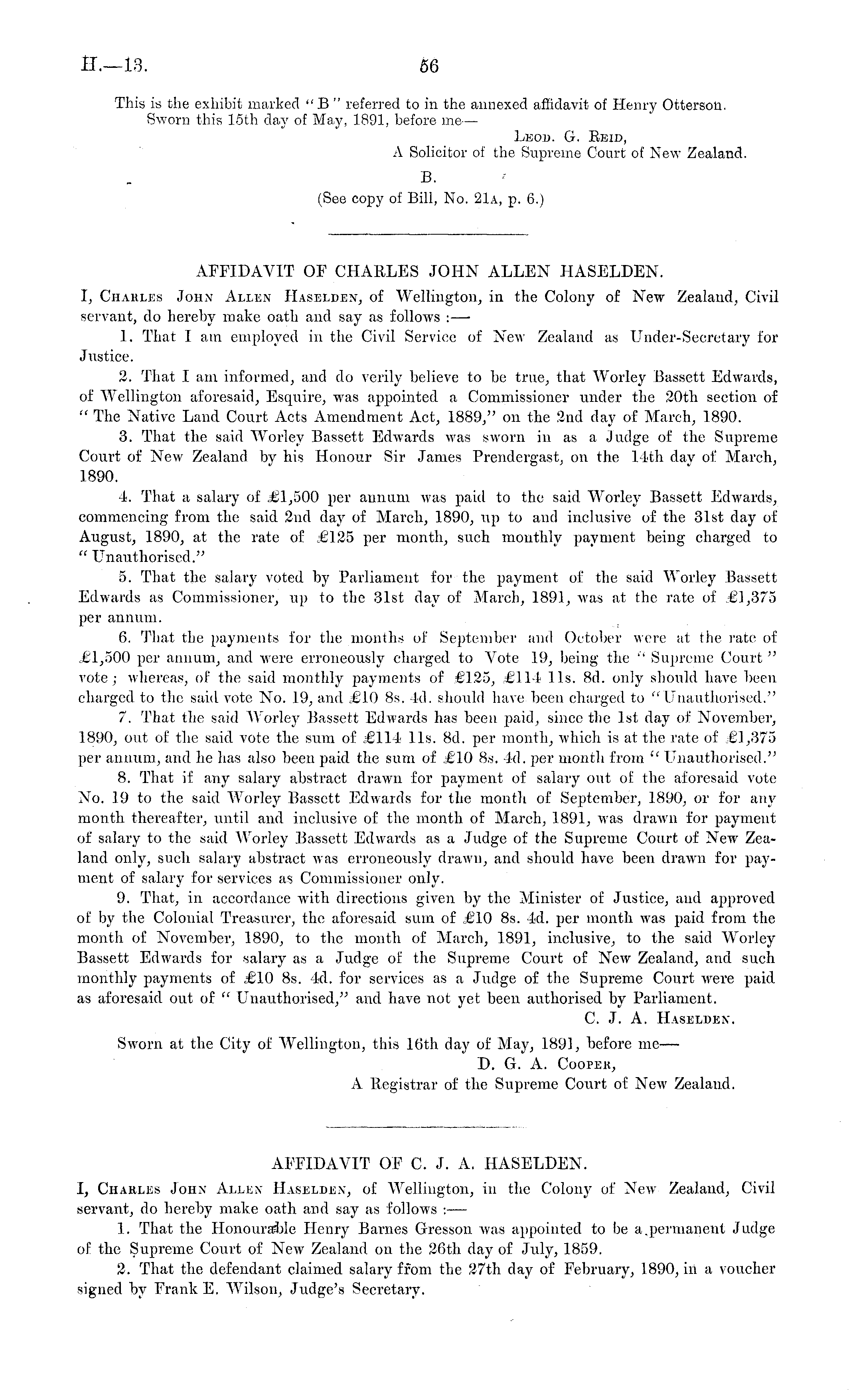 AFFIDAVIT OF CHARLES JOHN ALLEN HASELDEN. I, Charles Johx Allex Haseldex, of Wellington, in the Colony of New Zealand, Civil servant, do hereby make oath and say as follows : — 1. That I am employed in the Civil Service of New Zealand as Under-Seeretary for Justice. 2. That I am informed, and do verily believe to be true, that Worley Bassett Edwards, of Wellington aforesaid, Esquire, was appointed a Commissioner under the 20th section of " The Native Land Court Acts Amendment Act, 1889," on the 2nd clay of March, 1890. 3. That the said Worley Bassett Edwards was sworn in as a Judge of the Supreme Court of New Zealand by his Honour Sir James Prendergast, on the 1 lth day of March, 1890. 4. That a salary of £1,500 per annum was paid to the said Worley Bassett Edwards, commencing from the said 2nd day of March, 1890, up to and inclusive of the 31st day of August, 1890, at the rate of £125 per month, such monthly payment being charged to " Unauthorised." 5. That the salary voted by Parliament for the payment of the said Worley Bassett Edwards as Commissioner, up to the 31st day of March, 1891, was at the rate of €1,375 per annum. 6. That the payments for the months of September and October were at the rate of £1,500 per annum, and were erroneously charged to A rote 19, being the " Supreme Court " vote; whereas, of the said monthly payments of €125, £114 11s. Bd. only should have been charged to the said vote No. 19, and £10 Bs. Id. should have been charged to "Unauthorised." 7. That the said Worley Bassett Edwards has been paid, since the Ist day of November, 1890, out of the said vote the sum of ,€lll lls. Bd. per month, which is at the rate of .€1,375 per annum, and he has also been paid the sum of .£lO Bs. 4d. per month from " Unauthorised." 8. That if any salary abstract drawn for payment of salary out of the aforesaid vote No. 19 to the said Worley Bassett Edwards for the month of September, 1890, or for any month thereafter, until and inclusive of the month of March, 1891, was drawn for payment of salary to the said Worley Bassett Edwards as a Judge of the Supreme Court of New Zealand only, such salary abstract was erroneously drawn, and should have been drawn for payment of salary for services as Commissioner only. 9. That, in accordance with directions given by the Minister of Justice, and approved of by the Colonial Treasurer, the aforesaid sum of £10 Bs. 4d. per month was paid from the month of November, 1890, to the month of March, 1891, inclusive, to the said Worley Bassett Edwards for salary as a Judge of the Supreme Court of New Zealand, and such monthly payments of £10 Bs. 4d. for services as a Judge of the Supreme Court were paid as aforesaid out of " Unauthorised," and have not yet been authorised by Parliament. C. J. A. Haseldex. Sworn at the City of Wellington, this 16th day of May, 1891, before me— D. G. A. Cooper, A Registrar of the Supreme Court of New Zealand.