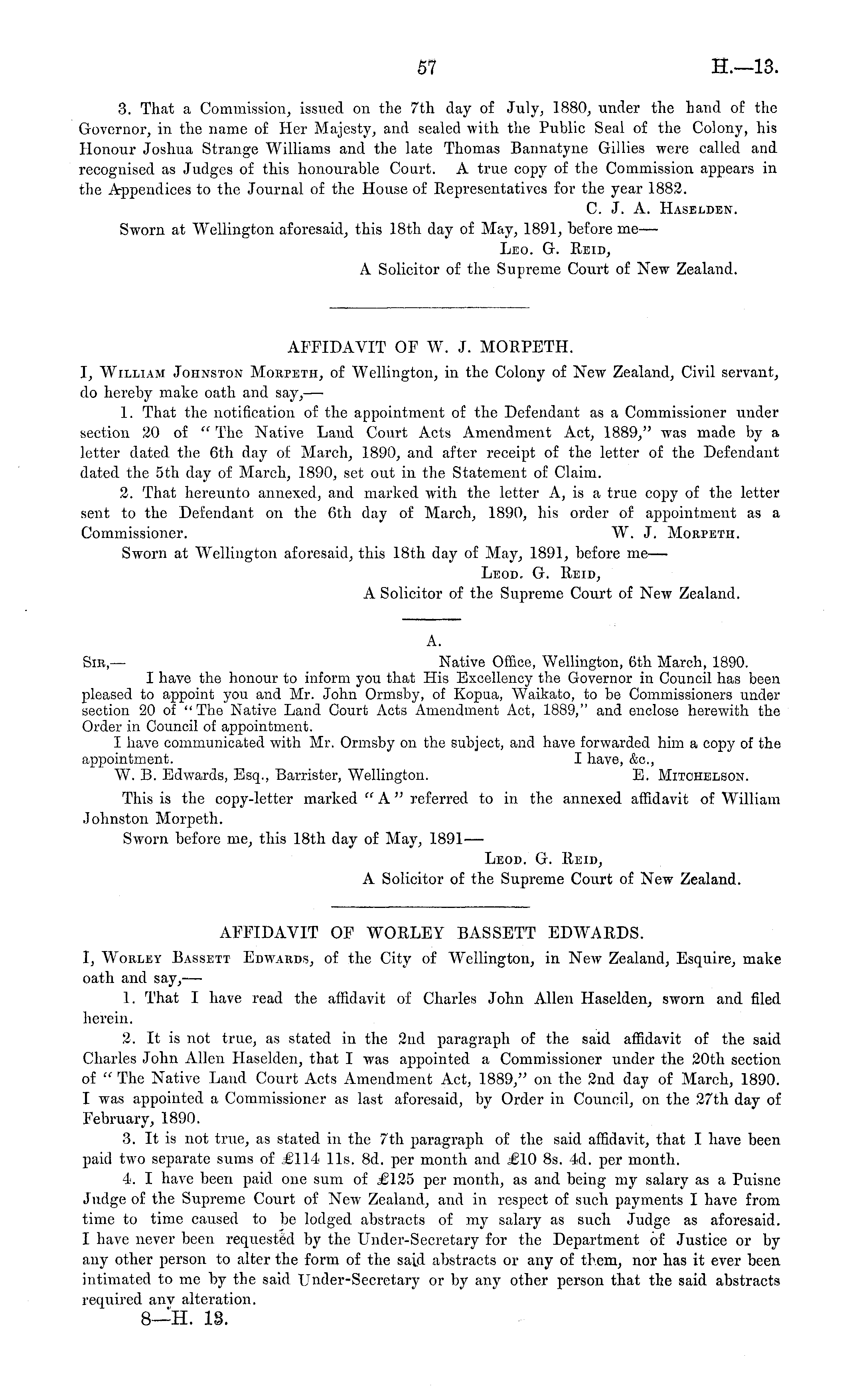 3. That a Commission, issued on the 7th day of July, 1880, under the hand of the Governor, in the name of Her Majesty, and sealed with the Public Seal of the Colony, his Honour Joshua Strange Williams and the late Thomas Bannatyne Gillies were called and recognised as Judges of this honourable Court. A true copy of the Commission appears in the Appendices to the Journal of the House of Representatives for the year 1882. C. J. A. Haselden. Sworn at Wellington aforesaid, this 18th day of May, 1891, before me— Leo. G. Reid, A Solicitor of the Supreme Court of New Zealand.