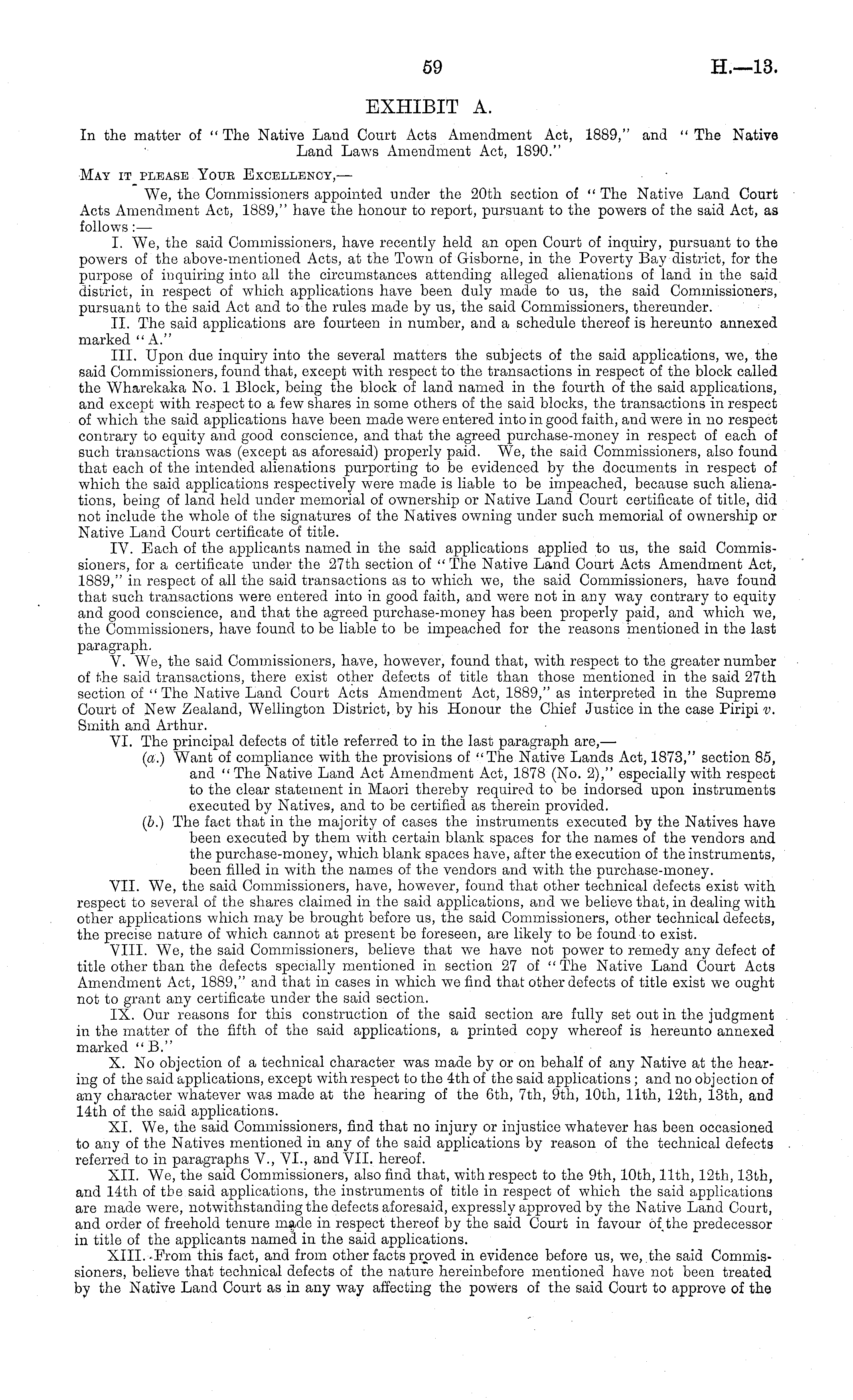 EXHIBIT A. In the matter of " The Native Land Court Acts Amendment Act, 1889," and " The Native Land Laws Amendment Act, 1890." May it please Youk Excellency,— We, the Commissioners appointed under the 20th section of " The Native Land Court Acts Amendment Act, 1889," have the honour to report, pursuant to the powers of the said Act, as follows:— I. We, the said Commissioners, have recently held an open Court of inquiry, pursuant to the powers of the above-mentioned Acts, at the Town of Gisborne, in the Poverty Bay district, for the purpose of inquiring into all the circumstances attending alleged alienations of land in the said district, in respect of which applications have been duly made to us, the said Commissioners, pursuant to the said Act and to the rules made by us, the said Commissioners, thereunder. 11. The said applications are fourteen in number, and a schedule thereof is hereunto annexed marked "A." 111. Upon due inquiry into the several matters the subjects of the said applications, we, the said Commissioners, found that, except with respect to the transactions in respect of the block called the Wharekaka No. 1 Block, being the block of land named in the fourth of the said applications, and except with respect to a few shares in some others of the said blocks, the transactions in respect of which the said applications have been made were entered into in good faith, and were in no respect contrary to equity and good conscience, and that the agreed purchase-money in respect of each of such transactions was (except as aforesaid) properly paid. W re, the said Commissioners, also found that each of the intended alienations purporting to be evidenced by the documents in respect of which the said applications respectively were made is liable to be impeached, because such alienations, being of land held under memorial of ownership or Native Land Court certificate of title, did not include the whole of the signatures of the Natives owning under such memorial of ownership or Native Land Court certificate of title. IV. Each of the applicants named in the said applications applied to us, the said Commissioners, for a certificate under the 27th section of " The Native Land Court Acts Amendment Act, 1889," in respect of all the said transactions as to which we, the said Commissioners, have found that such transactions were entered into in good faith, and were not in any way contrary to equity and good conscience, and that the agreed purchase-money has been properly paid, and which we, the Commissioners, have found to be liable to be impeached for the reasons mentioned in the last paragraph. V. We, the said Commissioners, have, however, found that, with respect to the greater number of the said transactions, there exist other defects of title than those mentioned in the said 27th section of " The Native Land Court Acts Amendment Act, 1889," as interpreted in the Supreme Court of New Zealand, Wellington District, by his Honour the Chief Justice in the case Piripi v. Smith and Arthur. VI. The principal defects of title referred to in the last paragraph are, — (a.) Want of compliance with the provisions of "The Native Lands Act, 1873," section 85, and " The Native Land Act Amendment Act, 1878 (No. 2)," especially with respect to the clear statement in Maori thereby required to be indorsed upon instruments executed by Natives, and to be certified as therein provided. (b.) The fact that in the majority of cases the instruments executed by the Natives have been executed by them with certain blank spaces for the names of the vendors and the purchase-money, which blank spaces have, after the execution of the instruments, been filled in with the names of the vendors and with the purchase-money. VII. We, the said Commissioners, have, however, found that other technical defects exist with respect to several of the shares claimed in the said applications, and we believe that, in dealing with other applications which may be brought before us, the said Commissioners, other technical defects, the precise nature of which cannot at present be foreseen, are likely to be found to exist. VIII. We, the said Commissioners, believe that we have not power to remedy any defect of title other than the defects specially mentioned in section 27 of "The Native Land Court Acts Amendment Act, 1889," and that in cases in which we find that other defects of title exist we ought not to grant any certificate under the said section. IX. Our reasons for this construction of the said section are fully set out in the judgment in the matter of the fifth of the said applications, a printed copy whereof is hereunto annexed marked " B." X. No objection of a technical character was made by or on behalf of any Native at the hearing of the said applications, except with respect to the 4th of the said applications ; and no objection of any character whatever was made at the hearing of the 6th, 7th, 9th, 10th, 11th, 12th, 13th, and 14th of the said applications. XL We, the said Commissioners, find that no injury or injustice whatever has been occasioned to any of the Natives mentioned in any of the said applications by reason of the technical defects referred to in paragraphs V., VI., and VII. hereof. XII. We, the said Commissioners, also find that, with respect to the 9th, 10th, 11th, 12th, 13th, and 14th of the said applications, the instruments of title in respect of which the said applications are made were, notwithstanding the defects aforesaid, expressly approved by the Native Land Court, and order of freehold tenure made in respect thereof by the said Court in favour of the predecessor in title of the applicants named in the said applications. XIII.-Prom this fact, and from other facts proved in evidence before us, we, the said Commissioners, believe that technical defects of the nature hereinbefore mentioned have not been treated by the Native Land Court as in any way affecting the powers of the said Court to approve of t