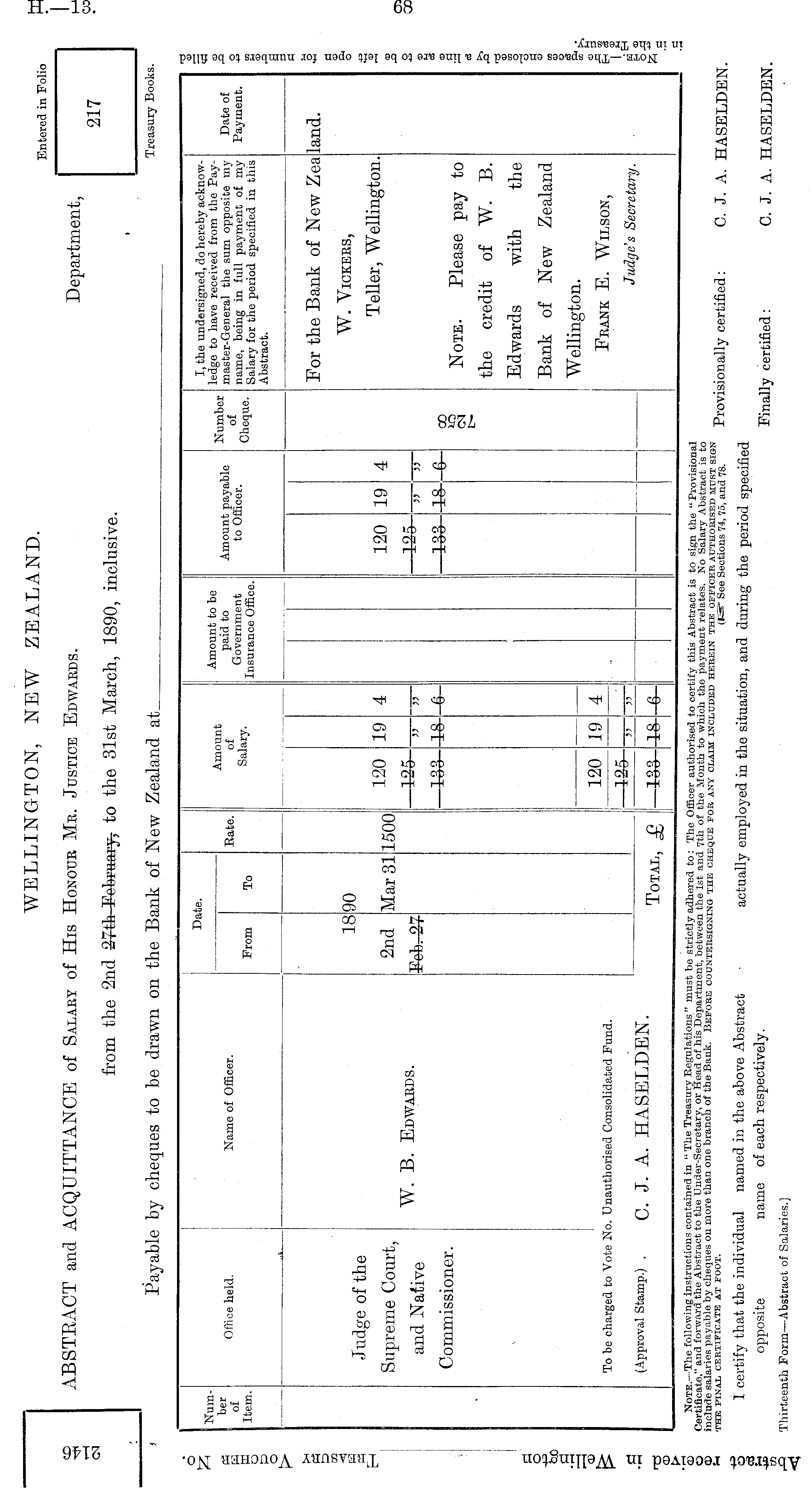 Entered in Folio CO T-H BSTKACT and ACQUITTANCE of Salary of His Honotje Me. Justice Edwakds. Department, from the 2nd &7th Fotettafyj to the 31st March, 1890, inclusive. 217 i Payable by cheques to be drawn on the Bank of New Zealand at Treasury Books. 6 Di ,te. I, the undersigned, do hereby acknowledge to have received from the Pay-master-General the sum opposite my name, being in full payment of my Salary for the period specified in this Abstract. CD O P3 o o > Number of Item. Office held. Name of Officer. Eate. Amc iunt )f Amount to be paid to Government Insurance Office. Amount payable to Officer. Number of Date of Payment. From To Sail iry. Cheque. CO o For the Bank of New Zea land. W. VlCKEBS, O Judge of the 18 90 2nd Teller, Wellington. *4H Supreme Court, Mar 31 1500 120 19 4 120 19 4 o ft a) o a and Native W. B. Edwaeds. —1S§I j> —4Sd- _ J " Commissioner. igg_ -%- -§- CM Note. Please pay to \ the credit of W. B. o -rH Edwards with the Bank of New Zealand ■ To be charged to Vote Ni Wellington. >. Unauthorised Consolidated Fund. 120 ii 4 Fkank E. Wilson, •S (Approval Stamp.) C. J. A. HASELDEN. ?j j) Judge's Secretary. TOTAL, £ !—W -6o ID <