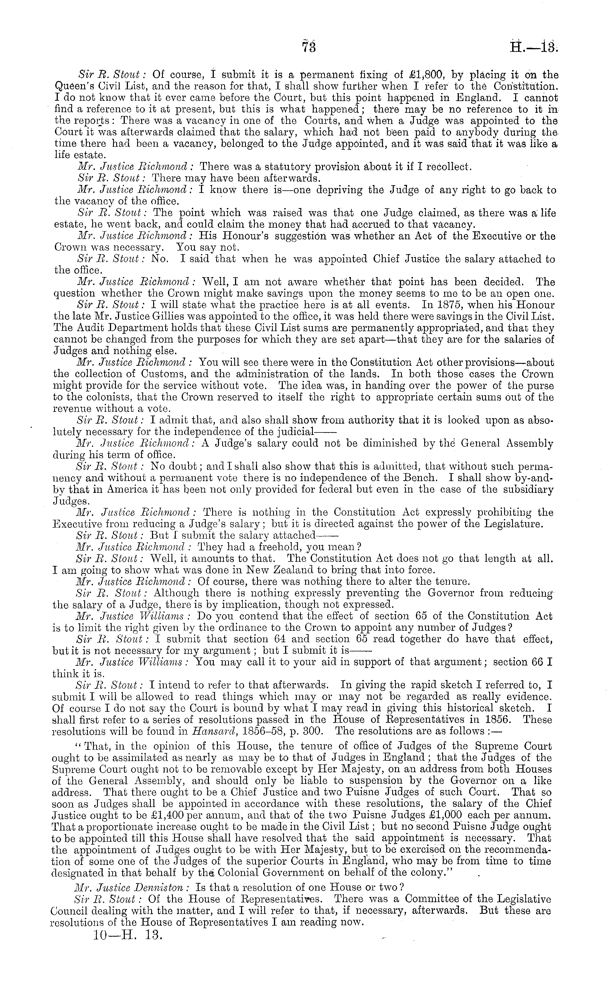 Sir R. Stout: Of course, I submit it is a permanent fixing of £1,800, by placing it on the Queen's Civil List, and the reason for that, I shall show further when I refer to the Constitution. Ido not know that it ever came before the Court, but this point happened in England. I cannot find a reference to it at present, but this is what happened; there may be no reference to it in the reports: There was a vacancy in one of the Courts, and when a Judge was appointed to the Court it was afterwards claimed that the salary, which had not been paid to anybody during the time there had been a vacancy, belonged to the Judge appointed, and it was said that it was like a life estate. Mr. Justice Richmond: There was a statutory provision about it if I recollect. Sir R. Stout: There may have been afterwards. Mr. Justice Richmond: I know there is—one depriving the Judge of any right to go back to the vacancy of the office. Sir R. Stout: The point which was raised was that one Judge claimed, as there was a life estate, he went back, and could claim the money that had accrued to that vacancy. Mr. Justice Richmond: His Honour's suggestion was whether an Act of the Executive or the Crown was necessary. You say not. Sir R. Stout: No. I said that when he was appointed Chief Justice the salary attached to the office. Mr. Justice Richmond : Well, I am not aware whether that point has been decided. The question whether the Crown might make savings upon the money seems to me to be an open one. Sir R. Stout: I will state what the practice here is at all events. In 1875, when his Plonour the late Mr. Justice Gillies was appointed to the office, it was held there were savings in the Civil List. The Audit Department holds that these Civil List sums are permanently appropriated, and that they cannot be changed from the purposes for which they are set apart—that they are for the salaries of Judges and nothing else. Mr. Justice Richmond : You will see there were in the Constitution Act other provisions—about the collection of Customs, and the administration of the lands. In both those cases the Crown might provide for the service without vote. The idea was, in handing over the power of the purse to the colonists, that the Crown reserved to itself the right to appropriate certain sums out of the revenue without a vote. Sir R. Stout: I admit that, and also shall show from authority that it is looked upon as absolutely necessary for the independence of the judicial Mr. Justice Richmond: A Judge's salary could not be diminished by the General Assembly during his term of office. Sir R. Stout: No doubt; and I shall also show that this is admitted, that without such permanency and without a permanent vote there is no independence of the Bench. I shall show by-and-by that in America it has been not only provided for federal but even in the case of the subsidiary Judges. Mr. Justice Richmond : There is nothing in the Constitution Act expressly prohibiting the Executive from reducing a Judge's salary; but it is directed against the power of the Legislature. Sir R. Stout: But 1 submit the salary attached Mr. Justice Richmond : They had a freehold, you mean'? Sir R. Stout: Well, it amounts to that. The Constitution Act does not go that length at all. I am going to show what was done in New Zealand to bring that into force. Mr. Justice Richmond : Of course, there was nothing there to alter the tenure. Sir R. Stout: Although there is nothing expressly preventing the Governor from reducing the salary of a Judge, there is by implication, though not expressed. Mr. Justice Williams : Do you contend that the effect of section 65 of the Constitution Act is to limit the right given by the ordinance to the Crown to appoint any number of Judges ? Sir R. Stout: I submit that section 64 and section 65 read together do have that effect, but it is not necessary for my argument; but I submit it is Mr. Justice Williams : You may call it to your aid in support of that argument; section 66 I think it is. Sir R. Stout: I intend to refer to that afterwards. In giving the rapid sketch I referred to, I submit I will be allowed to read things which may or may not be regarded as really evidence. Of course Ido not say the Court is bound by what I may read in giving this historical sketch. I shall first refer to a series of resolutions passed in the House of Representatives in 1856. These resolutions will be found in Hansard, 1856-58, p. 300. The resolutions are as follows : — " That, in the opinion of this House, the tenure of office of Judges of the Supreme Court ought to be assimilated as nearly as may be to that of Judges in England ; that the Judges of the Supreme Court ought not to be removable except by Her Majesty, on an address from both Houses of the General Assembly, and should only be liable to suspension by the Governor on a like address. That there ought to be a Chief Justice and two Puisne Judges of such Court. That so soon as Judges shall be appointed in accordance with these resolutions, the salary of the Chief Justice ought to be £1,400 per annum, and that of the two Puisne Judges £1,000 each per annum. That a proportionate increase ought to be made in the Civil List; but no second Puisne Judge ought to be appointed till this House shall have resolved that the said appointment is necessary. That the appointment of Judges ought to be with Her Majesty, but to be exercised on the recommendation of some one of the Judges of the superior Courts in England, who may be from time to time designated in that behalf by the Colonial Government on behalf of the colony." Mr. Justice Denniston : Is that a resolution of one House or two? Sir R. Stout: Of the House of Representatives. There was a Committee of the Legislative Council dealing with the matter, and I will refer to that, if necessary, afterwards. But these are resolutions of the House of Representatives I am reading now. 10— H. 13.