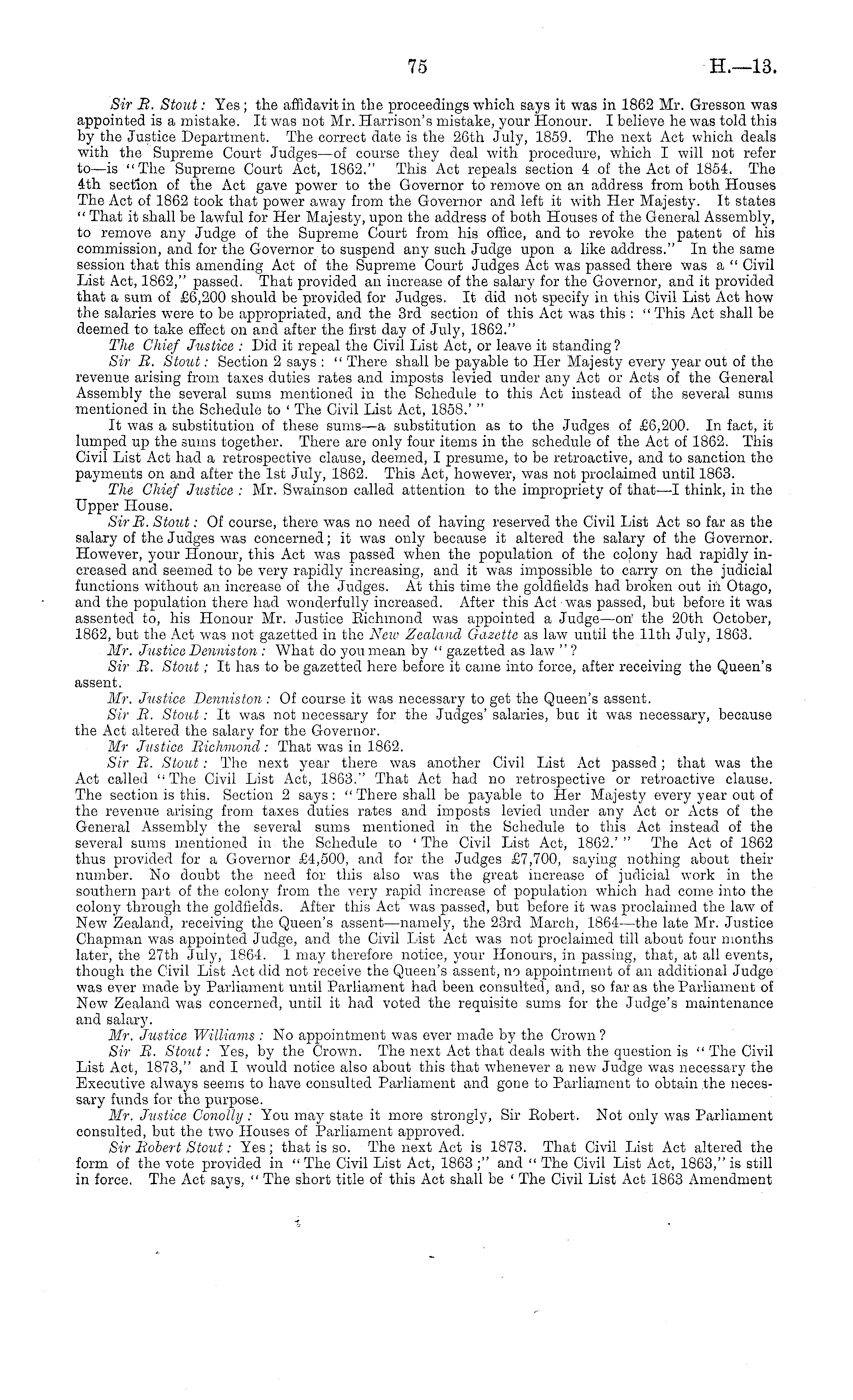 Sir B. Stout: Yes ; the affidavit in the proceedings which says it was in 1862 Mr. Gresson was appointed is a mistake. It was not Mr. Harrison's mistake, your Honour. I believe he was told this by the Justice Department. The correct date is the 26th July, 1859. The next Act which deals with the Supreme Court Judges—of course they deal with procedure, which I will not refer to—is "The Supreme Court Act, 1862." This Act repeals section 4of the Act of 1854. The 4th section of the Act gave power to the Governor to remove on an address from both Houses The Act of 1862 took that power away from the Governor and left it with Her Majesty. It states " That it shall be lawful for Her Majesty, upon the address of both Houses of the General Assembly, to remove any Judge of the Supreme Court from his office, and to revoke the patent of his commission, and for the Governor to suspend any such Judge upon a like address." In the same session that this amending Act of the Supreme Court Judges Act was passed there was a " Civil List Act, 1862," passed. That provided an increase of the salary for the Governor, and it provided that a sum of £6,200 should be provided for Judges. It did not specify in this Civil List Act how the salaries were to be appropriated, and the 3rd section of this Act was this : " This Act shall be deemed to take effect on and after the first day of July, 1862." The Chief Justice : Did it repeal the Civil List Act, or leave it standing? Sir B. Stout: Section 2 says : " There shall be payable to Her Majesty every year out of the revenue arising from taxes duties rates and imposts levied under any Act or Acts of the General Assembly the several sums mentioned in the Schedule to this Act instead of the several sums mentioned in the Schedule to ' The Civil List Act, 1858.' " It was a substitution of these sums —a substitution as to the Judges of £6,200. In fact, it lumped up the sums together. There are only four items in the schedule of the Act of 1862. This Civil List Act had a retrospective clause, deemed, I presume, to be retroactive, and to sanction the payments on and after the Ist July, 1862. This Act, however, was not proclaimed until 1863. The Chief Justice : Mr. Swainson called attention to the impropriety of that—l think, in the Upper House. Sirß. Stout: Of course, there was no need of having reserved the Civil List Act so far as the salary of the Judges was concerned; it was only because it altered the salary of the Governor. However, your Honour, this Act was passed when the population of the colony had rapidly increased and seemed to be very rapidly increasing, and it was impossible to carry on the judicial functions without an increase of the Judges. At this time the goldfields had broken out iii Otago, and the population there had wonderfully increased. After this Act was passed, but before it was assented to, his Honour Mr. Justice Eichmond was appointed a Judge—on the 20th October, 1862, but the Act was not gazetted in the New Zealand Gazette as law until the 11th July, 1863. Mr. Justice Denniston : What do you mean by " gazetted as law " ? Sir B. Stout; It has to be gazetted here before it came into force, after receiving the Queen's assent. Mr. Justice Denniston : Of course it was necessary to get the Queen's assent. Sir B. Stout: It was not necessary for the Judges' salaries, buc it was necessary, because the Act altered the salary for the Governor. Mr Justice Bichmond : That was in 1862. Sir B. Stout: The next year there was another Civil List Act passed; that was the Act called "The Civil List Act, 1863." That Act had no retrospective or retroactive clause. The section is this. Section 2 says : " There shall be payable to Her Majesty every year out of the revenue arising from taxes duties rates and imposts levied under any Act or Acts of the General Assembly the several sums mentioned in the Schedule to this Act instead of the several sums mentioned in the Schedule to ' The Civil List Act, 1862.' ': The Act of 1862 thus provided for a Governor £4,500, and for the Judges £7,700, saying nothing about their number. No doubt the need for this also was the great increase of judicial work in the southern part of the colony from the very rapid increase of population which had come into the colony through the goldfields. After this Act was passed, but before it was proclaimed the law of New Zealand, receiving the Queen's assent—namely, the 23rd March, 1864 —the late Mr. Justice Chapman was appointed Judge, and the Civil List Act was not proclaimed till about four months later, the 27th July, 1864. 1 may therefore notice, your Honours, in passing, that, at all events, though the Civil List Act did not receive the Queen's assent, no appointment of an additional Judge was ever made by Parliament until Parliament had been consulted, and, so far as the Parliament of New Zealand was concerned, until it had voted the requisite sums for the Judge's maintenance and salary. Mr. Justice Williams : No appointment was ever made by the Crown ? Sir B. Stout: Yes, by the Crown. The next Act that deals with the question is " The Civil List Act, 1873," and I would notice also about this that whenever a new Judge was necessary the Executive always seems to have consulted Parliament and gone to Parliament to obtain the necessary funds for the purpose. Mr. Justice Conolly: You may state it more strongly, Sir Eobert. Not only was Parliament consulted, but the two Houses of Parliament approved. Sir Bobert Stout: Yes; that is so. The next Act is 1873. That Civil List Act altered the form of the vote provided in " The Civil List Act, 1863 ;" and " The Civil List Act, 1863," is still in force. The Act says, " The short title of this Act shall be ' The Civil List Act 1863 Amendment