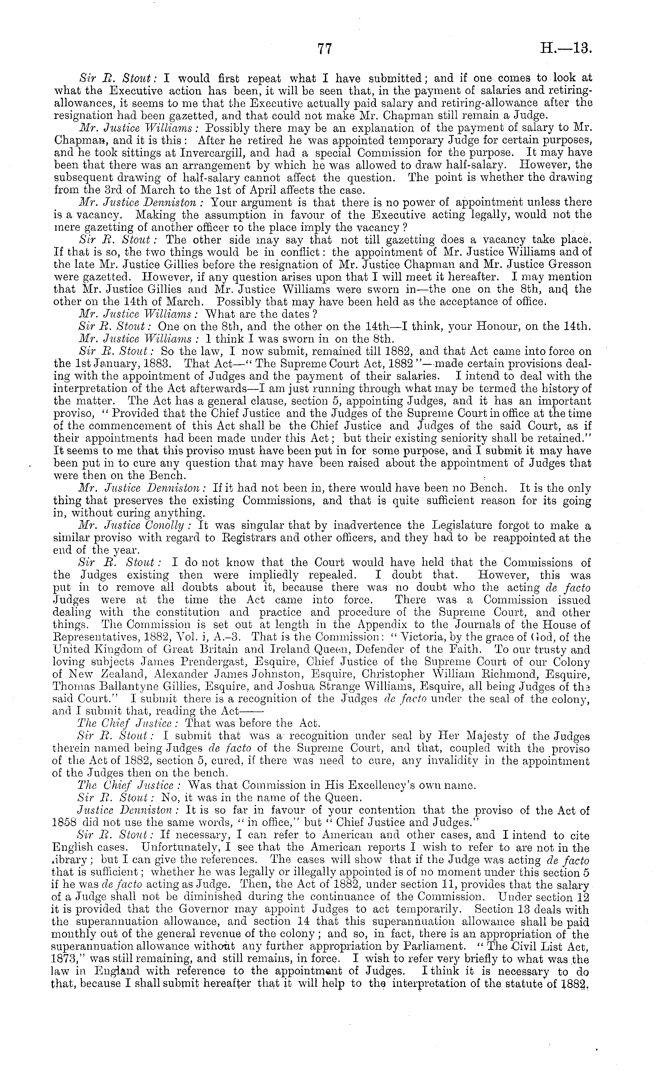Sir B. Stout: I would first repeat what I have submitted; and if one comes to look at what the Executive action has been, it will be seen that, in the payment of salaries and retiringallowances, it seems to me that the Executive actually paid salary and retiring-allowance after the resignation had been gazetted, and that could not make Mr. Chapman still remain a Judge. Mr. Justice Williams : Possibly there may be an explanation of the payment of salary to Mr. ChapmaH, and it is this : After he retired he was appointed temporary Judge for certain purposes, and he took sittings at Invercargill, and had a special Commission for the purpose. It may have been that there was an arrangement by which he was allowed to draw half-salary. However, the subsequent drawing of half-salary cannot affect the question. The point is whether the drawing from the 3rd of March to the Ist of April affects the case. Mr. Justice Denniston : Your argument is that there is no power of appointment unless there is a vacancy. Making the assumption in favour of the Executive acting legally, would not the mere gazetting of another officer to the place imply the vacancy ? Sir B. Stout: The other side may say that not till gazetting does a vacancy take place. If that is so, the two things would be in conflict: the appointment of Mr. Justice Williams and of the late Mr. Justice Gillies before the resignation of Mr. Justice Chapman and Mr. Justice Gresson were gazetted. However, if any question arises upon that I will meet it hereafter. I may mention that Mr. Justice Gillies and Mr. Justice Williams were sworn in—the one on the Bth, and, the other on the 14th of March. Possibly that may have been held as the acceptance of office. Mr. Justice Williams : "What are the dates ? Sir B. Stout: One on the Bth, and the other on the 14th—I think, your Honour, on the 14th. Mr. Justice Williams : 1 think I was sworn in on the Bth. Sir B. Stout: So the law, I now submit, remained till 1882, and that Act came into force on the Ist January, 1883. That Act—" The Supreme Court Act, 1882 " —made certain provisions dealing with the appointment of Judges and the payment of their salaries. I intend to deal with the interpretation of the Act afterwards—l am just running through what may be termed the history of the matter. The Act has a general clause, section 5, appointing Judges, and it has an important proviso, " Provided that the Chief Justice and the Judges of the Supreme Court in office at the time of the commencement of this Act shall be the Chief Justice and Judges of the said Court, as if their appointments had been made under this Act; but their existing seniority shall be retained." It seems to me that this proviso must have been put in for some purpose, and I submit it may have been put in to cure any question that may have been raised about the appointment of Judges that were then on the Bench. Mr. Justice Denniston : If it had not been in, there would have been no Bench. It is the only thing that preserves the existing Commissions, and that is quite sufficient reason for its going in, without curing anything. Mr. Justice Conolly : It was singular that by inadvertence the Legislature forgot to make a similar proviso with regard to Eegistrars and other officers, and they had to be reappointed at the end of the year. Sir B. Stout: Ido not know that the Court would have held that the Commissions of the Judges existing then were impliedly repealed. I doubt that. However, this was put in to remove all doubts about it, because there was no doubt who the acting de facto Judges were at the time the Act came into force. There was a Commission issued dealing with the constitution and practice and procedure of the Supreme Court, and other things. The Commission is set out at length in the Appendix to the Journals of the House of Representatives, 1882, Vol. i, A.-3. That is the Commission: " Victoria, by the grace of (rod, of the United Kingdom of Great Britain and Ireland Queen, Defender of the Faith. To our trusty and loving subjects James Prendergast, Esquire, Chief Justice of the Supreme Court of our Colony of New Zealand, Alexander James Johnston, Esquire, Christopher William Richmond, Esquire, Thomas Ballantyne Gillies, Esquire, and Joshua Strange Williams, Esquire, all being Judges of tli3 said Court." I submit there is a recognition of the Judges de facto under the seal of the colony, and I submit that, reading the Act 'The Chief Justice : That was before the Act. Sir B. Stout: I submit that was a' recognition under seal by Her Majesty of the Judges therein named being Judges de facto of the Supreme Court, and that, coupled with the proviso of the Act of 1882, section 5, cured, if there was need to cure, any invalidity in the appointment of the Judges then on the bench. The Chief Justice : Was that Commission in His Excellency's own name. Sir B. Stout: No, it was in the name of the Queen. Justice Denniston : It is so far in favour of your contention that the proviso of the Act of 1858 did not use the same words, " in office," but " Chief Justice and Judges." Sir B. Stout: If necessary, I can refer to American and other cases, and I intend to cite English cases. Unfortunately, I see that the American reports I wish to refer to are not in the library ; but I can give the references. The cases will show that if the Judge was acting de facto that is sufficient; whether he was legally or illegally appointed is of no moment under this section 5 if he was de facto acting as Judge. Then, the Act of 1882, under section 11, provides that the salary of a Judge shall not be diminished during the continuance of the Commission. Under section 12 it is provided that the Governor may appoint Judges to act temporarily. Section 13 deals with the superannuation allowance, and section 14 that this superannuation allowance shall be paid monthly out of the general revenue of the colony ; and so, in fact, there is an appropriation of the superannua