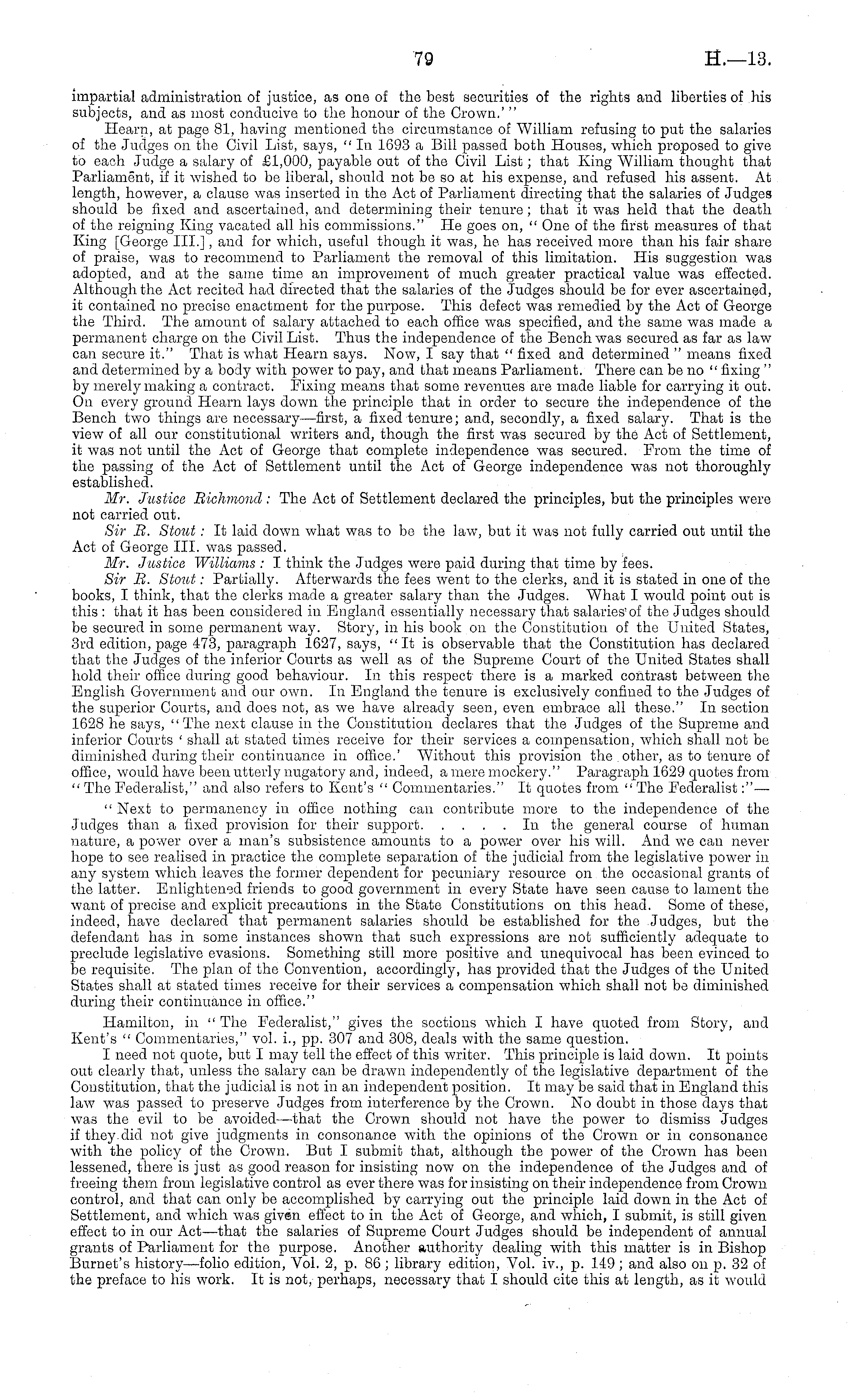 impartial administration of justice, as one of the best securities of the rights and liberties of his subjects, and as most conducive, to the honour of the Crown.'" Hearn, at page 81, having mentioned the circumstance of William refusing to put the salaries of the Judges on the Civil List, says, " In 1693 a Bill passed both Houses, which proposed to give to each Judge a salary of £1,000, payable out of the Civil List; that King William thought that Parliament, if it wished to be liberal, should not be so at his expense, and refused his assent. At length, however, a clause was inserted in the Act of Parliament directing that the salaries of Judges should be fixed and ascertained, and determining their tenure ; that it was held that the death of the reigning King vacated all his commissions." He goes on, " One of the first measures of that King [George lII.], and for which, useful though it was, he has received more than his fair share of praise, was to recommend to Parliament the removal of this limitation. His suggestion was adopted, and at the same time an improvement of much greater practical value was effected. Although the Act recited had directed that the salaries of the Judges should be for ever ascertained, it contained no precise enactment for the purpose. This defect was remedied by the Act of George the Third. The amount of salary attached to each office was specified, and the same was made a permanent charge on the Civil List. Thus the independence of the Bench was secured as far as law can secure it." That is what Hearn says. Now, I say that " fixed and determined " means fixed and determined by a body with power to pay, and that means Parliament. There can be no " fixing " by merely making a contract. Fixing means that some revenues are made liable for carrying it out. On every ground Hearn lays down the principle that in order to secure the independence of the Bench two things are necessary—first, a fixed tenure; and, secondly, a fixed salary. That is the view of all our constitutional writers and, though the first was secured by the Act of Settlement, it was not until the Act of George that complete independence was secured. Prom the time of the passing of the Act of Settlement until the Act of George independence was not thoroughly established. Mr. Justice Richmond : The Act of Settlement declared the principles, but the principles were not carried out. Sir B, Stout: It laid clown what was to be the law, but it was not fully carried out until the Act of George 111. was passed. Mr. Justice Williams : I think the Judges were paid during that time by fees. Sir E. Stout: Partially. Afterwards the fees went to the clerks, and it is stated in one of the books, I think, that the clerks made a greater salary than the Judges. What I would point out is this : that it has been considered in England essentially necessary that salaries-of the Judges should be secured in some permanent way. Story, in his book on the Constitution of the United States, 3rd edition, page 473, paragraph 1627, says, "It is observable that the Constitution has declared that the Judges of the inferior Courts as well as of the Supreme Court of the United States shall hold their office during good behaviour. In this respect there is a marked contrast between the English Government and our own. In England the tenure is exclusively confined to the Judges of the superior Courts, and does not, as we have already seen, even embrace all these." In section 1628 he says, "The next clause in the Constitution declares that the Judges of the Supreme and inferior Courts ' shall at stated times receive for their services a compensation, which shall not be diminished during their continuance in office.' Without this provision the other, as to tenure of office, would have been utterly nugatory and, indeed, a mere mockery." Paragraph 1629 quotes from " The Federalist," and also refers to Kent's " Commentaries." It quotes from " The Federalist:"— " Next to permanency in office nothing can contribute more to the independence of the Judges than a fixed provision for their support In the general course of human nature, a power over a man's subsistence amounts to a power over his will. And we can never hope to see realised in practice the complete separation of the judicial from the legislative power in any system which leaves the former dependent for pecuniary resource on the occasional grants of the latter. Enlightened friends to good government in every State have seen cause to lament the want of precise and explicit precautions in the State Constitutions on this head. Some of these, indeed, have declared that permanent salaries should be established for the Judges, but the defendant has in some instances shown that such expressions are not sufficiently adequate to preclude legislative evasions. Something still more positive and unequivocal has been evinced to be requisite. The plan of the Convention, accordingly, has provided that the Judges of the United States shall at stated times receive for their services a compensation which shall not be diminished during their continuance in office." Hamilton, in " The Federalist," gives the sections which I have quoted from Story, and Kent's " Commentaries," vol. i., pp. 307 and 308, deals with the same question. I need not quote, but I may tell the effect of this writer. This principle is laid down. It points out clearly that, unless the salary can be drawn independently of the legislative department of the Constitution, that the judicial is not in an independent position. It may be said that in England this law was passed to preserve Judges from interference by the Crown. No doubt in those days that was the evil to be avoided—that the Crown should not have the power to dismiss Judges if they, did not give judgments in consonance with the opinions of the Crown or in consonance with the policy of the Crown. But I submit that, although the power of the Crown has been lessened, the