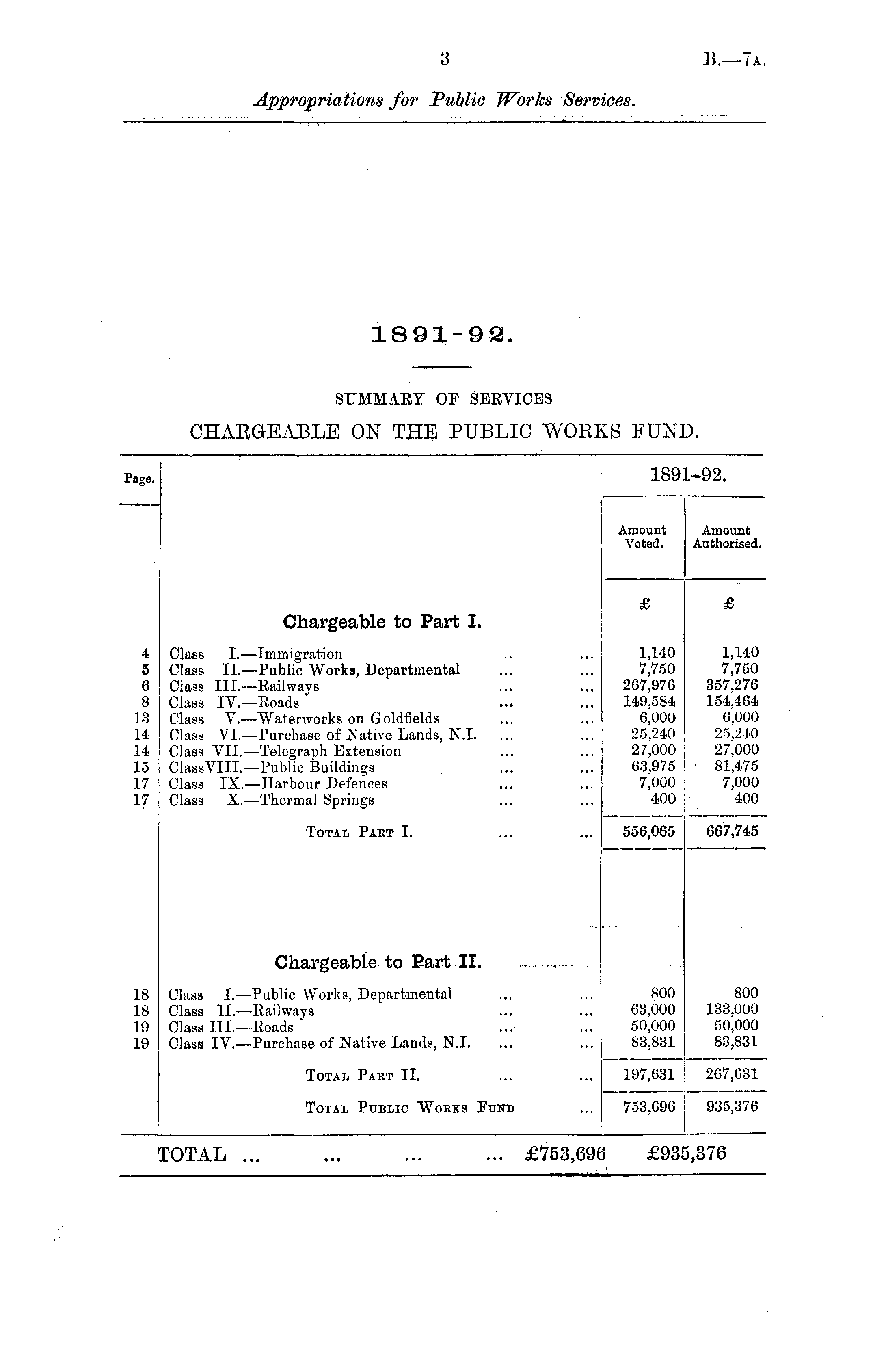 1891-92. '»ge. Amount Voted. Amount Authorised. £ £ Chargeable to Part I. 4 5 6 8 13 14 1-1 15 17 17 Class I.—Immigration Class II.—Public Works, Departmental Class III.—Bailways Class IV.—lioads Class V. —Waterworks on Goldfields Class VI.—Purchase of Native Lands, N.I. Class VII.—Telegraph Extension ClassVIII.—Public Buildings Class IX.—Harbour Defences Class X.—Thermal Springs 1,140 7,750 267,976 149,584 6,000 25,240 27,000 63,975 7,000 400 1,140 7,750 357,276 154,464 6,000 25,240 27,000 81,475 7,000 400 Total Paet I. 556,065 667,745 Chargeable to Part II. Class I. —Public Works, Departmental Class II. —Kail ways Class III. —Koads Class IV.—Purchase of Native Lands, N.I. 800 133,000 50,000 83,831 18 18 19 19 800 63,000 50,000 83,831 Total Past II. 197,631 267,631 Total Public Woeks Fund 753,696 935,376 'OTAL £753,69 £93 ,376