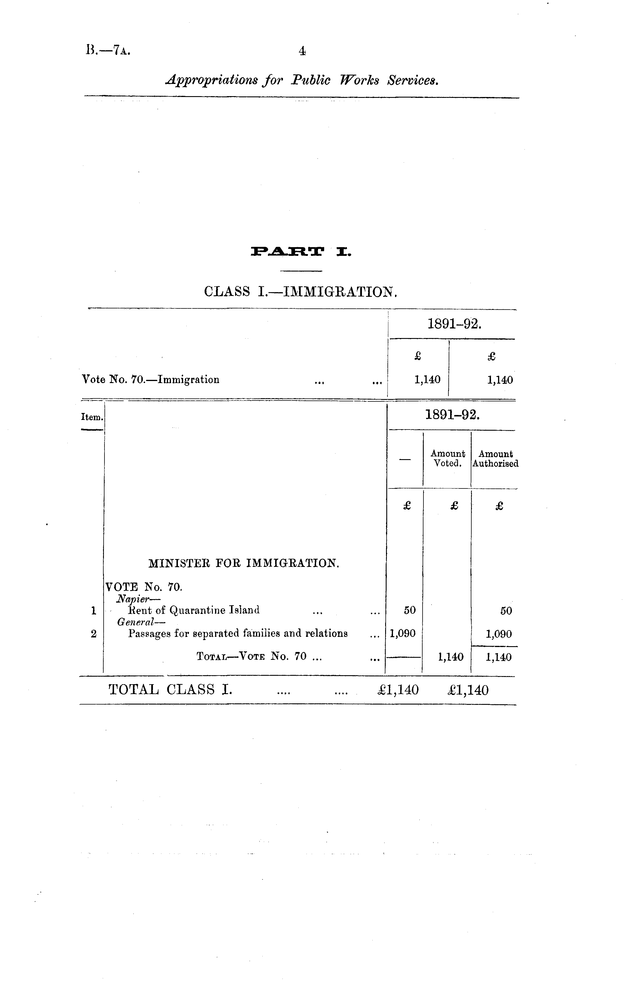 1891-92. No. 70.—Immigration 1,140 £ 1,140 "ot. Item. 1891-9 Amount Voted. Amount Authorised £ MINISTER FOE IMMIGRATION. VOTE No. 70. Napier — Kent of Quarantine Island General — Passages for separated families and relations 50 l 50 2 1,090 1,090 Total—Vote No. 70 ... 1,140 1,140 TOTAL CLASS I. 1,140 £1, 40