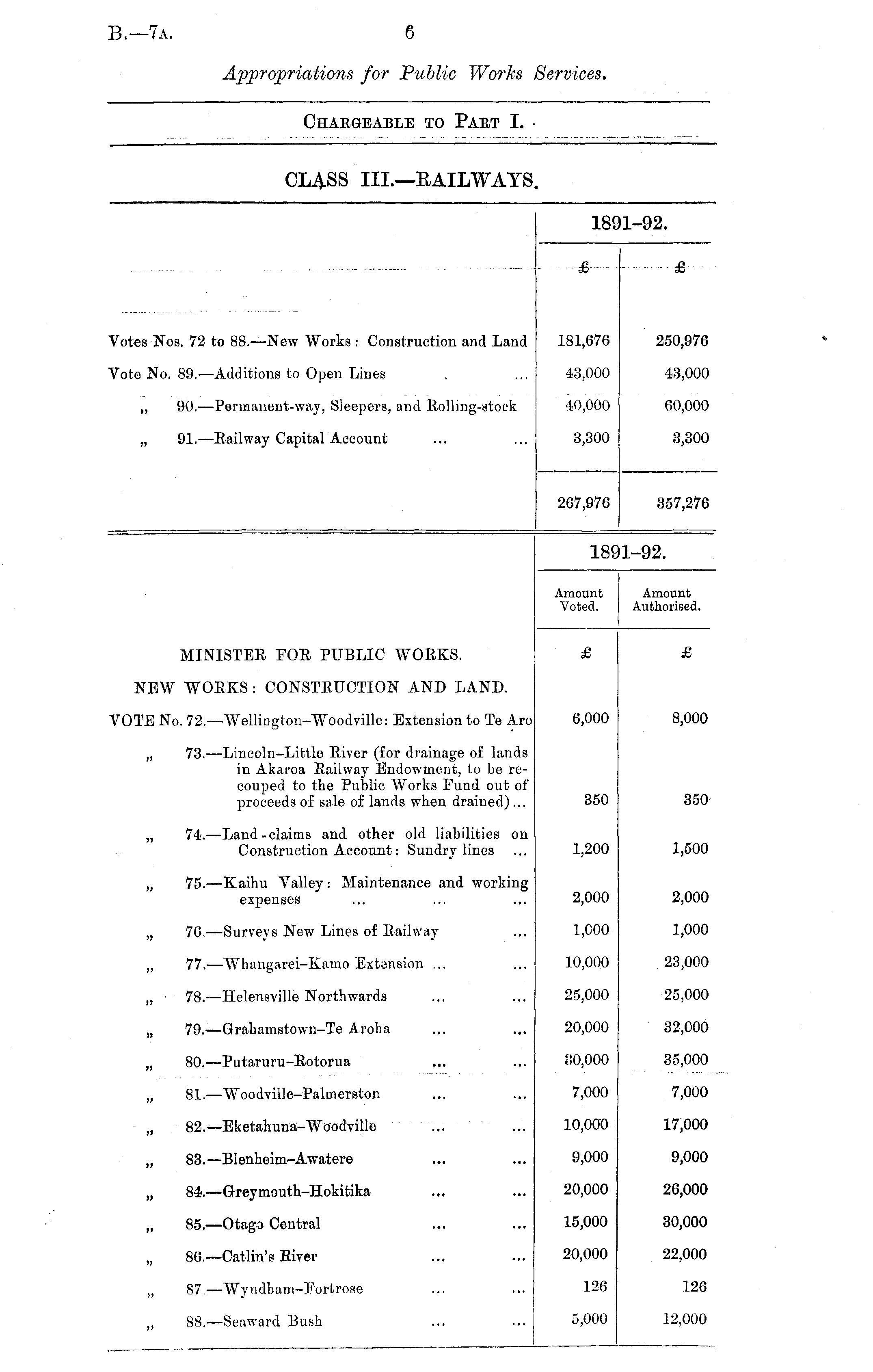 1891-92. ■-£■ £ otes Nos. 72 to 88. —New Works : Construction and Land 181,676 250,976 "ote No. 89.—Additions to Open Lines 43,000 43,000 „ 90. —Permanent-way, Sleepers, and Eolling-stock 40,000 60,000 „ 91.—Railway Capital Account 3,300 8,300 267,976 357,276 18' 1-92. Amount Voted. Amount Authorised. MINISTEE FOR PUBLIC WORKS. £ £ NEW WORKS : CONSTRUCTION AND LAND. 6,000 8,000 OTE No. 72.—Welliogton-Woodville: Extension to Te Aro „ 73.—Lincoln-Little River (for drainage of lands in Akai-oa Railway Endowment, to be recouped to the Public Works Fund out of proceeds of sale of lands when drained) ... 350 350 „ 74. —Land-claims and other old liabilities on Construction Account: Sundry lines 1,200 1,500 „ 75.—Kaihu Valley: Maintenance and working 2,000 2,000 expenses „ 76. —Surveys New Lines of Railway 1,000 1,000 „ 77. —Whangarei-Kamo Extension ... 10,000 23,000 „ 78. —Helensville Northwards 25,000 25,000 „ 79.—Grahamstown-Te Aroha 20,000 32,000 „ 80. —Putaruru-Rotorua 30,000 35,000 „ 81. —Woodville-Palmerston 7,000 7,000 „ 82.—Eketahuna-Woodville 10,000 17,000 „ 83.—Blenheim-Awatere 9,000 9,000 „ 84. —G-reymouth-Hokitika 20,000 26,000 „ 85. —Otago Central 15,000 30,000 „ 86.—Catlin's River 20,000 22,000 „ 87. —Wyndham-Fortrose 126 126 „ 88.—Seaward Bush 5,000 12,000