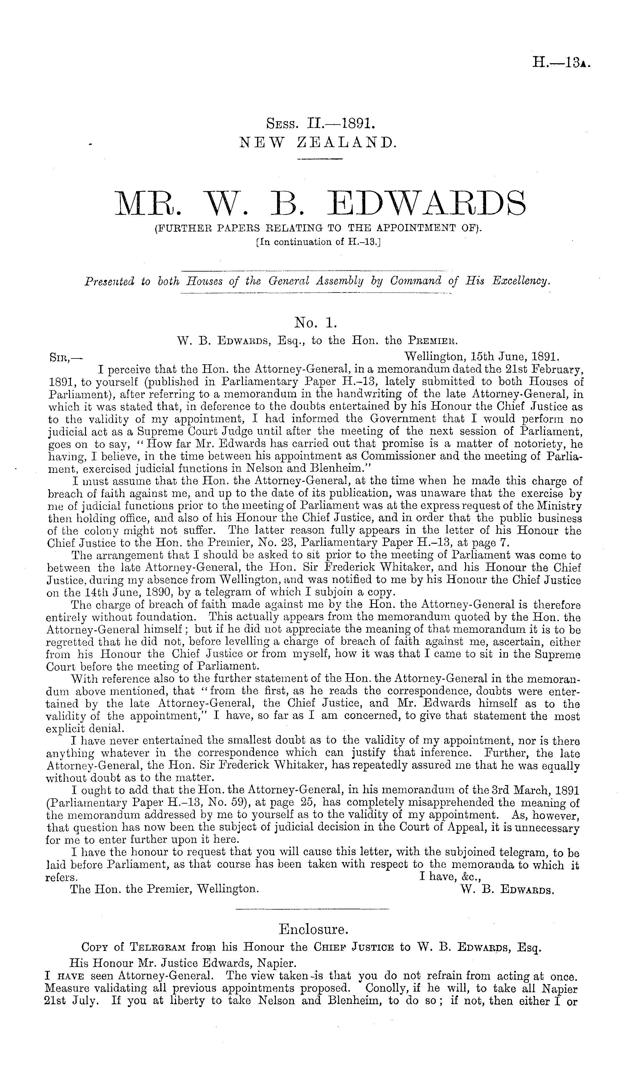 No. 1. W. B. Edwabds, Esq., to the Hon. the Pbemiek. Sir,— Wellington, 15th June, 1891. I pei"ceive that the Hon. the Attorney-General, in a memorandum dated the 21st February, 1891, to yourself (published in Parliamentary Paper H.-13, lately submitted to both Houses of Parliament), after referring to a memorandum in the handwriting of the late Attorney-General, in which it was stated that, in deference to the doubts entertained by his Honour the Chief Justice as to the validity of my appointment, I had informed the Government that I would perform no judicial act as a Supreme Court Judge until after the meeting of the next session of Parliament, goes on to say, " How far Mr. Edwards has carried out that promise is a matter of notoriety, he having, I believe, in the time between his appointment as Commissioner and the meeting of Parliament, exercised judicial functions in Nelson and Blenheim." I must assume that the Hon. the Attorney-General, at the time when he made this charge of breach of faith against me, and up to the date of its publication, was unaware that the exercise by me of judicial functions prior to the meeting of Parliament was at the express request of the Ministry then holding office, and also of his Honour the Chief Justice, and in order that the public business of the colony might not suffer. The latter reason fully appears in the letter of his Honour the Chief Justice to the Hon. the Premier, No. 23, Parliamentary Paper H.-13, at page 7. The arrangement that I should be asked to sit prior to the meeting of Parliament was come to between the late Attorney-General, the Hon. Sir Frederick Whitaker, and his Honour the Chief Justice, during my absence from Wellington, and was notified to me by his Honour the Chief Justice on the 14th June, 1890, by a telegram of which I subjoin a copy. The charge of breach of faith made against me by the Hon. the Attorney-General is therefore entirely without foundation. This actually appears from the memorandum quoted by the Hon. the Attorney-General himself; but if he did not appreciate the meaning of that memorandum it is to be regretted that he did not, before levelling a charge of breach of faith against me, ascertain, either from his Honour the Chief Justice or from myself, how it was that I came to sit in the Supreme Court before the meeting of Parliament. With reference also to the further statement of the Hon. the Attorney-General in the memorandum above mentioned, that "from the first, as he reads the correspondence, doubts were entertained by the late Attorney-General, the Chief Justice, and Mr. Edwards himself as to the validity of the appointment," I have, so far as I am concerned, to give that statement the most explicit denial. I have never entertained the smallest doubt as to the validity of my appointment, nor is there anything whatever in the correspondence which can justify that inference. Further, the late Attorney-General, the Hon. Sir Frederick Whitaker, has repeatedly assured me that he was equally without doubt as to the matter. I ought to add that the Hon. the Attorney-General, in his memorandum of the 3rd March, 1891 (Parliamentary Paper H.-13, No. 59), at page 25, has completely misapprehended the meaning of the memorandum addressed by me to yourself as to the validity of my appointment. As, however, that question has now been the subject of judicial decision in the Court of Appeal, it is unnecessary for me to enter further upon it here. I have the honour to request that you will cause this letter, with the subjoined telegram, to be laid before Parliament, as that course has been taken with respect to the memoranda to which it refers. I have, &c, The Hon. the Premier, Wellington. W. B. Edwards.