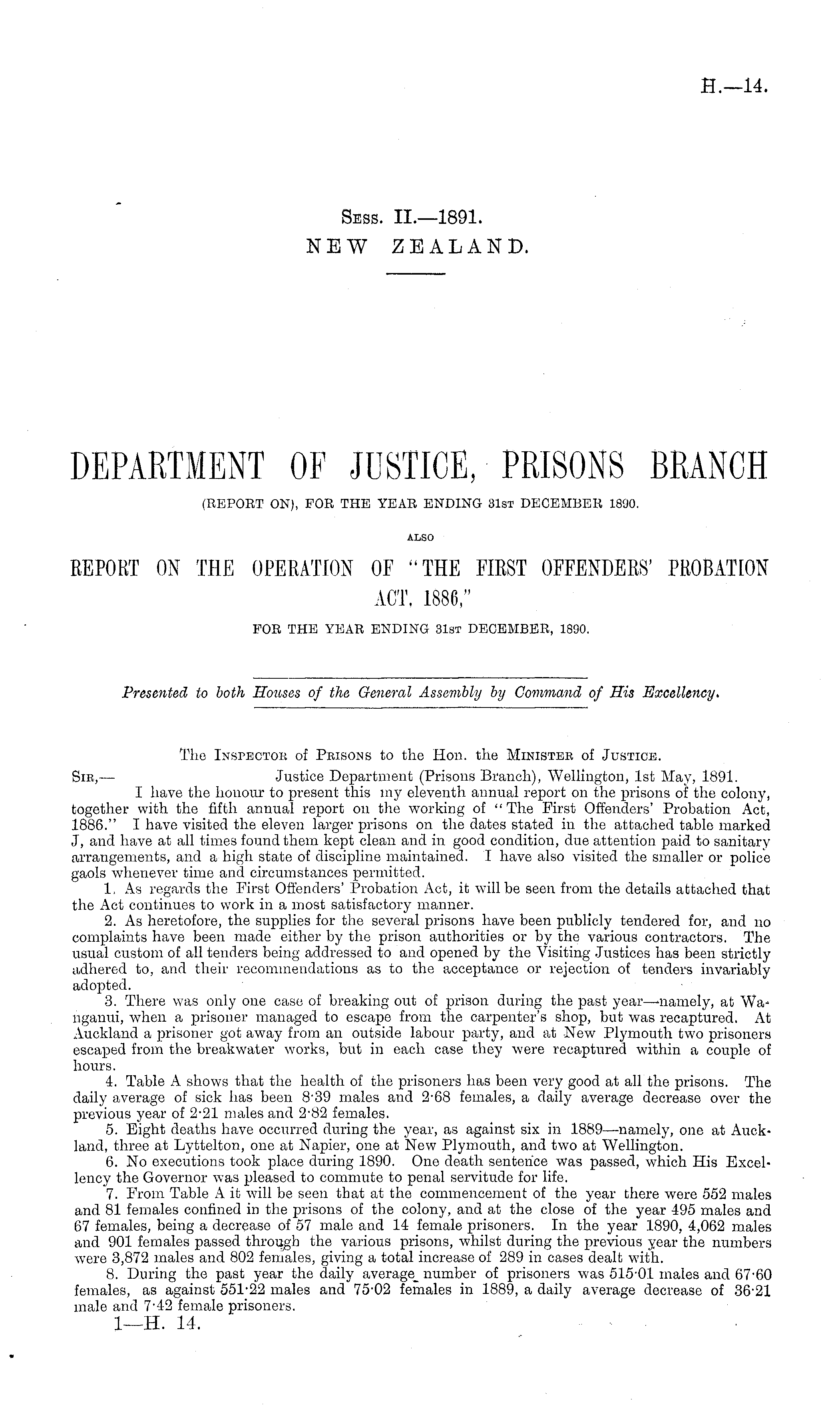 The Inspector of Prisons to the Hon. the Ministeb of Justice. Sic, — Justice Department (Prisons Branch), Wellington, Ist May, 1891. I have the honour to present this my eleventh annual report on the prisons of the colony, together with the fifth annual report on the working of " The First Offenders' Probation Act, 1886." I have visited the eleven larger prisons on the dates stated in the attached table marked J, and have at all times found them kept clean and in good condition, due attention paid to sanitary arrangements, and a high state of discipline maintained. I have also visited the smaller or police gaols whenever time and circumstances permitted. 1. As regards the First Offenders' Probation Act, it will be seen from the details attached that the Act continues to work in a most satisfactory manner. 2. As heretofore, the supplies for the several prisons have been publicly tendered for, and no complaints have been made either by the prison authorities or by the various contractors. The usual custom of all tenders being addressed to and opened by the Visiting Justices has been strictly adhered to, and their recommendations as to the acceptance or rejection of tenders invariably adopted. 3. There was only one case of breaking out of prison during the past year—-namely, at Wanganui, when a prisoner managed to escape from the carpenter's shop, but was recaptured. At Auckland a prisoner got away from an outside labour party, and at New Plymouth two prisoners escaped from the breakwater works, but in each case they were recaptured within a couple of hours. 4. Table A shows that the health of the prisoners has been very good at all the prisons. The daily average of sick has been 839 males and 2-68 females, a daily average decrease over the previous year of 2-21 males and 2-82 females. 5. Eight deaths have occurred during the year, as against six in 1889—namely, one at Auckland, three at Lyttelton, one at Napier, one at "New Plymouth, and two at Wellington. 6. No executions took place during 1890. One death sentence was passed, which His Excellency the Governor was pleased to commute to penal servitude for life. 7. From Table A it will be seen that at the commencement of the year there were 552 males and 81 females confined in the prisons of the colony, and at the close of the year 495 males and 67 females, being a decrease of 57 male and 14 female prisoners. In the year 1890, 4,062 males and 901 females passed through the various prisons, whilst during the previous year the numbers were 3,872 males and 802 females, giving a total increase of 289 in cases dealt with. 8. During the past year the daily average number of prisoners was 51501 males and 6760 females, as against 55122 males and 7502 females in 1889, a daily average decrease of 3621 male and 742 female prisoners. I—H. 14.