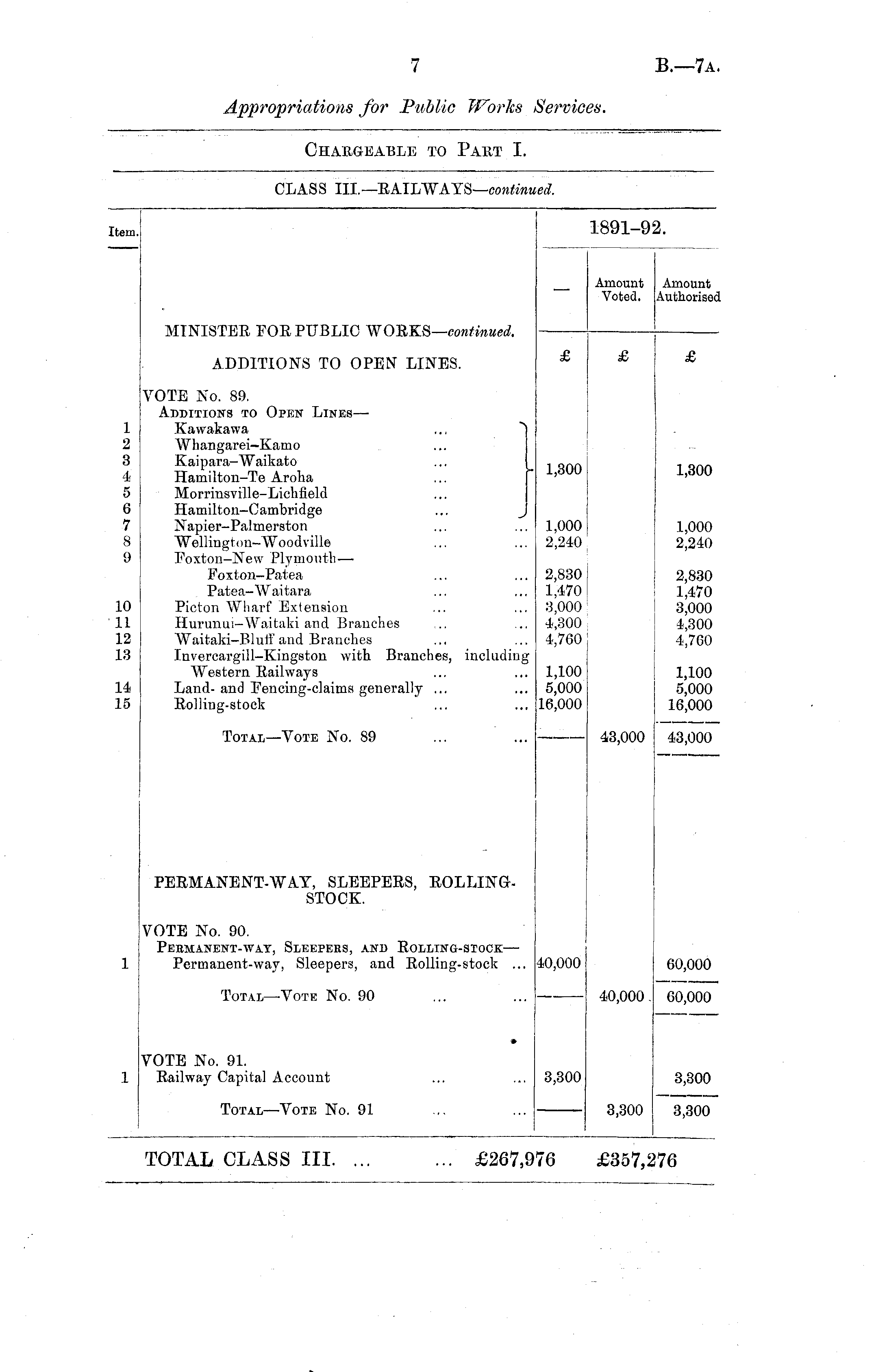1891-9 Item. Amount Voted. Amount Authorise* MINISTER FOE PUBLIC WORKS— continued. ADDITIONS TO OPEN LINES. 1 2 3 4 5 6 7 8 i) VOTE No. 89. Additions to Open Lines — Kawakawa Whangarei—Kamo Kaipara-Waikato Hamilton-Te Aroha Morrinsville-Lickfield Hamilton-Cambridge ... J Napier-Palmerston Wellington-Woodville Foxton-New Plymouth— Foxton-Patea Patea-Waitara Picton Wharf Extension Hurunui—Waitaki and Branches Waitaki-Bluii' and Branches Invercargill-Kingston with Branches, including Western Railways Land- and Fencing-claims generally ... Rolling-stock 1,300 1,000 2,240 1,300 1,000 2,240 10 11 12 13 2,830 1,470 3,000 4,300 4,760 2,830 1,470 3,000 4,300 4,760 14 15 1,100 5,000 16,000 1,100 5,000 16,000 Total—Vote No. 89 43,000 43,000 PERMANENT-WAY, SLEEPERS, ROLLINGSTOCK. VOTE No. 90. Pebmanent-way, Sleepers, and Rolling-stock— Permanent-way, Sleepers, and Rolling-stock ... 40,000 60,000 Total—Vote No. 90 40,000 60,000 • VOTE No. 91. Railway Capital Account 3,300 1 3,300 Total—Vote No. 91 3,300 3,300 TOTAL CLASS III. £267,976 £357, 76