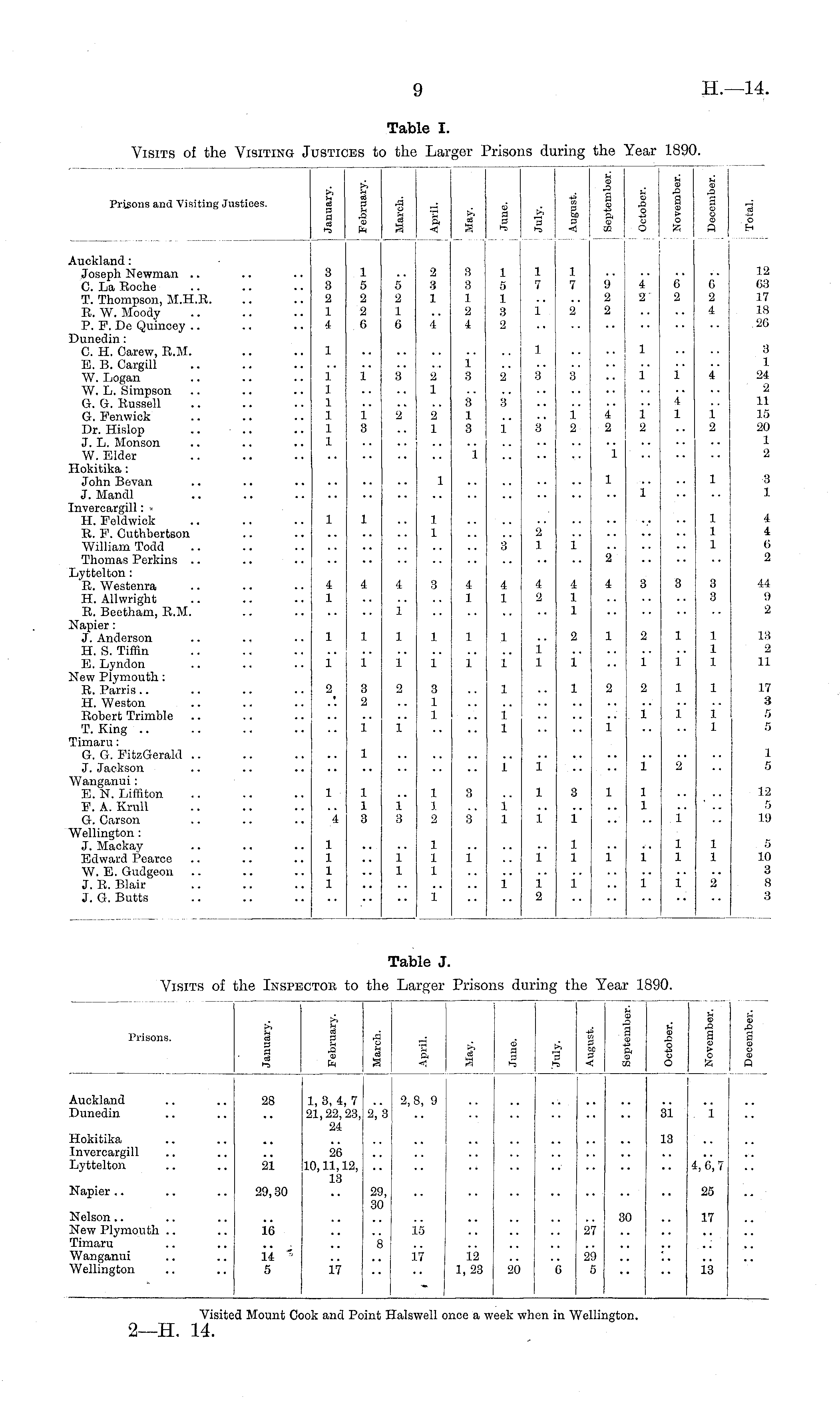 Table J. Visits of the Inspector to the Larger Prisons during the Year 1890.
