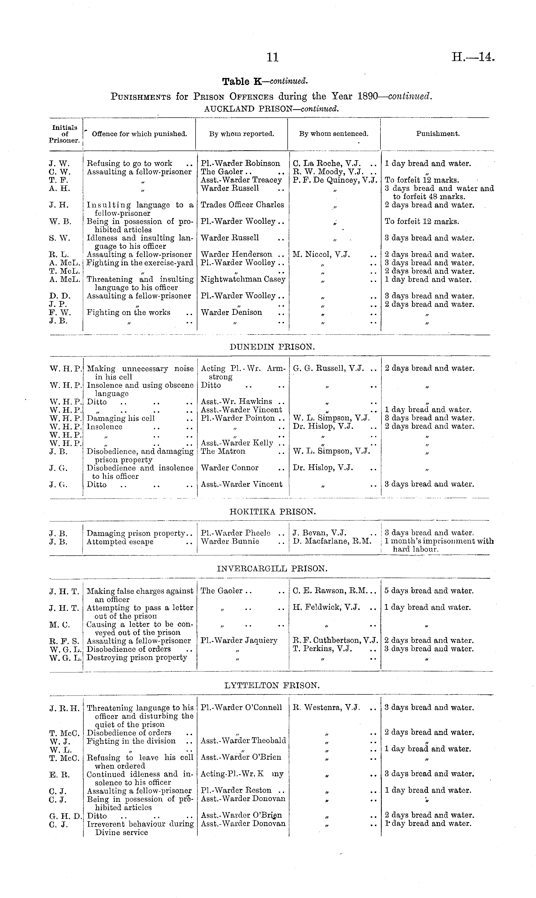 Table K—continued. Punishments for Prison Offences during the Year 1890 — continued. AUCKLAND PRISON— continued.