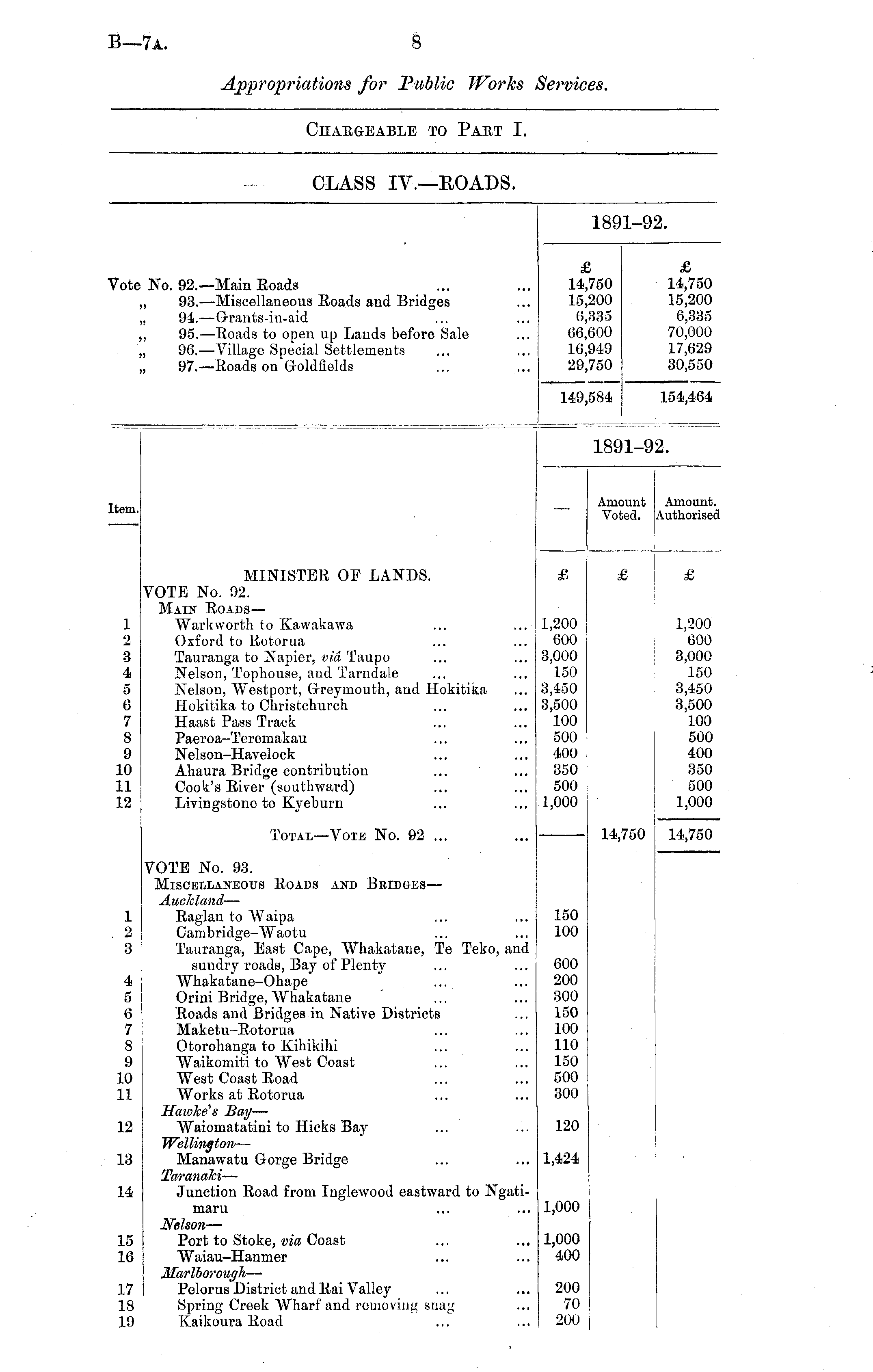 ote No. 92.—Main Eoads „ 93.—Miscellaneous Eoads and Bridges „ 94.—Grants-in-aid ,, 95.—Eoads to open up Lands before Sale „ 96. —Village Special Settlements „ 97.—Roads on Goldfields £ 14,750 15,200 0,335 66,600 16,949 29,750 £ 14,750 15,200 6,335 70,000 17,629 30,550 149,584 154,464 18' 1-9 !tem. Amount Voted. Amount. Authorised 1 2 3 4 5 6 7 8 9 10 11 12 MINISTER OF LANDS. VOTE No. 92. Main Roads— Warkworth to Kawakawa Oxford to Eotorua Tauranga to Napier, via Taupo Nelson, Tophouse, and Tarndale Nelson, Westport, Grcymouth, and Hokitika Hokitika to Christchurch Haast Pass Track Paeroa-Teremakau Nelson-Havelock Ahaura Bridge contribution Cook's Biver (southward) Livingstone to Kyeburn £ 1,200 600 3,000 150 3,450 3,500 100 500 400 350 500 1,000 £ 1,200 600 3,000 150 3,450 3,500 100 500 400 350 500 1,000 Total —Vote No. 92 ... 14,750 14,750 1 . 2 3 4 5 6 7 8 9 10 11 VOTE No. 93. Miscellaneous Roads and Bbidges— Auckland — Eaglan to Waipa Cambridge-Waotu Tauranga, East Cape, Whakatane, Te Teko, and sundry roads, Bay of Plenty Whakatane-Ohape Orini Bridge, Whakatane Roads and Bridges in Native Districts Maketu-Eotorua Otorohanga to Kihikilii Waikomiti to West Coast West Coast Eoad Works at Rotorua Hawhe.s Hay — Waiomatatini to Hicks Bay Wellington— Manawatu Gorge Bridge Taranaki — Junction Eoad from Inglewood eastward to Ngati150 100 600 200 300 150 100 110 150 500 300 12 120 13 1,424 14 1,000 maru 15 16 Nelson — Port to Stoke, via Coast Waiau-Hanmer JKarlborougli — Pelorus District and Eai Valley Spring Creek Wharf and removing snag Kaikoura Eoad 1,000 400 17 IS 200 70 200