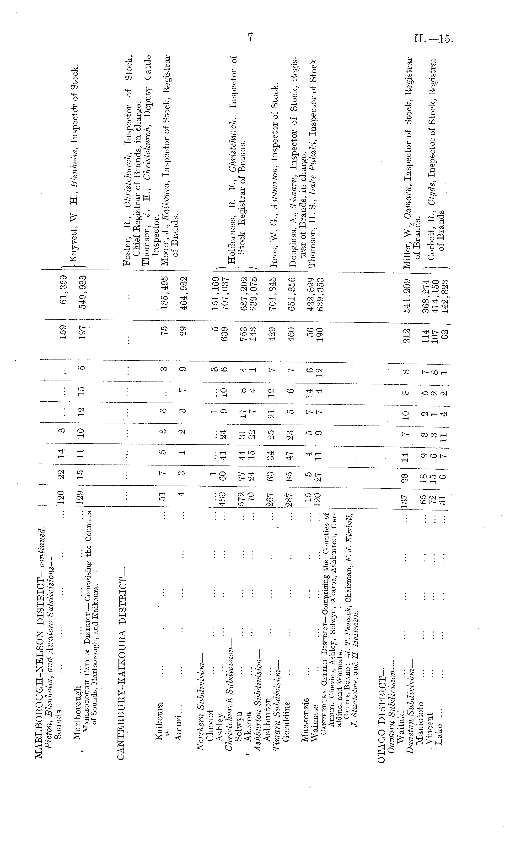 MARLBOROUGH-NELSON DISTRICT— continued. Picton, Blenheim, and Awatere Subdivisions — Sounds 120 22 14 3 ! ' ' ' 159 61,359 tKnyvett, W. H., Blenheim, Inspect* of Stock. Marlborough Maklboeough Cattle District — Comprising the Counties of Sounds, Marlborough, and Kaikoura. 129 15 11 10 12 15 I 5 197 549,933 CANTERBURY-KAIKO'URA DISTRICT— Kaikoura 75 185,495 Foster, E., Ghristchurch, Inspector of Stock, Chief Registrar of Brands, in charge. Thomson, J. B., Christchurch, Deputy Cattle Inspector. Moore, J., Kaikoura, Inspector of Stock, Registrar of Brands. 51 7 5 3 6 3 Amuri... 4 3 1 2 3 7 9 29 464,932 Northern Subdivision — Cheviot Ashley Ghristchurch Subdivision — Selwyn Akaroa Ashburton Subdivision — Ashburton Timaru Subdivision — Geraldine 489 572 70 1 60 77 24 41 44 15 24 31 22 1 9 17 7 10 8 4 3 6 4 1 5 639 753 143 151,169 707,037 637,202 239,075 Holderness, E. F., Ghristchurch, Inspector of Stock, Eegistrar of Brands. |267 63 34 25 21 12 7 429 701,845 Eees, W. G., Ashburton, Inspector of Stock. J287 85 47 23 5 6 7 460 651,356 Douglass, A., Timaru, Inspector of Stock, Eegistrar of Brands, in charge. Thomson, H. S., Lake Pulcahi, Inspector of Stock. Mackenzie Waimate Cantebbury Cattle Distbict— Comprising the Counties of Amuri, Cheviot, Ashley, Selwyn, Akaroa, Ashburton, Geraldine, and Waimate. Cattle Boaed :— J. T. Peacock, Chairman, F. J. Kimbell, J. Studholme, and H. Mcllraith. 15 120 5 27 4 11 5 9 7 7 14 4 6 12 56 190 422,899 639,353 I OTAGO DISTRICT— Oamaru Subdivision — Waitaki Dunstan Subdivision — Maniototo Vincent Lake ... Miller, W., Oamaru, Inspector of Stock, Registrar of Brands. 137 28 7 110; 14 8 8 212 541,209 60 72 31 18 15 6 9 6 7 ! 8 2 3-1 11 Ml 5 2 2 7 8 1 114 107 62 368,274 414,150 142,823 ) Corbett, E., Clyde, Inspector of Stock, Registrar j of Brands