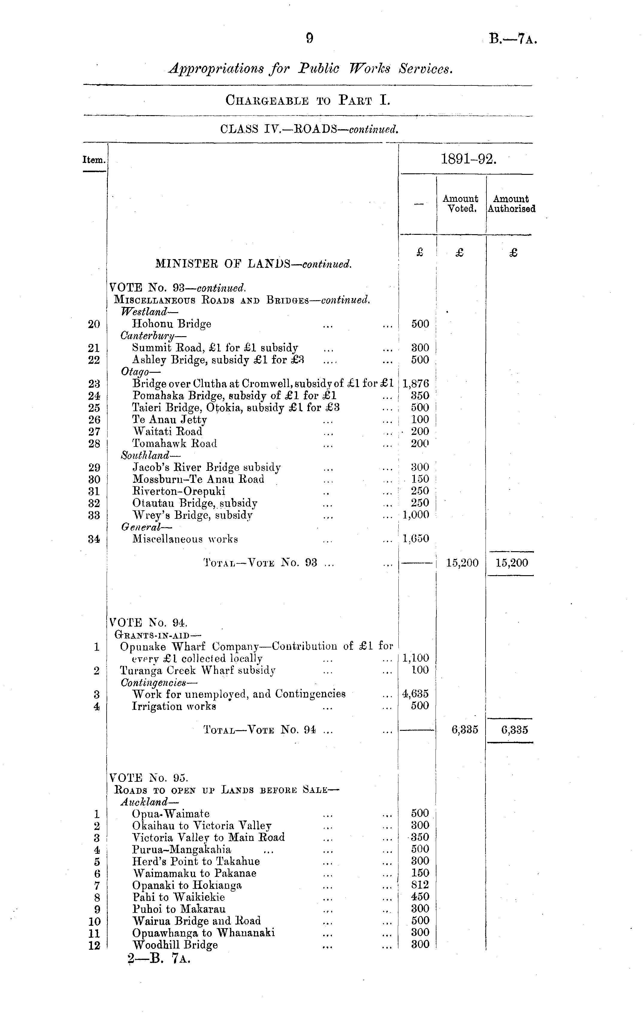 item. _ A Amount Voted. Amount Voted. Amount Authorised I £ £ MINISTER O'J? LANDS—continued. 20 21 22 23 24 25 26 27 28 VOTE No. 98— continued. Miscellaneous Roads akd Bbid&es— continued. Westland— Hohonu Bridge ... ... I 500 Canterbury — Summit Road, £1 for £1 subsidy ... ... 300 Ashley Bridge, subsidy £1 for £8 ..., ... 500 Otago — Bridge over Clutha at Cromwell, subsidy of £1 for £1 j 1,876 Pomahaka Bridge, subsidy of £1 for £1 ... ! 350 Taieri Bridge, Otokia, subsidy £1 for £3 .... 500 TeAnau Jetty ... ... 100 WaitatiRoad ... ... ■ • 200 Tomahawk Road ... ... 200 Southland — Jacob's River Bridge subsidy ... ... 300 Mossbum-Te Anau Road ... ... 150 Riverton-Orepuki .. ... 250 Otautau Bridge, subsidy ... ... 250 Wrey's Bridge, subsidy ... ... 1,000 General —■ Miscellaneous works ... ... 1,650 29 30 81 32 38 34 Total—Vote No. 93 ... ... i : 15,200 15,200 1 VOTE No. 94. GrBANT8-lN-AID— Opimake Wharf Company —Contribution of £L for every £1 collected locally ... ... | 1,100 Turanga Creek Wharf subsidy ... ... 100 j Contingencies —■ Work for unemployed, and Contingencies ... 4,635 Irrigation works ... ... 500 1,100 100 2 3 4 4,635 500 Total—Vote No. 94 ... ... 6,335 6,835 0,335 1 2 3 4 5 6 7 8 9 10 11 12 VOTE No. 95. Roads to open up Lands before Sale — Auckland — Opua-Waimate ... ... 500 Okaihau to Victoria Valley ... ... 300 Victoria Valley to Main Road ... ... | 350 Purua-Mangakahia ... ... ... j 500 Herd's Point to Takahue ... ... 300 Waimamaku to Pakanae ... ... j 150 Opanaki to Hokianga ... ... S12 Pahi to Waikiekie ... ... j 450 Puhoi to Makarau ... ... 300 Wairua Bridge and Road ... ... 500 Opuawhanga to Whananaki ... ... 300 Woodhill Bridge ... ... 300 500 300 350 500 300 150 S12 450 300 500 300 300
