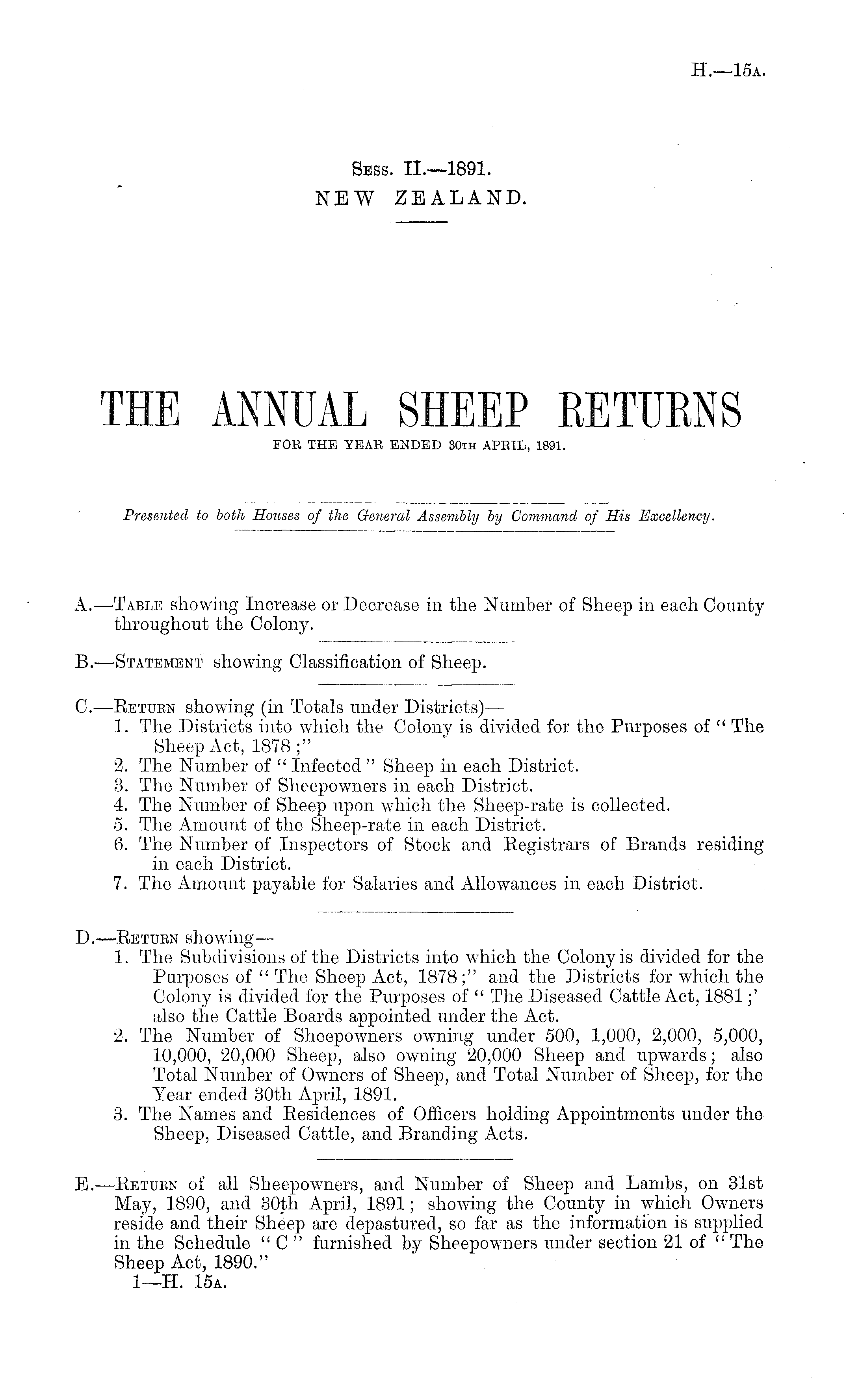 THE ANNUAL SHEEP RETURNS FOR THE YEAR ENDED 30th APRIL, 1891.