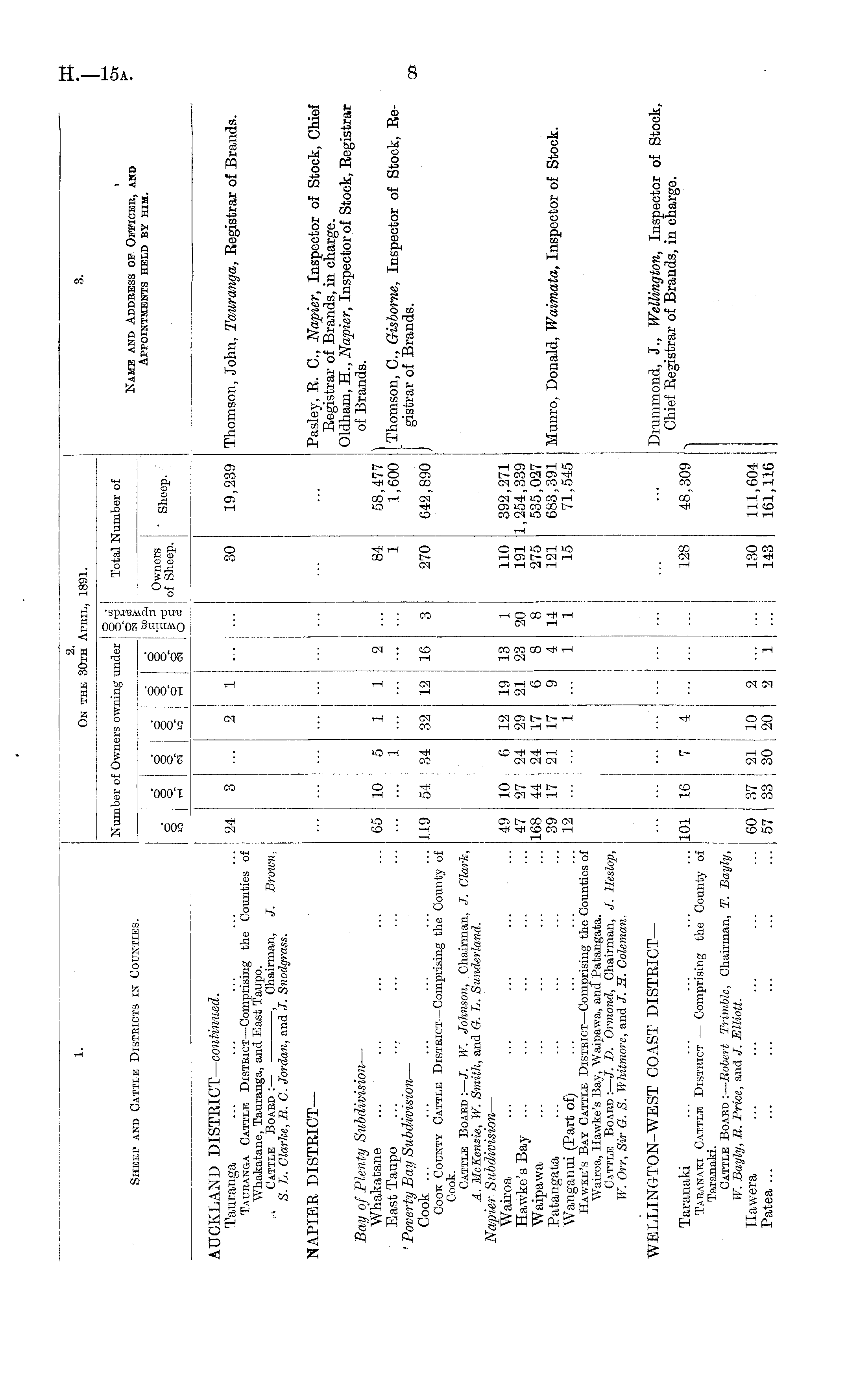 1. 2. On the 30th Apeil, 1891. 3. Sheep and Cattle Distbicts in Counties. o - | Number of Owners owning under 8 £ \ Total Number of i Name and Addbess of Officer, and Appointments held by him. 8 r-T | ■ • i 60 g. Owners of Sheep. Sheep. AUCKLAND DISTRICT— continued. Tauranga Taukanga Cattle District —Comprising the Counties of Whakatane, Tauranga, and East Taupo. ..». Cattle Boabd :— — , Chairman, J. Brown, S. L. Clarke, B. C. Jordan, and J. Snodgrass. 24 .,. i ... 30 19,239 Thomson, John, Tauranga, Eegistrar of Brands. NAPIEE DISTEICT— Pasley, E. C, Napier, Inspector of Stock, Chief Eegistrar of Brands, in charge. Oldham, H., Napier, Inspector of Stock, Eegistrar of Brands. Bay of Plenty Subdivision — Whakatane East Taupo Poverty Bay Subdivision — Cook ... Cook County Cattle Distbiot —Comprising the County of Cook. Cattle Board :—/. W. Johnson, Chairman, /. Clark, A. McKenzie, W. Smith, and G. L. Sunderland. Napier Subdivision — Wairoa Hawke's Bay . ■ • Waipawa Patangata Wanganui (Part of) Hawke's Bay Cattle Distbict —Comprising the Counties of Hawke's Bay, Waipawa, and Patangata. Cattle Boabd :— j. D. Ormond, Chairman, J. Heslop, W. Orr, Sir G. S. Whitmorc, and J. H. Coleman65 119 10 i 5 1 54 34 1 32 1 12 2 16 3 84 1 270 58,477 1,600 642,890 392,271 1,254,339 535,027 683,391 71,545 [Thomson, C, Gisborne, Inspector of Stock, Eegistrar of Brands. 49 47 168 39 12 10 ! 6 27 ! 24 44 ! 24 17 | 21 ... I ... 12 17 17 1 19 21 6 9 13 23 8 4 1 1 20 8 14 1 110 191 275 121 15 ■ Munro, Donald, Waimata, Inspector of Stock. WELLINGTON-WEST COAST DISTEICT— Drammond, J., Wellington, Inspector of Stock, Chief Eegistrar of Brands, in charge. Taranaki Tabanaki Cattle District — Comprising the County of Taranaki. Cattle Boabd :— Robert Trimble, Chairman, T. Bayly, W. Bayly, B. Price, and /. Elliott. 101 16 7 4 128 48,309 1 Hawera Patea ... 60 57 37 ! 21 33 | 30 10 20 2 2 130 143 111,604 161,116 1