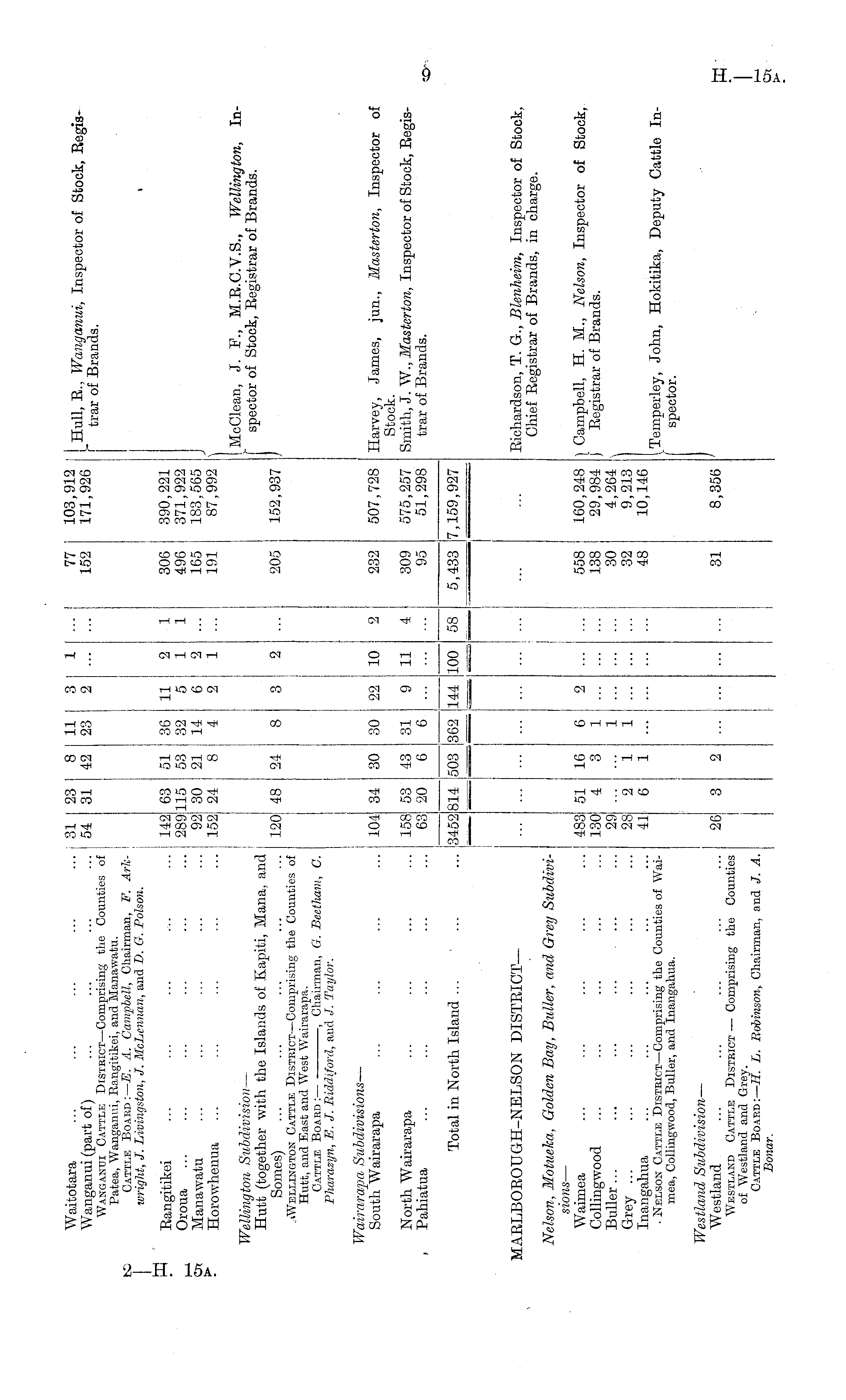 Waitotara ... ... ... ... ... 31 Wanganui (part of) ... ... ... ... 54 Wanganui Cattle District —Comprising the Counties of Patea, Wanganui, Rangitikei, and Manawatu. fcC; Cattle Board :— E. A. Campbell, Chairman, F. Arhivright, J. Livingston, 3. McLennan, and D. G. Poison. r" 1 Rangitikei ... ... ... ... ... 14! Oroua ... ... ... ... 28( Crt Manawatu ... ... ... ... ... 9: • Horcrwhenua ... ... ... ... ... 15! 31 8 42 11 23 3 ■2 1 77 152 103,912 171,926 j Hull, B., Wanganui, Inspector of Stock, Registrar of Brands. 390,221 371,922 183,565 87,992 I 142 289 92 152 63 115 30 24 51 53 21 8 36 32 14 4 11 5 6 2 2 1 2 1 1 1 306 496 165 191 J McClean, J. h\, M.R.C.V.S., Wellington, Inspector of Stock, Registrar of Brands. Wellington Subdivision — Hutt (together with the Islands of Kapiti, Mana, and Somes) ... ... ... ... ... 121 Cattle District —Comprising the Counties of Hutt, and East and West Wairarapa. Cattle Boabd :— ■ , Chairman, G. Beetliam, C. Pliarazyn, E. J. Riddiford, and J. Taylor. 120 48 24 205 152,937 I Wairarapa Subdivisions — South Wairarapa ... ... ... ... 10 507,728 Harvey, James, jun., Masterton, Inspector of Stock. Smith, J. W., Masterton, Inspector of Stock, Registrar of Brands. 104 34| 30 30 22 10 j 2 232 North Wairarapa ... ... ... ... 15 Pahiatua ... ... ... ... ... 6 158 63 53 20 43 6 31 6 9 11 4 309 95 575,257 51,298 Total in North Island ... ... ...345 I I j3452 814 503 362 144 100 58 5,433 7,159,927 ■ _ ' i^ MABLBOROUGH-NELSON DISTRICT— Eichardson, T. G., Blenheim, Inspector of Stock, Chief Registrar of Brands, in charge. Nelson, Motueka, Golden Bay, Butter, and Grey Subdivisions — Waimea ... ... ... ... ... 48! Collingwood ... ... ... ... ... 13" Buller... ... ... ... 2' Grey ... ... ... ... ... ... 2; Inangahua ... ... ... ... ... 4 Nelson Cattle District —Comprising the Counties of Waimea, Collingwood, Buller, and Inangahua. 483 130 29 28 41 51 4 2 6 16 3 1 1 6 1 1 1 2 558 138 30 32 48 160,248 29,984 4,264 9,213 10,146 | Campbell, H. M., Nelson, Inspector of Stock, j Registrar of Brands. \ Ternperley, John, Hokitika, Deputy Cattle In- [ spector. Westland Subdivision— Westland ... ... ... ... ... 2i Westlakd Cattle Distbict — Comprising the Counties of Westland and Grey. Cattle Board: — H. L. Robinson, Chairman, and J. A. Boivxr. 8,356 20 31