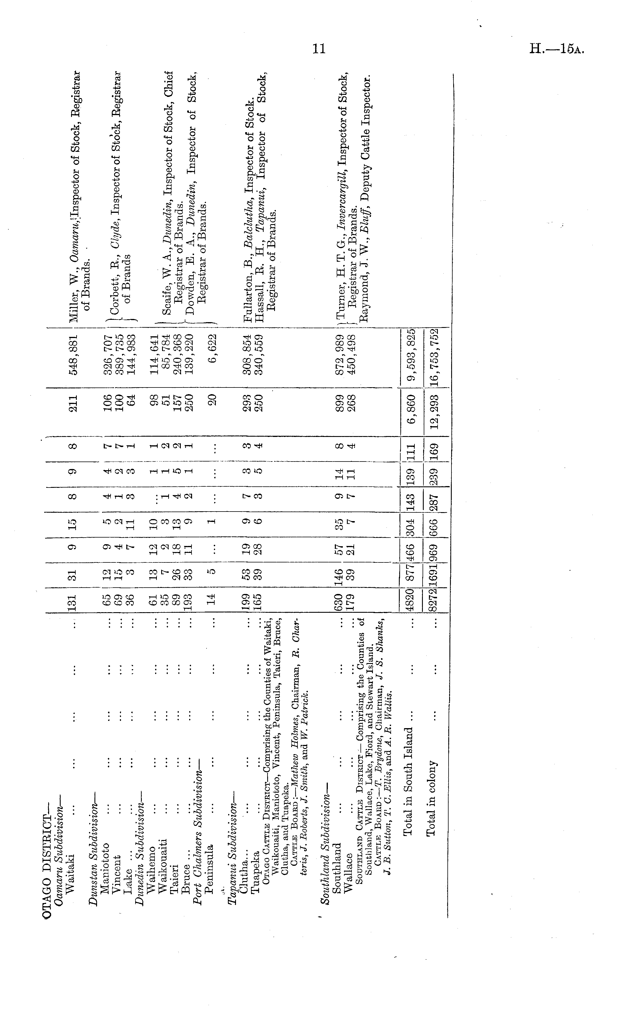 OTAGO DISTBICT— Oamaru Subdivision — Waitaki 131 31 15 211 548,881 Miller, W., Oamaru,\ Inspector of Stock, Eegistrar of Brands. Duns tan Subdivision — Maniototo Vincent Lake ... Dunedin Subdivision — Waihemo Waikouaiti Taieri Bruce ... Port Chalmers Subdivision — Peninsula 65 69 36 61 35 89 193 12 15 3 18 7 26 33 9 4 7 12 2 18 11 5 2 11 10 3 13 9 4 1 3 4 I 7 2 7 3j 1 1 ! 1 1 | 2 5 2 1 1 106 100 64 98 51 157 250 326,707 389,735 144,983 114,641 85,784 240,368 139,220 [Corbett, E., Clyde, Inspector of Stock, Eegistrar of Brands 1 4 2 Scaife, W. A., Dunedin, Inspector of Stock, Chief Eegistrar of Brands. | Dowden, B. A., Dunedin, Inspector of Stock, Eegistrar of Brands. 14 5 1 20 6,622 Tapanui Subdivision — Clutha... Tuapeka Otago Cattle District— Comprising the Counties of Waitaki, Waikouaiti, Maniototo, Vincent, Peninsula, Taieri, Bruce, Clutha, and Tuapeka. Cattle Boaed :— Mathew Holmes, Chairman, E. Charteris, J. Roberts, J. Smith, and W. Patrick. 199 165 53 39 19 28 9 6 7 3 3 3 5 4 293 250 308,854 340,559 Fullarton, B., Balclutha, Inspector of Stock. Hassall, E. H., Tapanui, Inspector of Stock, Eegistrar of Brands. Southland Subdivision — Southland Wallace Southland Cattle Distbict — Comprising the Counties of Southland, Wallace, Lake, Fiord, and Stewart Island. Cattle Boaed: — T. Brydone, Chairman, /. S. Shanks, J. B. Sutton, T. C. Ellis, and A. E. Wallis. 630 179 146 39 57 21 35 7 9 7 14 11 8 4 899 268 872,989 450,498 ] Turner, H. T. G., Invercargill, Inspector of Stock, j Eegistrar of Brands. Eaymond, J. W., Bluff, Deputy Cattle Inspector. Total in South Island ... Total in colony 4820 877 466 1691969 304 ! 143 [ i 139 ! 111 6,860 9,593,825 8272 666 287 239 169 12,293 16,753,752