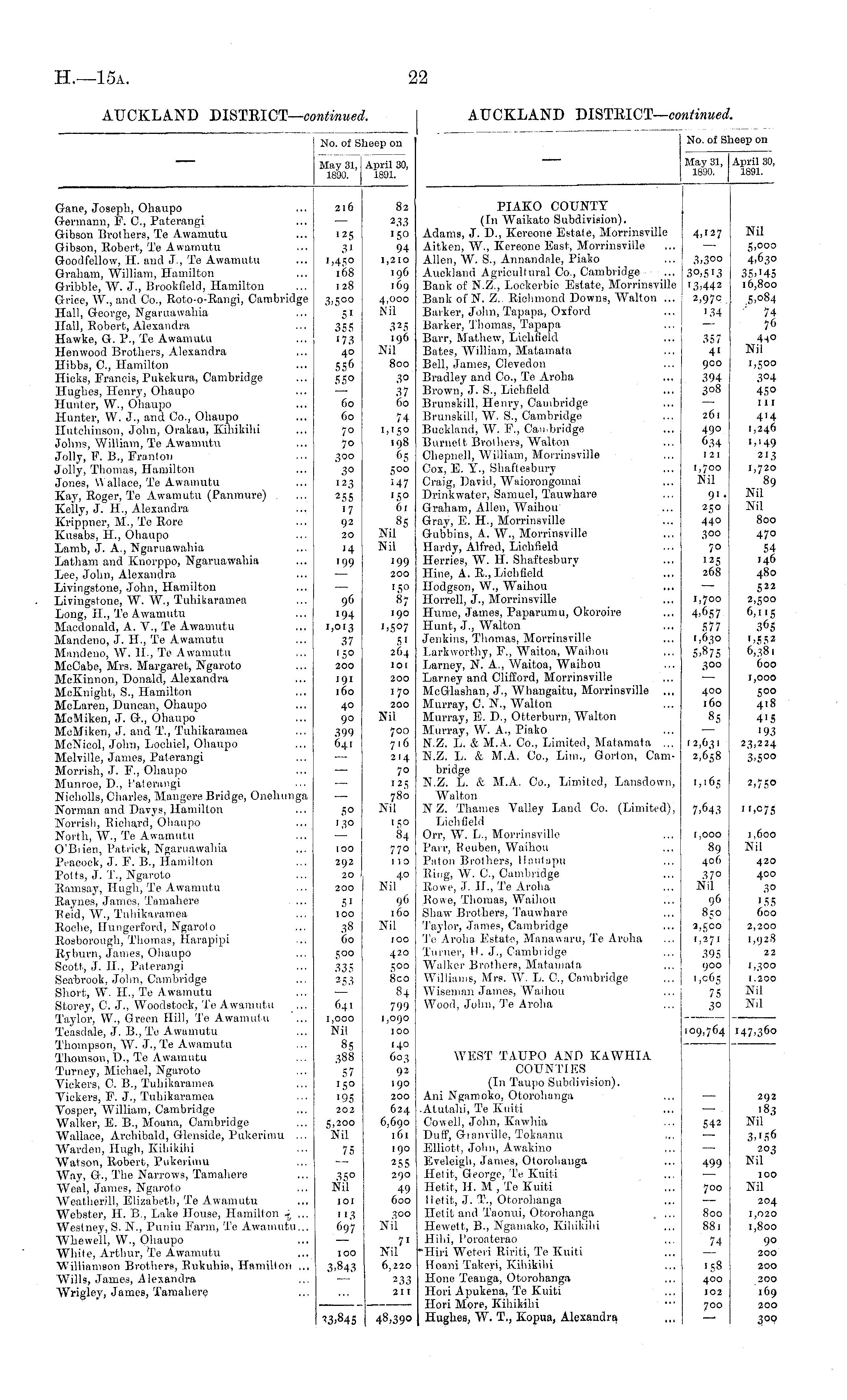 No. of Sheep on May 31, April 30, 1890. 1891. Gane, Joseph, Ohaupo Germann, F. C, Paterangi Gibson Brothers, Te Awamutu Gibson, Robert, Te Awamutu Goodfellow, H. and J., Te Awamutu Graham, William, Hamilton Gribble, W. J., Brookfield, Hamilton Grice, W., and Co., Roto-o-Rangi, Cambridge Hall, George, Ngaruawahia Hall, Robert, Alexandra Hawke, G. P., Te Awamutu Henwood Brothers, Alexandra Hibbs, C, Hamilton Hicks, Francis, Pukekura, Cambridge Hughes, Henry, Ohaupo Hunter, W., Ohaupo Hunter, W. J., and Co., Ohaupo Hutchinson, John, Orakau, Kihikihi Johns, William, Te Awamutu Jolly, F. B., Franton Jolly, Thomas, Hamilton Jones, Wallace, Te Awamutu Kay, Roger, Te Awamutu (Panmure) Kelly, J. H., Alexandra Krippner, M., Te Rore Kusabs, H., Ohaupo Lamb, J. A., Ngaruawahia Latham and Knorppo, Ngaruawahia Lee, John, Alexandra Livingstone, John, Hamilton Livingstone, W. W., Tuhikaramea Long, II., Te Awamutu Macdonald, A. V., Te Awamutu Mandeno, J. H., Te Awamutu Mnndeuo, W. H., Te Awamutu McCabe, Mrs. Margaret, Ngaroto McKinnon, Donald, Alexandra MeKnightj 8., Hamilton McLaren, Duncan, Ohaupo MeMiken, J. G., Ohaupo McMiken, J. and T., Tuhikaramea McNieol, John, Lochiel, Ohaupo Melville, James, Paterangi Morrish, J. F., Ohaupo Munroe, D., I'alerangi Nicliolls, Charles, Mangere Bridge, Onehunga Norman and Davys, Hamilton Norrish, Richard, Ohaupo North, W., Te Awamutu O'Biien, Patrick, Ngaruawahia Peacock, J. F. B., Hamilton Potts, J. T., Ngaroto Ramsay, Hugh, Te Awamutu Raynes, James, Tuniahere Keid, W., Tuhikaramea Roche, EFungerford, Ngaroto Rosborough, Thomas, Harapipi Rybuvn, James, Ohaupo Scott, J. H., Paterangi Sea-brook, John, Cambridge Short, W. II., Te Awamutu Storey, C. J., Woodstock, Te Awamutu Taylor, W., Green Hill, Te Awamutu Teasdale, J. B., Te Awamutu Thompson, W. J., Te Awamutu Thomson, D., Te Awamutu Turney, Michael, Ngaroto Vickers, C. B., Tuhikaramea Vickers, F. J., Tuhikaramea Vosper, William, Cambridge Walker, E. B., Moana, Cambridge Wallace, Archibald, Glenside, Pukerimu ... Warden, Hugh, Kihikilii Watson, Robert, Pukerimu Way, G., The Narrows, Tamahere Weal, James, Ngaroto Weatherill, Elizabeth, Te Awamutu Webster, H. B., Lake House, Hamilton » ... Westney, S. N., Punin Farm, Te Awamutu.., Whewe'll, W., Ohaupo White, Arthur, Te Awamutu Williamson Brothers, Rukuhia, Hamilton ... Wills, James, Alexandra Wrigley, James, Tamahere 216 125 i>45° 168 128 3,5°° 51 355 173 40 556 55° 60 60 7° 70 300 3° 123 255 17 0.2 20 >4 199 96 194 1,013 37 '5° 200 191 160 40 90 399 64, 82 233 150 94 1,210 196 169 4,000 Nil 3 25 196 Nil 800 30 37 60 74 1,1 198 65 500 i47 '5° 61 85 Nil Nil 199 200 150 87 190 1.507 51 264 lor 200 170 200 Nil 700 7I 6 214 70 '2.5 780 Nil 5° 130 '5° 84 770 110 [00 292 20 40 Nil 96 160 Nil 100 200 5 1 100 38 60 500 335 64! 1,000 Nil 85 388 "57 '5° i95 202 420 500 8co 84 799 1,090 1 00 140 603 92 190 200 624 6,690 161 5,200 Nil 75 190 255 290 49 600 ?,oo Nil 7i Nil 6,220 211 35° Nil 101 1 >3 697 TOO 3.843 ■*3< 845 48,39°
