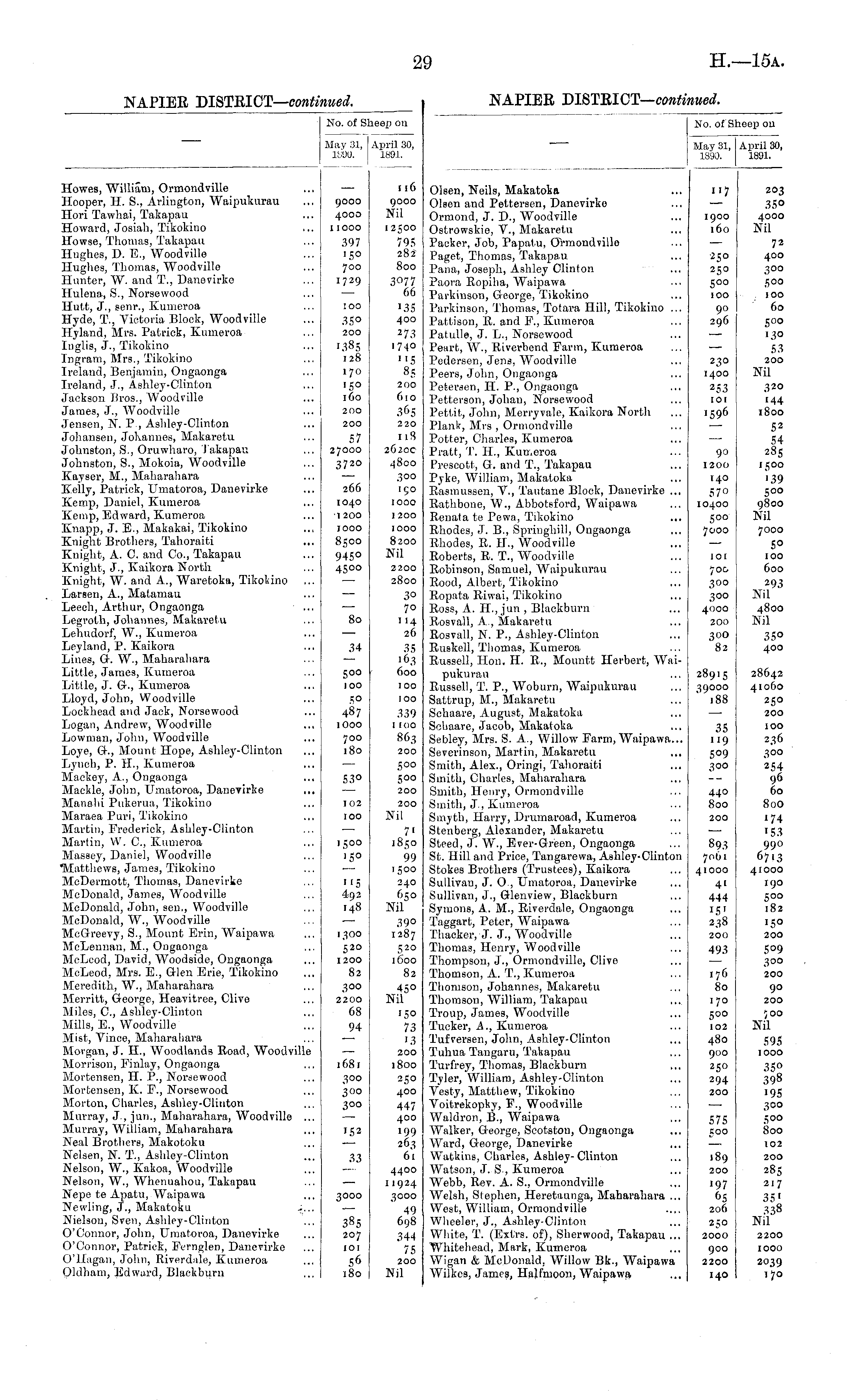 No. of SI tieep on April 30, 1891. May 31, 1890. Howes, William, Ormondvillo Hooper, II. S., Arlington, Waipukurau Hori Tawhai, Takapau Howard, Josiah, Tikokino Howse, Thomas, Takapau Hughes, D. E., Woodville Hughes, Thomas, Woodville Hunter, W. and T., Danevirke Hulena, S., Norsewood Hutfc, J., senr., Kumcroa Hyde, T., Victoria Block, Woodville Hyland, Mrs. Patrick, Kumeroa Inglis, J., Tikokino Ingram, Mrs., Tikokino Ireland, Benjamin, Ongaonga Ireland, J., Ashley-Clinton Jackson Bros., Woodville James, J., Woodville JenBen, N. P, Ashley-Clinton Johansen, Jolvanncs, Makaretu Johnston, S., Oruwharo, Takapau Johnston, S., Mokoia, Woodville Kayser, M., Maharahara Kelly, Patrick, Umatoroa, Danevirke Kemp, Daniel, Kumeroa Kemp, Edward, Kumeroa Knapp, J. E., Makakai, Tikokino Knight Brothers, Tahoraiti Knight, A. C. and Co., Takapau Knight, J., Kaikora North Knight, W. and A., Waretoka, TikoHno Larsen, A., Matamau Leech, Arthur, Ongaonga Legrolh, Johannes, Makaretu Lehudorf, W., Kumeroa Leyland, P. Kaikora Lines, G-. W., Maharahara Little, James, Kumeroa Little, J. G-., Kumeroa Lloyd, John, Woodville Lockhead and Jack, Norsewood Logan, Andrew, Woodville Lowman, John, Woodville Loye, (3-., Mount Hope, Ashley-Clinton Lynch, P. II., Kumeroa Muckey, A., Ongaonga Mackle, John, Umatoroa, Daneyirke ... Manahi Pukerua, Tikokino Maraea Puri, Tikokino Martin, Frederick, Ashley-Clinton Martin, W. C, Kumeroa Masaey, Daniel, Woodville "Matthews, James, Tikokino McDermott, Thomas, Danevirke McDonald, James, Woodvillo McDonald, John, sen., Woodville McDonald, W., Woodville McGrreevy, S., Mount Erin, Waipawa McLennan, M., Ongaonga McLcod, David, Woodside, Ongaonga McLeod, Mrs. E., Glen Erie, Tikokino Meredith, W., Maharahara Merritt, George, Heavitree, Clive Miles, C., Ashley-Clinton Mills, E., Woodville Mist, Vince, Maharahara Morgan, J. H., Woodlands Road, Woodville Morrison, Finlay, Ongaonga MortenBen, H. P., Noraewood Mortensen, K. P., Norsewood Morton, Charles, Ashley-Clinton Murray, J., jun., Maharahara, Woodville ... Murray, William, Maharahara Neal Brothers, Makotoku Nelsen, N. T., Ashley-Clinton Nelson, W., Kakoa, Woodville Nelson, W., Whenuahou, Takapau Nepe te Apatu, Waipawa Newling, J., Makatoku Nielson, Sven, Ashley-Clinton O'Connor, John, Umatoroa, Danevirke O'Connor, Patrick, Pernglen, Danevirko O'llagan, John, Eiverdale, Kumeroa Oldham, Edward, Blackburn 116 9000 4000 11000 9000 Nil 12500 795 282 800 3077 66 '35 400 273 1740 "5 8S 200 610 365 220 118 2620c 4800 300 150 1000 1200 1000 8200 Nil 2200 2800 397 15° 700 1729 100 35° 200 1385 128 170 ■5° 160 200 200 57 27000 3720 266 1040 1200 JOOO 8500 9450 45 00 80 3° 7° 114 26 34 35 163 600 100 500 100 S° 487 1000 700 180 100 339 1 100 863 200 500 500 200 200 Nil 53° 102 IOO IJOO '5° 7' 1850 99 1500 240 650 Nil " '5 492 r 4 8 1300 520 1200 82 300 2200 68 94 39° 1287 520 1600 82 1681 300 300 300 45° Nil 150 73 13 200 1800 250 400 447 400 199 26^ 61 '52 33 3000 385 207 101 56 180 4400 11924 3000 49 698 344 75 200 Nil