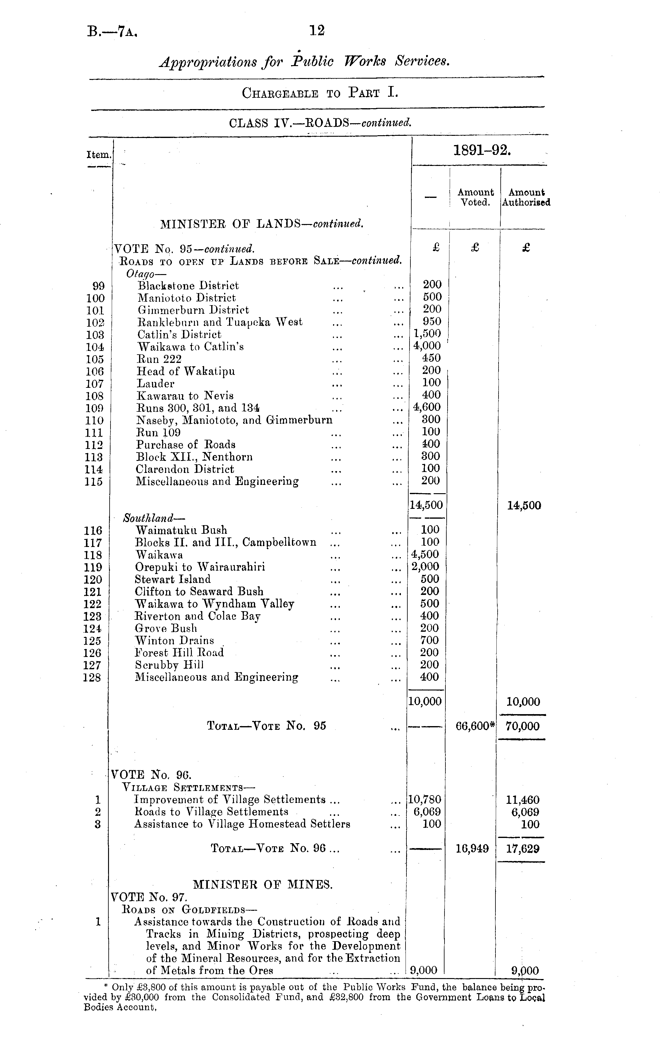 Item. ] Amount Voted. Amount Authorised MINISTER OF LANDS— continued. 99 100 101 102 103 104 105 106 107 108 109 110 111 112 113 114 115 VOTE No. 95— continued, Roads to open dp Lands before Sale — continued. Otaqo — Blackstone District Maniototo District Gimmerburn District Rankleburn and Tuapeka West Catlin's District Waikawa to Catlin's Run 222 Head of Wakatipu Lauder Kawarau to Nevis Runs 300, 301, and 134 Naseby, Maniototo, and Gimmerburn Run 109 Purchase of Roads Block XII., Nenthorn Clarendon District Miscellaneous and Engineering £ 200 500 200 950 1,500 4,000 450 200 100 400 4,600 300 100 400 300 100 200 £ £ 14,500 Southland — Waimatuku Bush Blocks II. and III., Campbelltown ... Waikawa Orepuki to Wairaurahiri Stewart Island Clifton to Seaward Bush Waikawa to Wyndham Valley Riverton and Colac Bay Grove Bush Winton Drains Forest Hill Road Scrubby Hill Miscellaneous and Engineering 14,500 116 117 118 119 120 121 122 123 124 125 126 127 128 100 100 4,500 2,000 500 200 500 400 200 700 200 200 400 10,000 Total—Vote No. 95 10,000 66,600* 70,000 1 2 3 VOTE No. 96. Village Settlements — Improvement of Village Settlements ... Koads to Village Settlements Assistance to Village Homestead Settlers 10,780 6,069 100 11,460 6,069 100 Total—Vote No. 96... 16,949 17,629 MINISTER OF MINES. VOTE No. 97. Roads on Goldfields— Assistance towards the Construction of Roads and Tracks in Mining Districts, prospecting deep levels, and Minor Works for the Development of the Mineral Resources, and for the Extraction of Metals from the Ores 9,000 9,000 ■ided Jodie Only £3,800 of this amount is payable out of the Public Works Fund, 1 by £30,000 from the Consolidated Fund, and £32,800 from the Govern is Account, ;he balance iment Loa: being prois to Local