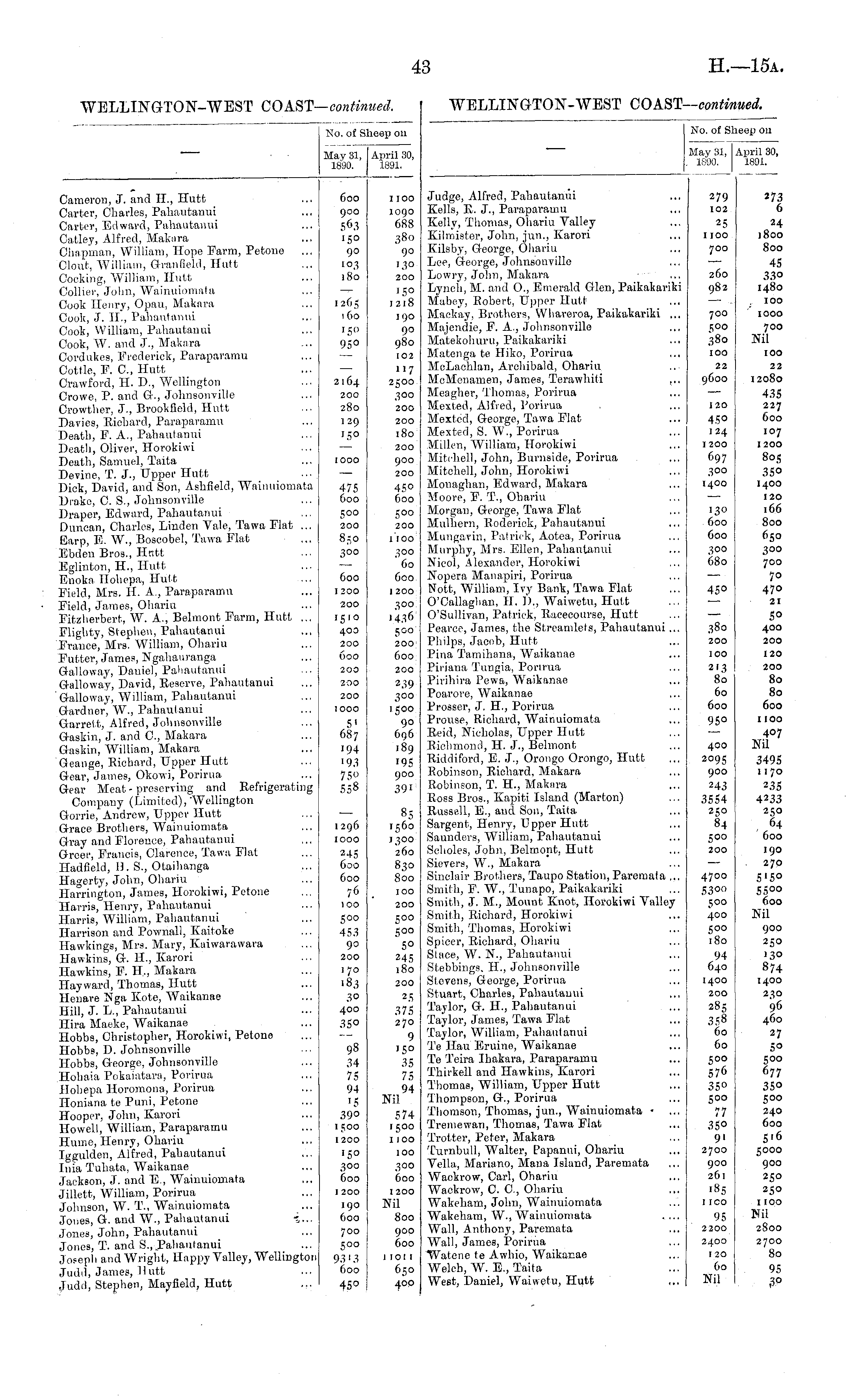 No. or Sheep on May 31, April 30, 1890. 1891. Cameron, J. and II., Ilutt Carter, Charles, Pahautanui Carter, Edward, Pahautanui Catley, Alfred, Mafcu-a Chapman, William, Hope Farm, Petone Clone, William, GranBeld, Ilutt Cocking, William, Ilutt Collier, John, Wainuiomala Cook Henry, Opau, Makara Cook, J. II., Pahautanui Cook, William, Pahautanui Cook, W. and J., Makara Cordukes, Frederick, Parapnramu Oottle, F. C, Hutt Crawford, II. D., Wellington Crowe, P. and Gr., Johnsonville Crowther, J., Brookfield, Hutt Davies, Richard, Paraparamu Death, F. A., Pahautanui Death, Oliver, Horokiwi Death, Samuel, Taita Devine, T. J., Upper Hutt Dick, David, and Son, Ashfleld, Wainuiomata Drake, C. S., Jolinsonville Draper, Edward, Pahautanui Duncan, Charles, Linden Vale, Tawa Flat ... Earp, B. W., Boscobel, Tawa Flat Ebden Bros., Hntt Eglinton, H., Hutt Enoka Hohepa, Hult Field, Mrs. If. A., Paraparamu Field, James, Ohariu Fitzherbert, W. A., Belmont Farm, Hutt ... Flighty, Stephen, Pahautanui France, Mrs. William, Ohariu Futter, James, Ngahauranga Galloway, Daniel, Pahautanui G-alloway, David, Reserve, Pahautanui Galloway, William, Pahautanui Gardner, W., Pahautanui Garrett, Alfred, Johnsonville Gaskin, J. and C, Makara Gaskin, William, Makara Geange, Eichard, Upper Hutt Gear, James, Okowi, Porirua Gear Meat - preserving and Refrigerating Company (Limited), 'Wellington Gorrie, Andrew, Upper Hutt Grace Brothers, Wainuiomata Gray and Florence, Pahautamii Greer, Francis, Clarence, Tawa Flat Hadfield, H. S., Otaihanga Hagerty, John, Ohariu Harrington, James, Horokiwi, Petono Harris, Henry, Pahautanui Harris, William, Pahautanui Harrison and Pownall, Kaitoke Ha wirings, Mrs. Mary, Kaiwarawara Hawkins, G. H., Karori Hawkins, F. H.., Makara Hayward, Thomas, Ilutt Henare Nga Kote, Waikanae Hili, J. L., Pahautanui Hira Maeke, Waikanae Hobbs, Christopher, Horokiwi, Petone Hobbs, D. Johnsonville Hobbs, George, JohnBonville Hohaia Pokaiatura, Porirua Hohepa Horomona., Porirua Honiana te Puni, Petone Hooper, John, Karori Howell, William, Paraparamu Hume, Henry, Oharin Iggulden, Alfred, Pahautanui Inia Tuhata, Waikanae Jackson, J. and E., Wainuiomata Jillett, William, Porirua Johnson, W. T., Wainuiomata Jones, G. and W., Pahautanui %... Jones, John, Pahautanui Jones, T. and S., Pahantanni Joseph and Wright, Happy Valley, Wellington Judd, James, Ilutt Judil, Stephen, Mayfleld, Hutt 600 I 100 1090 688 380 90 130 200 900 563 'SO 90 103 180 1265 1 60 '5° 121.8 150 95° 1 90 90 980 102 2164 200 280 117 2500 300 200 129 150 200 180 200 1000 900 200 475 600 450 600 500 200 850 300 500 200 1 100 '60 600 600 1200 200 1510 400 200 600 1200 300 1436 500 200 600 200 200 200 1000 5' 687 194 193 75° 558 200 239 300 1500 90 696 J89 I9S 900 39i I296 IOOO 85 1560 1300 260 830 800 245 uoo 600 76 100 500 453 90 200 '7° 183 3° 400 35° 100 200 500 500 5° 245 180 200 98 34 75 94 '5 39° 1500 1200 25 375 270 9 '5° 35 75 94 Nil 574 1500 1100 100 ■5° 300 600 1200 300 600 1200 Nil 800 900 600 190 600 700 500 93 13 600 45° 1 I0E I 650 40O