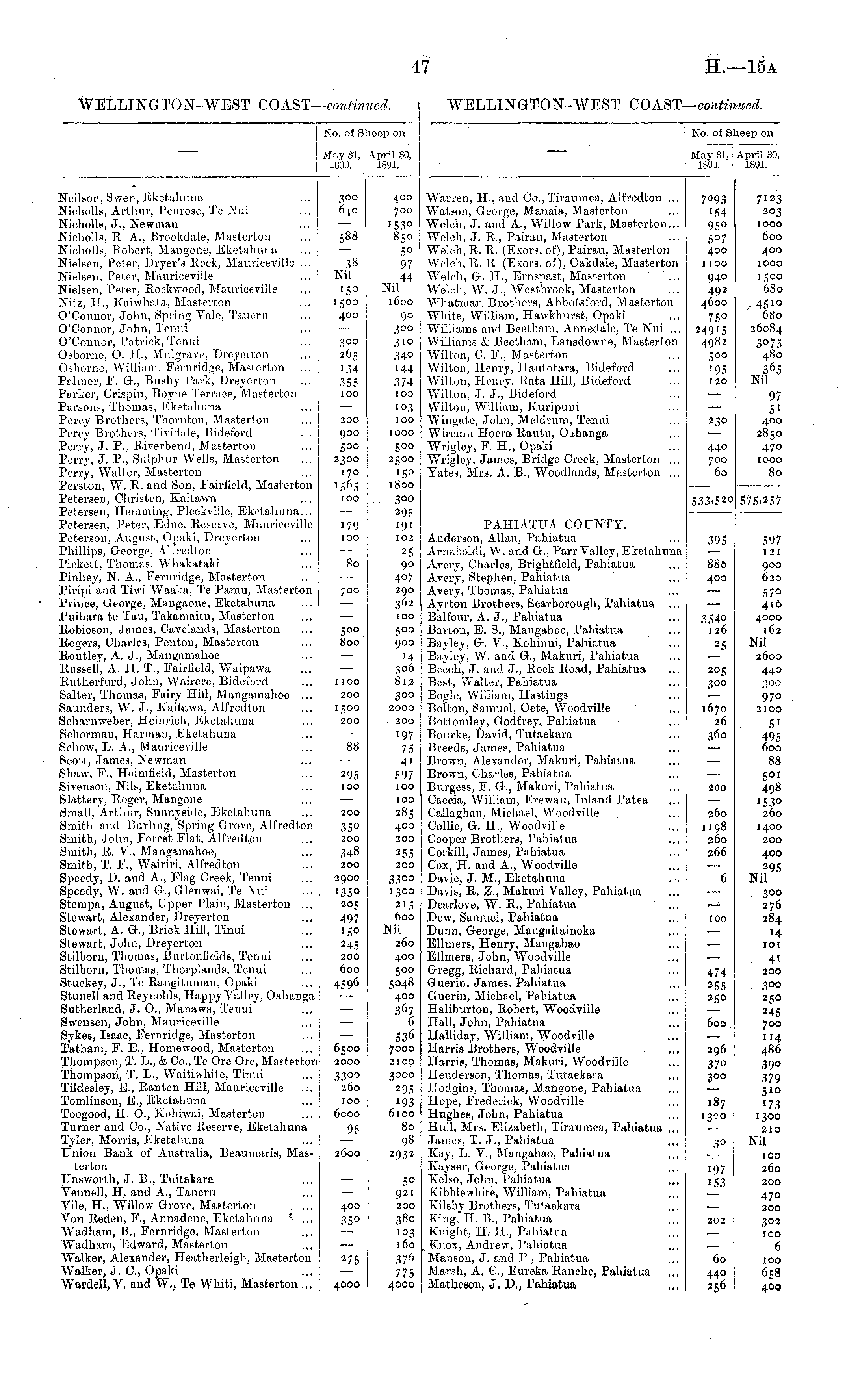 No. of Sheep on May 31, April 30, IB'JJ. 1891. Neilson, Swen, Eketahuna Nicholls, Arthur, Penrose, Te Nui Nicholle, J., Newman .Nicliolls, R. A., Brookdale, Masterton Nieholls, Robert, Mangone, Eketahuna Nielsen, Peter, Dryer's Bock, Mauriceville ... Nielsen, Peter, Maurieeville Nielsen, Peter, Rock wood, Maurieeville Nilz, H., Kaiwhata, Masterton O'Connor, Jolm, Spring Vale, Taueru O'Connor, John, Tenni O'Connor, Patrick, Tenui Osborne, O. II., Mulgrave, Dreyeiton Osborne, William, Fernridge, Mastevton Palmer, P. G., Bushy Park, Dreycrton Parker, Crispin, Boyne Terrace, Masterton Parsons, Thomas, Eketaliuna Percy Brothers, Thornton, Masterton Percy Brothers, Tividale, Bideford ... Perry, J. P., Riverbend, Masterton Perry, J. P., Sulphur Wells, Masterton Perry, Walter, Masterton Perston, W. R. and Son, Fairfield, Masterton Petersen, Christen, Kaitawa Peterson, Hemming, Plcckville, Eketaliuna... Petersen, Peter, Edtic. Reserve, Maurieeville Peterson, August, Opaki, Dreyerton Phillips, Greorge, Alfredton Pickett, Thomas, Whakataki Pinhey, N. A., Fernridge, Masterton Piripi and Tiwi Waaka, Te Pamu, Masterton Prince, George, Mangaone, Eketahuna Puihara te Tau, Takamaitu, Masterton Robieson, James, Cavelands, Masterton Rogers, Charles, Penton, Masterton Routley, A. J., Mangamahoe Russell, A. II. T., Fairfield, Waipawa Rutherfurd, John, Wairere, Bidoford Salter, Thomas, Fairy Hill, Mangamahoo ... Saunders, W. J., Kaitawa, Alfredton Scharnweber, Heinrioh, Eketahuna Schorman, Harman, Eketahuna Schow, Ij. A., Maurieeville Scott, James, Newman Shaw, F., Holmfleia, Masterfcon Sivenson, Nils, Eketaliuna Slattery, Roger, Mangone Small, Arthur, Sunnysido, Eketahuna Smith and Burling, Spring Grove, Alfredton Smith, John, Forest Flat, Alfredton Smith, R. V., Mangamahoe, Smith, T. F., Wairiri, Alfredton Speedy, D. and A., Flag Creek, Tenui Speedy, W. and G., Glenwai, Te Nui Stempa, August, Upper Plain, Masterton ... Stewart, Alexander, Dreyerton Stewart, A. G., Brick Hill, Tinui Stewart, John, Dreyerton Stilborn, Thomas, Burtonflelds, Tenui Stilborn, Thomas, Thorplands, Tenui Stuckey, J., Te Rangitumau, Opaki Stunell and Reynolds, Happy Valley, Oahanga Sutherland, J. O., Manawa, Tenui Swensen, Jolm, Maurieeville Sykes, Isaac, Fernridge, Masterton Tatham, F. E., Homewood, Masterton Thompson, T. L., & Co., Te Ore Ore, Masterton Thompson, T. L., Waitiwhite, Tinui Tildesley, E., Ranten Hill, Maurieeville Tomlinson, E., Ekeiahuna Toogood, H. O., Kohiwai, Masterton Turner and Co., Native Reserve, Eketaliuna Tyler, Morris, Eketahuna Union Bank of Australia, Beaumaris, Masterton Unsworth, J. B., Tuitakara Vermeil, H. and A., Taueru Vile, H., Willow Grove, Masterton Von Reden, F., Annadene, Eketahuna ' ... Wadham, B., Fernridge, Masterton Wadham, Edward, Masterton Walker, Alexander, Ileatherleigh, Masterton Walker, 3. C, Opaki Wardell, V. and W., Te Whiti, Masterton ... 3°° 640 588 38 Nil ■5° 1500 400 300 265 '34 355 100 200 500 500 2300 170 156S 100 •79 100 80 700 5 op 800 1100 200 1500 200 88 400 700 153° 85° 5° 97 44 Nil i6co 90 3°° 31° 34° 144 374 100 i°3 100 1000 500 2500 '5° 1800 30Q 295 191 102 25 90 407 290 362 100 500 900 14 306 812 300 2000 200 197 75 41 597 100 295 100 200 350 200 348 200 100 285 400 200 255 200 2900 '35° 205 497 150 M5 200 600 4596 33°° 1300 Z15 600 Nil 260 400 S oo 5048 400 367 6 536 7000 2100 6500 2000 33°° 260 100 6coo 3000 295 193 6100 80 98 2932 95 2600 400 350 5° 921 200 380 103 160 37 6 775 4000 275 4000