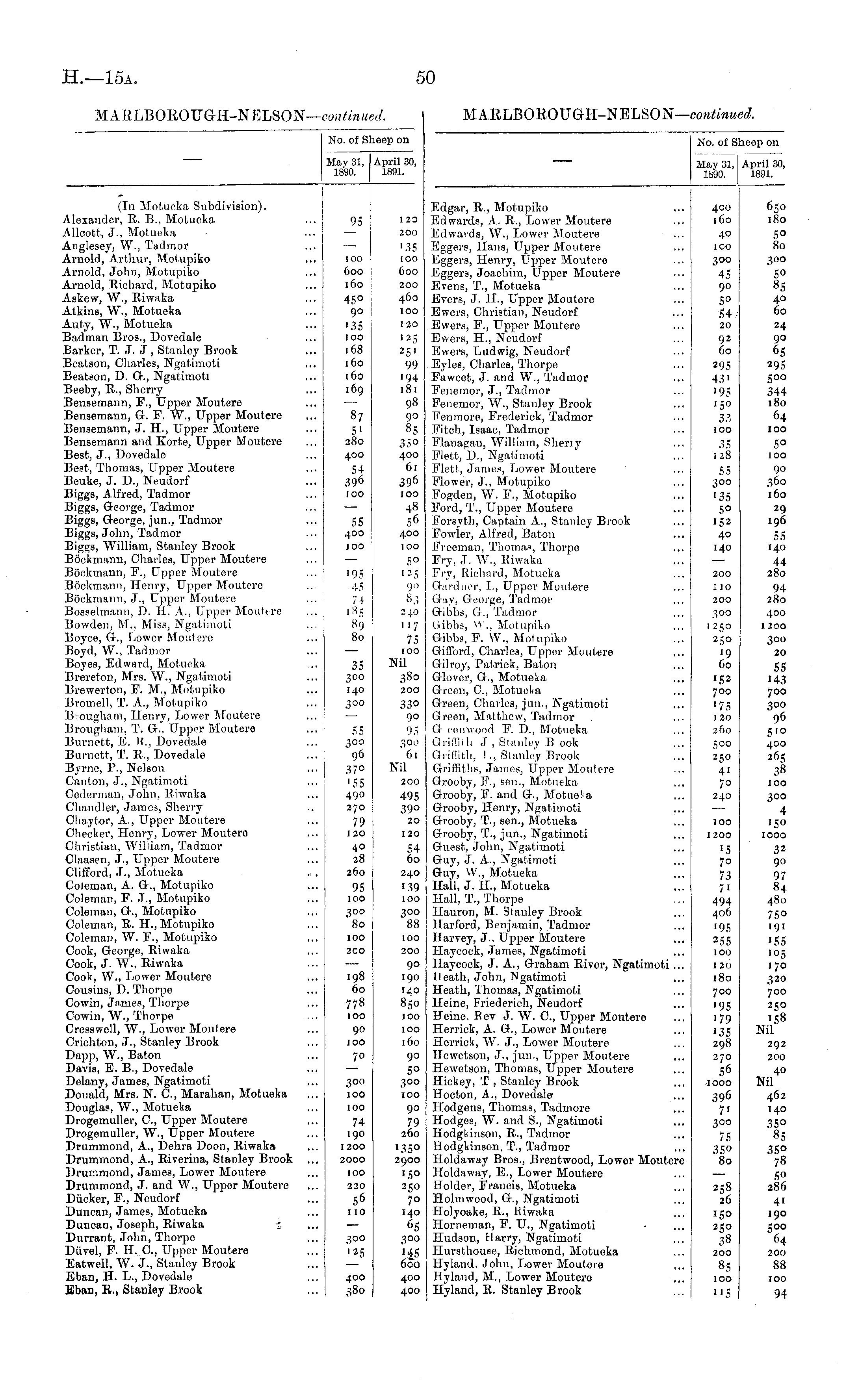 No. of SI May 31, 1890. tieep on April 30, 1801. Edgar, R., Motupiko Edwards, A.. R., Lower Moutere Edwards, W., Lower Moutere Eggers, Hans, Upper Moutere Eggers, Henry, Upper Moutere Eggers, Joachim, Opper Moulere Evens, T., Mofcueka Evers, J. H., Upper Moutere Ewers, Christian, Ncudorf Ewers, P., Upper Moutere Ewers, H., Neudorf Ewers, Ludwig, Neudorf Eyles, Charles, Thorpe Fawcet, J. and W., Tadmor Fenernor, J., Tadrnor Fenemor, W., Stanley Brook Eenmore, Frederick, Tadmor Fitch, Isaac, Tadmor Flanagan, William, Sheriy Flett, D., Ngatimoti Flett, tTattieSj Lower Moutero Flower, J., Motupiko Fogden, W. F., Motupiko Ford, T., Upper Moutere Forsyth, Captain A., Stanley Brook Fowler, Alfred, Baton Freeman, Thomas, Thorpe Fry, J. W., Eiwaka Fry, Richard, Motueka Gardner, L, Upper Moutere G-ay, George, Tadmor Gibbs, G., Tadmor Uibbs, W ., Motupiko Gibbs, F. W., Motupiko Gifford, Charles, Upper Moutere Gilroy, Patrick, Baton Glover, G., MotueVa Green, 0., Motueka Green, Charles, jun., Ngatimoti Green, Malthew, Tadmor G romvood F. I)., Motueka Griffith J , Stanley B ook Griffith, !., Stanley Brook Griffiths, James, Upper Moulere Grooby, F., sen., Motueka Grooby, F. and G., Motue! a Grooby, Henry, Ngatimoti Grooby, T., sen., Motueka Grooby, T., jun., Ngatimoti Guest, John, Ngatimoti Guy, J. A., Ngatimoti Guy, W., Motueka Hall, J. H., Motueka Hall, T., Thorpe Hanron, M. Stanley Brook liarford, Benjamin, Tadmor Harvey, J.. Upper Moutere Haycock, James, Ngatimoti Haycock, J. A., Graham River, Ngatimoti ... Heath, John, Ngatimoti Heath, 'Ihomas, Ngatimoti Heine, Friederich, Neudorf Heine, Pev J. W. C, Upper Moutere Herrick, A. G., Lower Moutere Herrick, W. J., Lower Moutere TIewetson, J., jun., Upper Moutere Hewetson, Thomas, Upper Moutere Hickey, T , Stanley Brook Hocton, A., Dovedale Hodgens, Thomas, Tadmore Hodges, W. and S., Ngatimoti Hodgldnson, E., Tadmor ITodgkinson, T., Tadmor Holdaway Bros., Brentwood, Lower Moutere Holdaway, E., Lower Moutere Holder, Francis, Motueka Holmwood, G., Ngatimoti Holyoake, £>., Kiwaka Horneman, F. U., Ngatimoti Hudson, Harry, Ngatimoti Hursthouse, Richmond, Motueka Hyland. John, Lower Moutere tiyland, M., Lower Moutere Hyland, R. Stanley Brook 400 160 40 ico 650 180 5° 80 300 45 90 5° 54 20 300 5° 85 40 60 92 60 295 43i '95 150 33 100 35 128 24 90 65 295 500 344 180 64 100 55 300 135 5° 152 40 140 200 1 io 200 300 1250 250 '9 60 5° 100 90 360 160 29 196 55 140 44 280 94 280 400 1200 300 20 55 '43 700 300 96 5'° 400 265 38 100 300 152 700 •75 120 260 500 250 4' 70 240 100 1200 "5 70 73 71 494 406 '95 255 100 4 'SO 1000 32 90 97 84 480 75° 191 iS5 105 170 320 700 25° •58 Nil 120 180 700 195 179 •35 298 270 56 1000 396 7" 300 75 35° 80 292 200 40 Nil 462 140 35° 85 35° 78 50 286 41 190 500 64 200 88 258 26 150 250 38 200 85 100 US 100 94