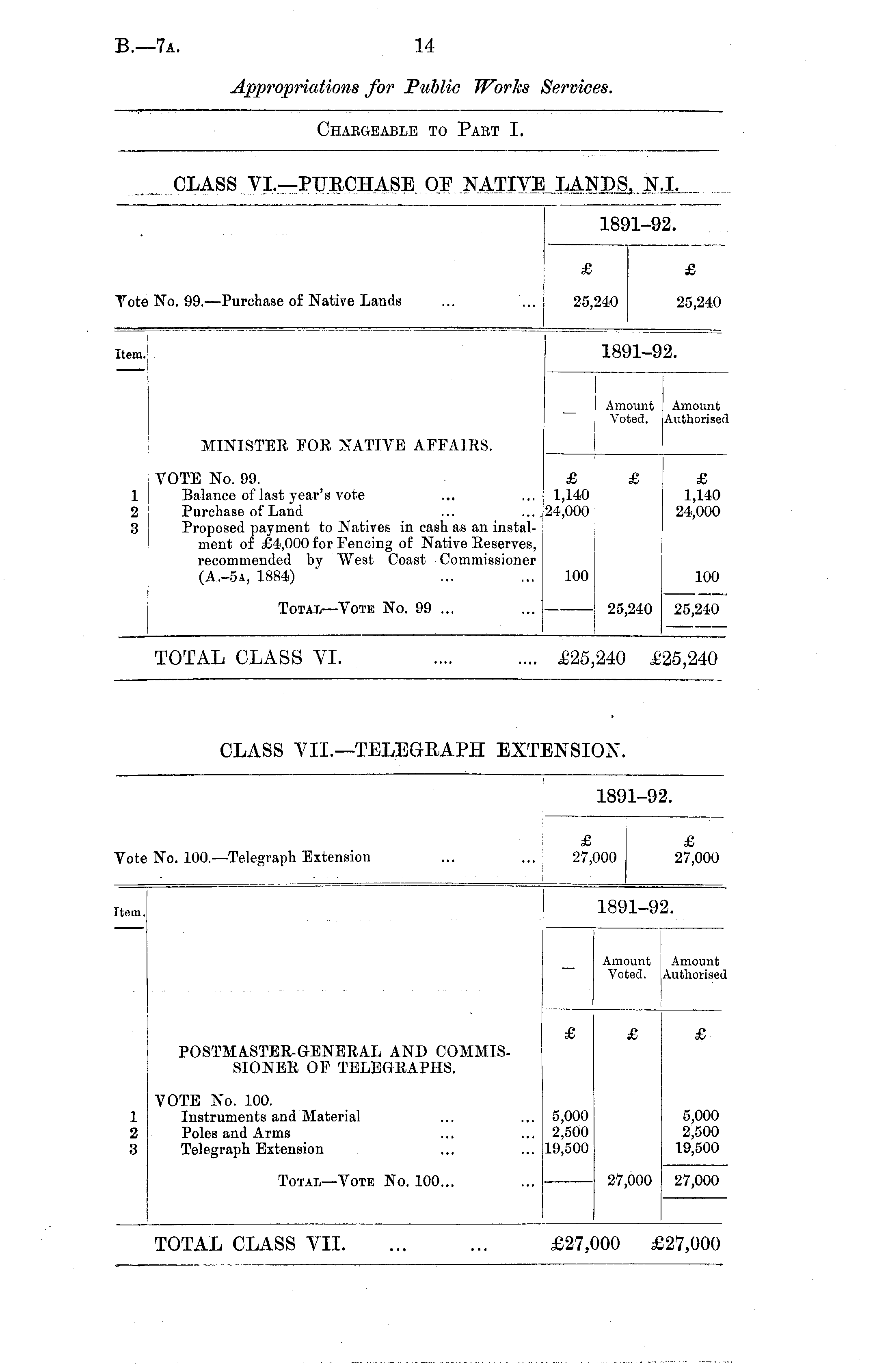 IS a-92. te ) No. 99. —Purchase of Native Lands £ £ Yob 25,240 25,240 Item. 18' U-92. MINISTER FOR NATIVE AFFAIRS. Amount Amount Voted. Authorised I l 2 3 VOTE No. 99. Balance of last year's vote Purchase of Land ... Proposed payment to Natives in cash as an instalment of £4,000 for Fencing of Native Reserves, recommended by West Coast Commissioner (A.-5a, 1884) £ 1,140 24,000 £ 1,140 24,000 100 100 Total—Vote No. 99 ... 25,240 25,240 TOTAL CLASS VI. £25,240 25,240