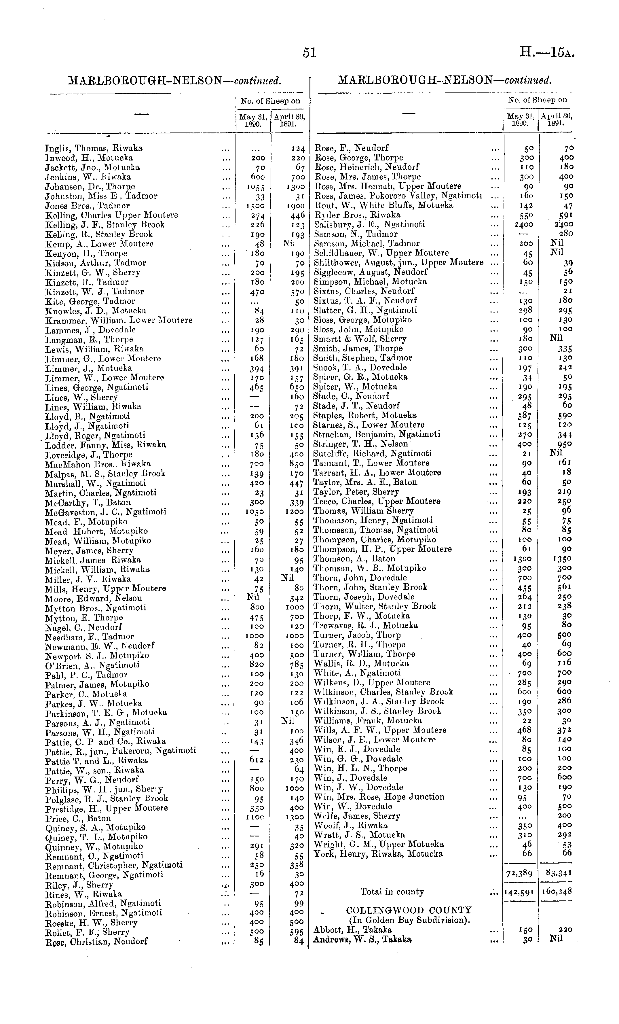 No. of Shoop on May 31, April 30, 1830. 18<J1. Rose, P., Neudorf Eose, George, Thorpe Rose, Heinerieh, Neudorf Rose, Mrs. James, Thorpe Ross, Mrs. Hannah, Upper Moutere Ross, James, Pokororo Valley, Ngatimoli ... Rout, W., White Bluffs, Motueka Eyder Bros., Riwuka Salisbury, J. E., Ngatimoti Samson, N., Tadmor Samson, Michael, Tadmor Schildhauer, W., Upper Moutere Shilthower, August, jun., Upper Moutere ... Sigglecow, AugiiBt, Neudorf Simpson, Michael, Motueka Sixtus, Charles, Neudorf Sixlus, T. A. F., Neudorf Slatter, G. H., Ngatimoti Sloss, George, Motupiko Sloss, John, Motupiko Smartt & Wolf, Sherry Smith, James, Thorpe Smith, Stephen, Tadmor Snook, T. A., Dovedale Spicer, Gr. R., Motueka Spieer, W., Motueka Stade, C, Neudorf Stade, J. T., Neudorf Staples, Robert, Motueka Starnes, S., Lower Moutere Strachan, Benjamin, Ngatimoti Stringer, T. H., Nelson Suleliffe, Richard, Ngatimoti Tannant, TV, Lower Moutere Tarrant, H. A., Lower Moutere Taylor, Mrs. A. B., Baton Taylor, Peter, Sherry Teece, Charles, Upper Moutere Thomas, William Sherry Thomason, Henry, Ngatimoti Thomason, Thomas, Ngatimoti Thompson, Charles, Motupiko Thompson, H. P., Upper Moutere Thomson, A., Baton Thomson, VV. B., Motupiko Thorn, John, Doredale Thorn, John, Stanley Brook Thorn, Joseph, Dovedale Thorn, Walter, Stanley Brook Thorp, P. W., Motueka Trevvavas, R. J., Motueka Turner, Jacob, Thorp Turner, R. H, Thorpe Turner, William, Thorpe Wallis, R. L\, Motuekn White, A., Ngatimoti Wilkens, I)., Upper Moutere Wilkinson, Charles, Stanley Brook Wilkinson, J. A , Stanley Brook Wilkinson, J. S., Stanley Brook Williams, Frank, Motueka Wills, A. P. W., Upper Moutere Wilson, J. E., Lower Moutere Win, E. J., Dovedale Win, G. G., Dovedale Win, H. L. N., Thorpe Win, J., Dovedale Win, J. W., Dovedale Win, Mrs. Rose, Hope Junction Win, W., Dovedale Wolfe, James, Sherry Woolf, J., Rivvaka Wratt, J. 8., Motueka Wright, G. M., Upper Motueka York, Henry, Riwaka, Motueka 5° 300 110 300 90 160 142 55° 2400 200 45 60 45 150 130 298 100 90 180 300 110 197 34 190 295 48 587 12; 270 400 2[ 90 40 60 193 2 2O 25 55 80 7° 400 180 400 90 150 47 591 2400 280 Nil Nil 39 56 '5° 21 180 295 130 100 Nil 335 130 242 5° 195 295 60 59° 120 341 95° Nil 161 18 5° 219 250 96 75 5 100 90 ■35° 300 700 561 250 238 3° 80 100 61 1300 300 700 455 264 212 130 95 400 40 1 400 69 700 285 600 ; 190 : 35° j 22 468 80 85 100 200 700 130 95 400 500 69 600 116 700 290 600 286 300 3° 37 2 140 100 100 200 600 190 70 500 200 400 292 53 66 35° 310 46 66 7 2>389 83>34i 160,248 Total in county 142,591 COLLINGWOOD COUNTY (In Golden Bay Subdivision). Abbott, H., Takaka A»drewe, W. S., Takaka '5° 3° 220 Nil