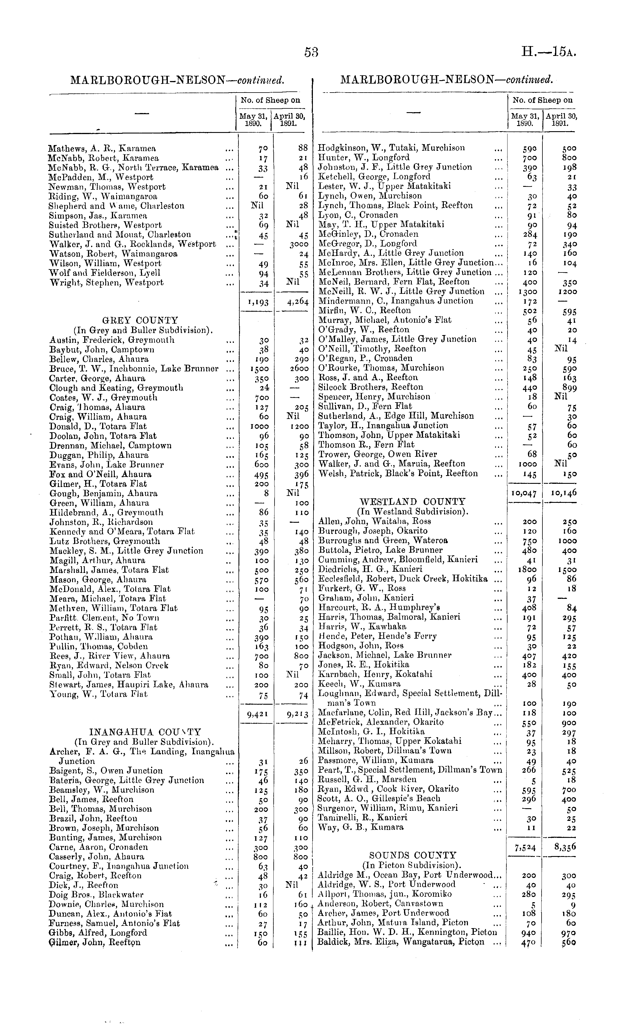 No. of Sheep on May 31, April 3C 1890. 1891. April 30, 1891. Hodgkinson, W., Tutaki, Murcliison Hunter, W., Longford Johnston, J. F., Little Grey Junction Ketchell, George, Longford Lester, W. J., Upper Matakitaki Lynch, Owen, Murcliison Lynch, Thomas, Black Point, Reef ton Lyon, C, Cronaden May, T. II., Upper Matakitaki McGinley, D., Cronaden McGregor, D., Longford McIIardy, A., Little Grey Junction Mclnroe, Mrs. Ellen, Little Grey Junction... McLennan Brothers, Little Grey Junction ... McNeil, Bernard, Fern Flat, Reeftou McNeill, R. W. J., Little Grey Junction ... Mindermann, C, Inangahua Junction Mirfln, W. 0., Reefton Murray, Michael, Antonio's Flat O'Grady, W., Reefton O'Malley, James, Little Grey Junction O'Neill, Timothy, Reefton O'Regan, P., Cronaden O'Rourke, Thomas, Murchison Ross, J. and A., Reefton Silcock Brothers, Reefton Spencer, Henry, Murcliison Sullivan, D., Fern Flat Sutherland, A., Edge Hill, Murchison Taylor, H., Inangahua Junction Thomson, John, Upper Matakitaki Thomson R., Fern Flat Trowel", George, Owen River Walker, J. and G., Maruia, Reefton Welsh, Patrick, Black's Point, Reefton 59° 700 39° 63 30 72 9' 90 284 72 140 16 120 400 1300 172 502 56 40 40 45 83 250 148 440 18 60 5 00 800 198 21 33 40 52 80 94 190 34° 160 104 35° 1200 595 41 20 >4 Nil 95 59° 163 899 Nil 75 30 60 60 60 57 5 2 68 1000 5° Nil "5° 10,146 WESTLAND COUNTY (In Westland Subdivision). Allen, John, Waitaha, Ross Burrougli, Joseph, Okarito Burroughs and Green, Wateroa Buttola, Pietro, Lake Brunner Cumming, Andrew, Bloomfield, Kanieri Diedrichs, H. G., Kanieri Ecclesfield, Robert, Duck Creek, Hokitika ... Furkert, G. W., Ross Graham, John, Kanieri .., Harcourt, R. A., Humphrey's Harris, Thomas, Balmoral, Kanieri Harris, W., Kawhaka Hende, Peter, Ilende's Ferry Hodgson, John, Ross Jackson, Michael, Lake Brunner Jones, R. E., Hokitika Karnbach, Henry, Kokalahi Keech, W-, Kumara Louglman, Edward, Special Settlement, Dillman's Town Macfarlane, Colin, Red Hill, Jackson's Bay... McFelrick, Alexander, Okarito Mclntosh, G. I., Hokitika Meharry, Tliomas, Upper Kokatahi Millson, Robert, Dillinan's Town Passmore, William, Kumara Peart, T., Special Settlement, Dillman's Town Russell, G. H., Marsden Ryan, Edwd, Cook Eiver, Okarito Scott, A. O., Gillespie's Beach Surgenor, William, Rimu, Kanieri Taminelli, R., Kanieri Way, G. B., Kumara 10,047 200 120 75° 480 41 1800 96 12 37 408 191 72 95 3° 407 182 250 160 1000 400 3' 1500 86 18 84 295 57 125 22 420 '55 400 5° 400 28 100 118 55° 37 95 23 49 266 190 100 900 297 18 18 40 525 18 700 400 5° 25 22 5 595 296 3° 11 SOUNDS COUNTY (In Picton Subdivision). Aldridge M., Ocean Bay, Port Underwood... Ahiridge, W. 8., Port Underwood ' ... Allport, Thomas, jun., Koromiko Anderson, Robert, Canvastown Archer, James, Port Underwood Arthur, John, M«tura Island, Picton Baillie, Hon. W. D. H., Kennington, Picton Baldick, Mrs. Eliza, Wangatarua, Picton ... 7>524 8,356 200 40 280 5 108 7° 940 470 300 40 295 9 180 60 970 560
