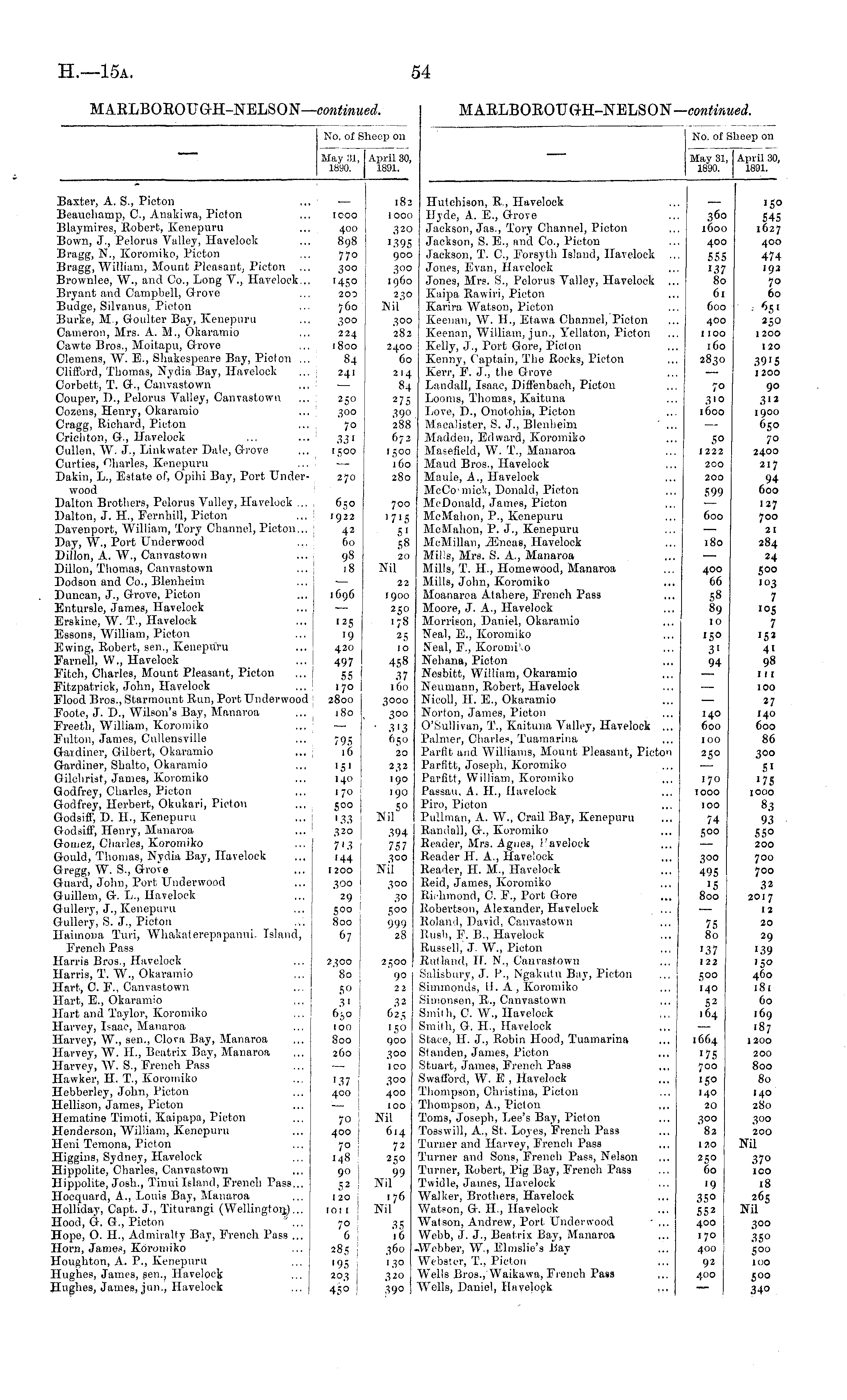 No. of Sheep on May 81, April 30, 1890. 1891. Baxter, A. S., Picton Beauchamp, C, Anakiwa, Picton Blajmires, llobert, Kenepura Bown, J., Pelorus Valley, Havelock Bragg, N., Koromiko, Picton Bragg, William, Mount Pleasant, Picton Brownlce, W., and Co., Long V., Havelock... Bryant and Campbell, Grove Budge, Silvanus, Picton Burke, M., Goulter Bay, Kenepuru Cameron, Mrs. A. M., Okaramio Cawte Bros., Moitapu, Grove Clemens, W. E., Shakespeare Bay, Piolon ... Clifford, Thomas, Nydia Bay, Haveloek Corbett, T. G., Canvastown ... Couper, D., Pelorus Valley, Canvastown Cozens, Henry, Okaramio ... Cragg, Richard, Picton Crichton, G., Havelock Cullen, W. J., Linkvvater Dale, Grove Curties, Charles, Kenepuru Dakin, L., Estate of, Opihi Bay, Port Underwood Dalton Brotliers, Pelorus Valley, Havelock ... Dalton, J. H., Fernliill, Picton Davenport, William, Tory Channel, Picton... Day, W., Port Underwood Dillon, A. W., Canvastown Dillon, Thomas, Canyastown ... Dodson and Co., Blenheim Duncan, J., Grove, Picton Entursle, James, Havelock Erskine, W. T., Haveloek ... j Essons, William, Picton Evving, Kobert, sen., Kenepurn Farnell, W., Havelock ... I Fitch, Charles, Mount Pleasant, Picton ... Fitzpatrick, John, Havelock Flood Bros., Starmount Ban, Port Underwood Foote, J. D., Wilson's Bay, Manaroa Freetli, William, Koromiko Fulton, James, Cullensville Gardiner, Gilbert, Okaramio ... \ Gardiner, Shalto, Okaramio Gilchrist, James, Koiomiko Godfrey, Charles, Pieton Godfrey, Herbert, Okukari, Picton ... j Godsiff, D. H., Kenepuru Godsiff, Henry, Manaroa Gomez, Charles, Koromiko Gould, Thomas, Nydia Bay, Ilavelock Gregg, W. S., Grove Guard, John, Port Underwood Guillem, G. L., Havelook Gullery, J., Kenepuru ... | Gullery, S. J., Pieton Haimona Turi, Whakalerepnpanui. Island, French Pass Harris Bros., Havelock Harris, T. W., Okaramio Hart, C. F., Canvastown Hart, E., Okaramio Hart and Taylor, Koromiko ... ! Harvey, Isaac, Manaroa Harvey, W., sen., Clova Bay, Manaroa Harvey, W. H., Beatrix Bay, Manaroa Harvey, W. S., French Pass Hawker, II. T., Koromiko Hebberley, John, Picton Hellison, James, Picton Hematine Timoti, Kaipapa, Pieton Henderson, William, Kenepuru Heni Temona, Picton Higgins, Sydney, Haveloek Hippolite, Charles, Canvastown Hippolite, Josh., Tinui Island, French Pass... Hocquaid, A., Louis Bay, Manaroa Holliday, Capt. J., Titurangi (Wellington,)... Hood, G. G., Pieton Hope, O. BE., Admiralty Bay, French Pass ... Horn, James, Koromiko ... ! Houghton, A. P., Kenepuru ... j Hughes, James, sen., Havelock Hughes, James, jun., Havelock IOOO 400 898 770 300 '45° 200 760 300 224 1800 84 241 250 300 70 331 1500 270 6;o 1922 42 60 98 18 1696 I25 '9 420 497 55 170 2800 180 795 16 ■5 1 140 170 500 '33 320 7 }3 '44 1200 300 29 5°o 800 67 2^00 80 5° 31 650 100 800 260 ■37 400 70 ! 400 7° 148 90 ; 52 120 10 ! I 7° 6 285 '95 2°3 j 45° ,82 I 1 OOO 320 1395 900 : 300 1900 230 Hil goo 282 2400 'Co 214 84 275 390 288 672 1500 160 280 700 5' 58 20 Nil 22 1900 250 178 2 5 10 458 37 160 3000 300 • 313 650 20 232 190 190 SO Nil 1 394 757 goo Nil 300 3° 5°° 999 28 2500 90 22 32 62., 150 goo 300 100 300 400 100 Nil 6,4 72 250 99 Nil 176 Nil 35 16 360 '3° 320 39°