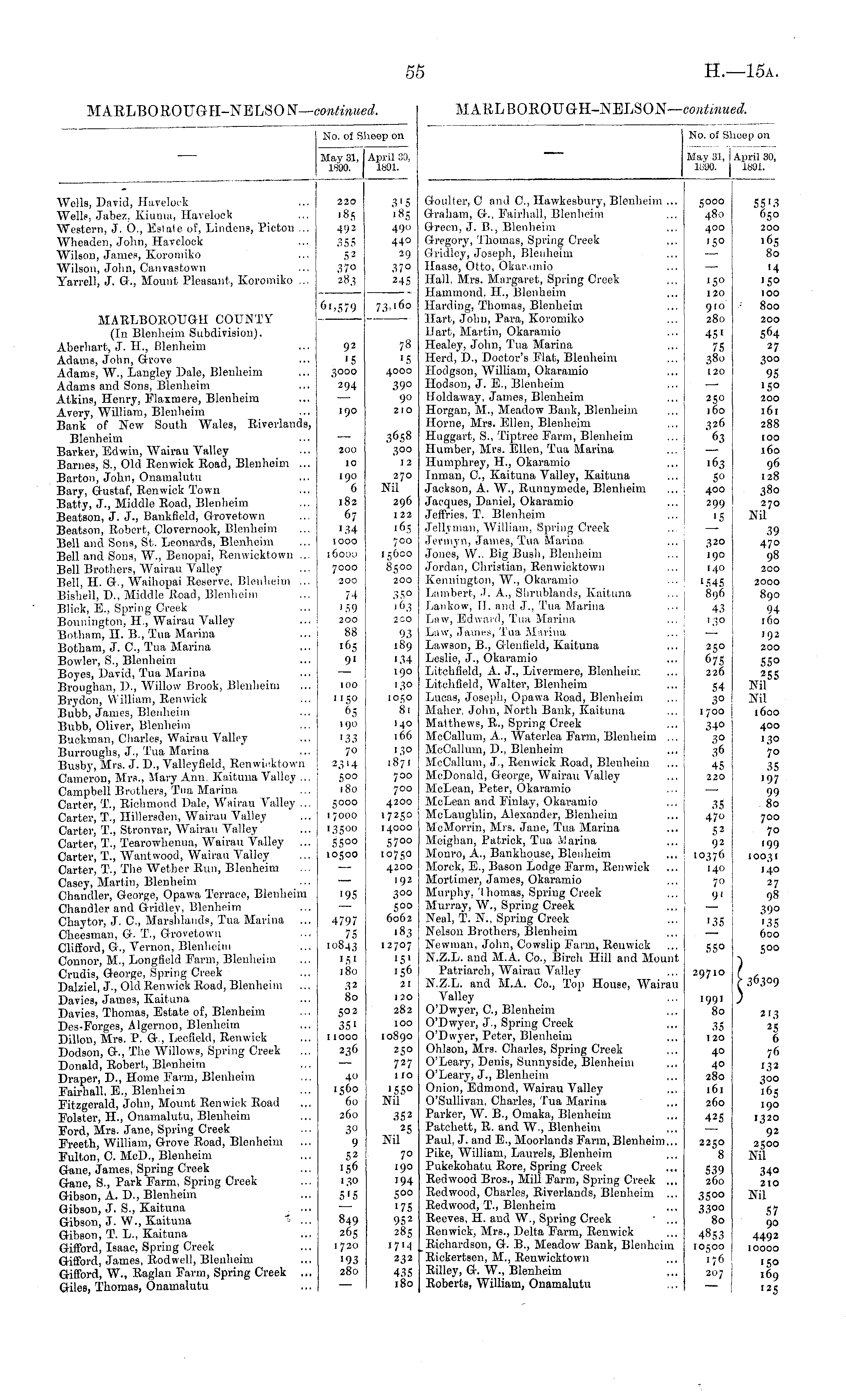 No. of Shoep on Way 31, I April 30, loUO. 1891. Goulter, C ami C, Hawkesbury, Blenheim ... Graham, G., Fairhall, Blenheim Green, J. B., Blenheim Grregory, 'Ihomas, Spring Creek Gridley, Joseph, Blenheim Haase, Otto, Okiuvunio Hall, Mrs. Margaret, Spring Creek Hammond, II., Blenheim Harding, Thomas, Blenheim Hart, John, Para, Koromiko If art, Martin, Okaraniio Healey, Jolin, Tua Marina Herd, D., Doctor's Flat, Blenheim Hodgson, William, Okaraniio Hodson, J. E., Blenheim Holdaway, James, Blenheim Horgan, M., Meadow Bank, Blenheim Home, Mra. Ellen, Blenheim Huggaut, S., Tiptree Farm, Blenheim Humber, Mrs. Ellen, Tua Marina Humphrey, H., Okaraniio Inman, C, Kaituna Valley, Kaituna Jackson, A. W., Runnymede, Blenheim Jacques, Daniel, Okaramio Jeffries, T. Blenheim Jellyman, William, Spring Creek Jermyn, James, Tua Marina Jones, W.. Big Bush, Blenheim Jordan, Christian, Renwicktown Kennington, W., Okaramio Lambert, •'. A., Shrublanda, Kaituna Lankow, II. and J., Tua Marina Law, Edward, Tua Marina Law, James, Tua Marina Lawson, B., Glenfield, Kaituna Leslie, J., Okaramio Litchfield, A. J., Livermere, Blenheim Litchfield, Walter, Blenheim Lucas, Joseph, Opawa lioad, Blenheim Maher, John, North Bank, Kaituna Matthews, R., Spring Creek McCallum, A., Wat-erica Farm, Blenheim ... McCallum, D., Blenheim MeCallum, J., Renwiok Road, Blenheim McDonald, George, Wairau Valley McLean, Peter, Okaramio McLean and Finlay, Okaramio McLaughlin, Alexander, Blenheim MeMorrin, Mrs. Jane, Tua Marina Mcighan, Patrick, Tua Marina Monro, A., Bankhouse, Blenheim Morck, E., Bason Lodge Farm, Renwick Mortimer, James, Okaramio Murphy.. I homas, Spring Creek Murray, W., Spring Creek Neal, T. N., Spring Creek Nelson Brothers, Blenheim Newman, John, Cowslip Farm, Renwick N.Z.L. and M.A. Co., Birch Hill and Mount Patriarch, Wairau Valley N.Z.L. and M.A. Co., Top House, Wairau Valley O'Dwyer, C, Blenheim O'Dwyer, J., Spring Creek O'Dwyer, Peter, Blenheim Ohlson, Mrs. Charles, Spring Creek O'Leary, Denis, Sunnyside, Blenheim O'Leary, J., Blenheim Onion, Edmond, Wairau Valley O'Sullivan, Charles, Tua Marina Parker, W. B., Omaka, Blenheim Patchett, R. and W., Blenheim Paul, J. and E., Moorlands Farm, Blenheim.., Pike, William, Laurels, Blenheim Pukekohatu Rore, Spring Creek Redwood Bros., Mill Farm, Spring Creek ... Redwood, Charles, Riverlands, Blenheim ... Redwood, T., Blenheim Reeves, H. and W., Spring Creek ' ... Renwick, Mrs., Delta Farm, Renwick Richardson, G. B., Meadow Bank, Blenheim Rickertsen, M., Renwicktown Rilley, G. W., Blenheim Roberts, William, Onamalutu 5 ooo 480 400 ■5° 150 120 910 280 45' 75 380 120 250 160 J>3 163 5° 400 299 '5 320 190 140 ■545 896 43 130 250 675 226 54 .?o 1700 34° 3° 36 45 220 55'3 650 200 ■65 80 '4 '5° 100 800 200 564 27 300 95 "5° 200 161 288 100 160 96 128 380 270 Nil 39 47° 98 200 2000 890 94 160 192 200 55° 255 Nil Nil 1600 400 13° 7° 35 '97 99 80 35 470 92 10376 140 7" 9 1 700 70 199 10031 140 27 98 39° ■35 600 '35 55° 500 29710 r36309 1991 80 35 120 40 40 280 161 260 425 213 25 6 7" 132 300 '65 190 1320 92 2500 Nil 2250 8 539 260 35°° 33°° 80 4853 10500 176 207 34° 210 Nil 57 90 4492 10000 ■5° 169 I25