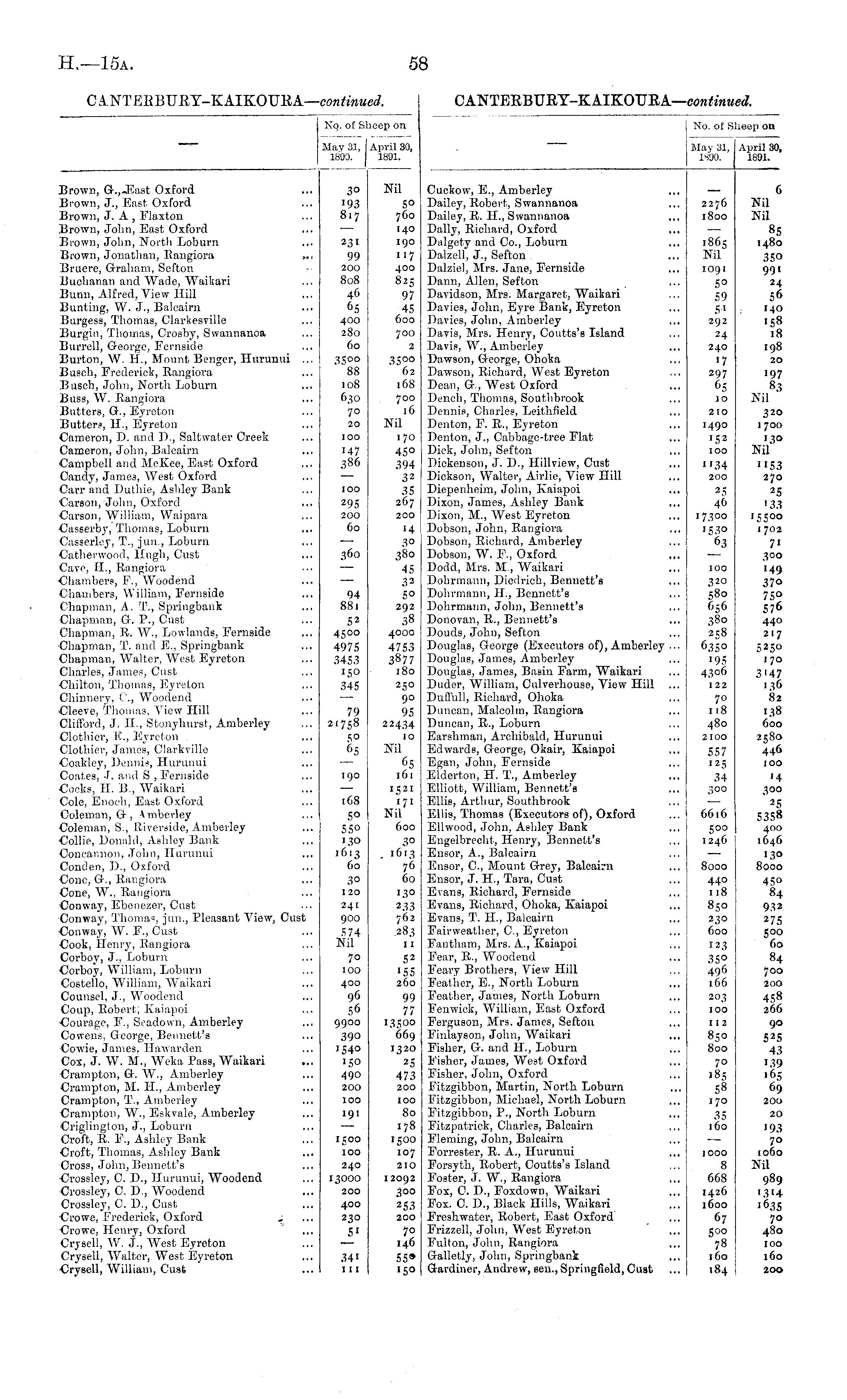 No. of Sheep on May 31, April 30, 1800. 1891. Brown, G.,-East Oxford Brown, J., East Oxford Brown, J. A , Flaxton Brown, John, East Oxford Brown, John, North Loburn Brown, Jonathan, Rangiora >«> Bruere, Graham, Sefton Buchanan and Wade, Wailsari Bunn, Alfred, View Hill Bunting, W. J., Balcaim Burgess, Thomas, Clarkesville Burgin, Thomas, Crosby, Swannanoa Burrell, George, Fernside Burton, W. H., Mount Benger, Hurunui ... Busoh, Frederick, Rangiora Busch, John, North Loburn Buss, W. Rangiora Butters, G., Eyreton Butters, H., Eyretou Cameron, D. and I)., Saltwater Oreelc Cameron, John, Baleairn ... Campbell and McKee, East Oxford Candy, James, West Oxford Carr and Buthie, Ashley Bank Carson, John, Oxford Carson, William, Waipava Casserby, Thomas, Loburn ... Casserley, T., jun., Loburn Cathei'wood, Hugh, Cust Cave, II., Ra.ngiora Chambers, F., Woodend Chambers, William, Fernside Chapman, A. T., Springbank Chapman, G. P., Cust Chapman, It. W., Lowlands, Fernaide Chapman, T. and E., Springbank Chapman, Walter, West Eyreton Charles, James, Cust Chilton, Thomas, Eyreton Chinnery, C, Woodend Cleeve, Thomas, View Hill Clifford, J. H., Stonyhurst, Amberley Clothier, E., Eyrelon Clothier, James, Clarkville Coakley, Dennis, Hurunui Coates, *r. and S , Fernside Cocks, II. B., Waikari Cole, Enoch, East Oxford Coleman, G., Amberley Coleman, S., Riverside, Amberley Collie, Donald, Ashley Bank Concannon, John, Hurunui Conden, D., Oxford Cone, G., Rangiora Cone, W., Rangiora Conway, Ebenezer, Cust Conway, Thomas, jun., Pleasant View, Cust Conway, W. F., Cust Cook, Henry, Rangiora Corboy, J., Loburn Corboy, William, Loburn Costello, William, Waikari Counsel, J., Woodend Coup, Robert; Ivaiapoi Courage, F., Seadown, Amberley Cowcns, George, Bennett's Cowie, James. Hawarden Cox, J. W. M., Weka Pass, Waikari Crampton, G. W., Amberley Crampton, M. H., Amberley Crampton, T., Amberley Crampton, W., Eskvale, Amberley Criglington, J., Loburn Croft, R. F., Ashley Bank Croft, Thomas, Ashley Bank Cross, John, Bennett's Crossley, C. D., Hurunui, Woodend Crossley, C. D., Woodend Crossley, C. 1)., Cust Crowe, Frederick, Oxford Ci'owe, Henry, Oxford ... Crysell, W. J., West Eyreton Crysell, Walter, West Eyreton Crysell, William, Cust 3° '93 !l 7 231 99 200 808 46 65 400 280 60 35°° 88 108 630 70 20 100 147 386 100 295 200 60 360 94 881 52 4500 4975 3453 i.S° 345 79 21758 5° (>5 Nil ;6o [40 190 117 400 825 97 45 600 ;oo 2 35°° 62 168 16 Nil 170 45° 394 32 35 267 200 '4 3° 380 45 32 5° 292 38 4000 4753 3877 180 250 90 95 2 2434 10 Nil 161 1521 171 Nil 600 3° 1613 76 60 130 233 762 .283 11 5 2 ■55 260 99 77 '350° 669 1320 25 473 200 100 80 178 1500 107 210 190 168 5° 55° 130 J G 13 60 3° 120 241 900 S74 Nil 7° 100 400 96 56 9900 390 1540 "5° 490 200 100 191 1500 100 240 13000 200 400 230 51 12092 300 253 200 7° 146 55° "5° 34 > 111