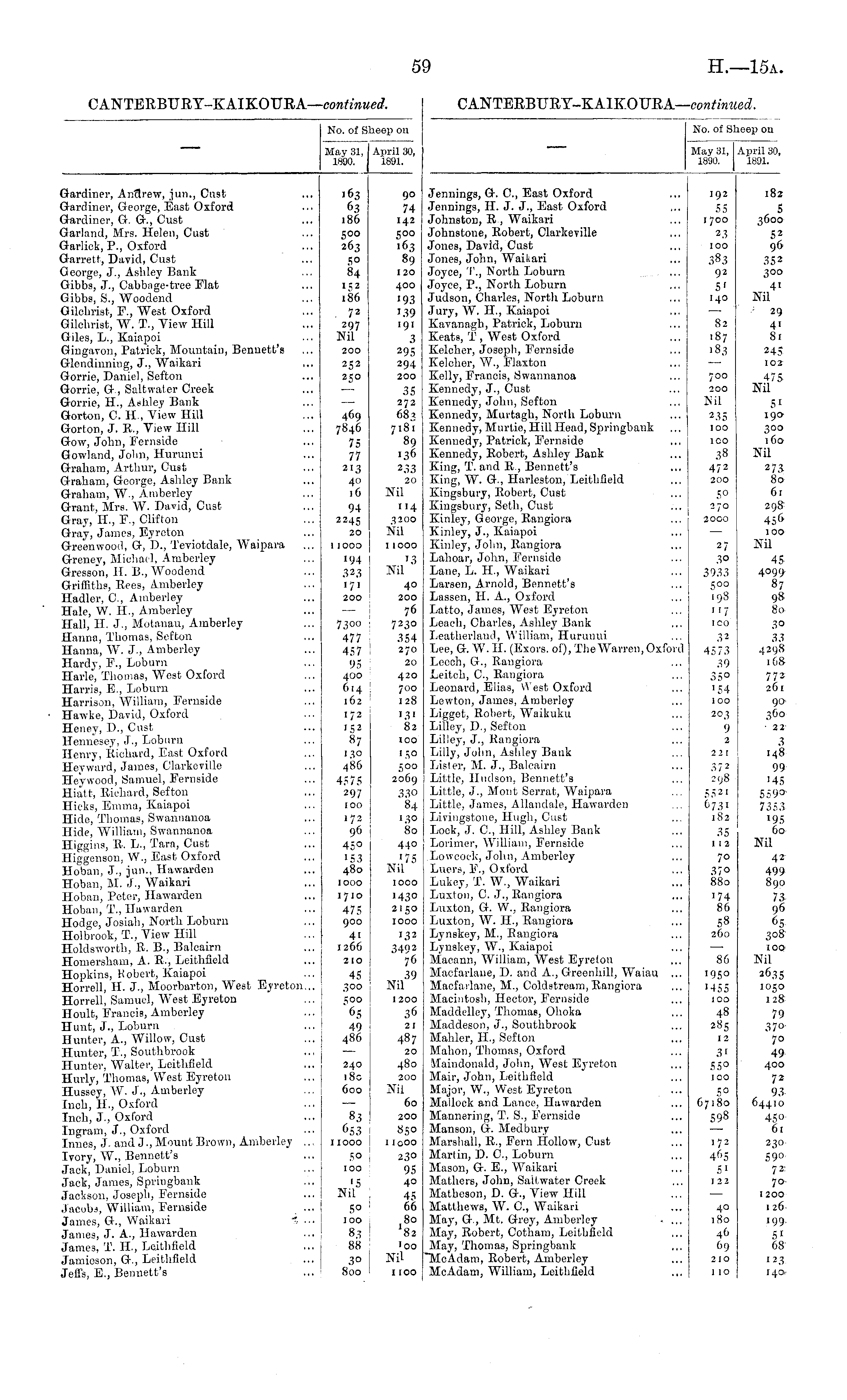 No. of Sheop on May 81, 1890. April 30, i8Ul. Gardiner, Anflrew, jun., Oust Gardiner, George, East Oxford Gardiner, G. &., Cust Garland, Mrs. Helen, Cust Garlick, P., Oxford Garrett, David, Cust George, J., Ashley Bank Gibbs, J., Cabbage-tree Flat Gibbs, S., Woodend Gilchrist, F., West Oxford Gilchrist, W. T., View Hill Giles, L., Kaiapoi Gingavon, Patrick, Mountain, Bennett's Glcndmning, J., Waikari Gorrie, Daniel, Sefton Gorrie, G, Saltwater Creek Gorrie, H., Ashley Bank Gorton, C. II., View Hill Gorton, J. B., View Hill Gow, John, Feniside Gowland, John, Hurunui Graham, Arthur, Cust Graham, George, Ashley Bank Graham, W., Amberley Grant, Mrs. W. David, Cust Gray, H., F., Clifton Gray, James, Eyrcton Greenwood, G, D., Teviotdale, Waipara Greney, Michael, Amberley Gresson, II. B., Woodend Griffiths, Keos, Amberley Hadler, C, Amberley Hale, W. H., Amberley Hall, H. J., Motanau, Amberley Hanna, Thomas, Sefton Hanna, W. J., Amberley Hardy, F., Loburn Harle, Thomas, West Oxford Harris, E., Loburn Harrison, William, Fernside Hawke, David, Oxford Heney, D., Cust Henncsey, J., Loburn Henry, Richard, East Oxford Hey ward, James, Clarkeville Hey wood, Samuel, Fernside Hiatt, llirhard, Sefton Hicks, Emma, Kaiapoi Hide, Thomas, Swannanoa Hide, William, Swannanoa Higgins, Ii'- Ij-> Tara, CuBt Higgenson, W., East Oxford Hoban, J., jun., Hawarden Hoban, M. J., Waikari Hoban, Peter, Hawarden Hoban, T.j Hawarden Hodge, Josiah, North Loburn Holbrook, T., View Hill Holdsworth, R. B., Balcairn Homersham, A. B., Leithfield Hopkins, Kobert, Kaiapoi Horrell, II. J., Moorbarton, West Eyreton... Horrell, Samuel, West Eyreton Hoult, Francis, Amberley Hunt, J., Loburu Hunter, A., Willow, Cust Hunter, T., Southbrook Hunter, Walter, Loithfleld Hurly, Thomas, West Eyreton Hussey, W. J., Amberley Inch, H., Oxford Inch, J., Oxford Ingram, J., Oxford limes, J. and J., Mount Brown, Amberley ... Ivory, W., Bennett's Jack, Daniel, Loburn Jack, James, Springbank Jackson, Joseph, Fernside Jacobs, William, Fernside James, G., Waikari ' ... James, J. A., Hawarden James, T. EL, Leithfield Jamieson, G., Leithfield Jeffs, E., Bennett's .63 186 500 263 5° 84 186 . 7 2 2Q7 Nil 200 252 250 469 7846 75 77 213 40 16 94 2245 20 11000 194 VZ I?' 200 7300 477 457 95 400 614 162 172 152 87 130 486 4575 297 100 172 96 45° 153 480 1000 1710 475 900 41 1266 90 74 142 500 163 89 120 400 193 139 191 3 295 294 200 35 272 68? 7i87 89 ,36 233 20 Nil 114 3200 Nil 11000 '3 Nil 40 200 76 7230 354 270 20 420 700 128 '31 82 loo no 500 2069 330 84 130 80 440 ■75 Nil 1000 '43° 2150 1000 210 45 300 5°o 65 49 486 240 18s 600 132 3492 76 39 Nil 1200 36 21 487 20 480 200 Nil 60 200 850 11000 23° 9S 40 45 66 80 82 loo Nil 1100 83 653 11000 5° 100 '5 Nil 5° 100 83 88 3° 800