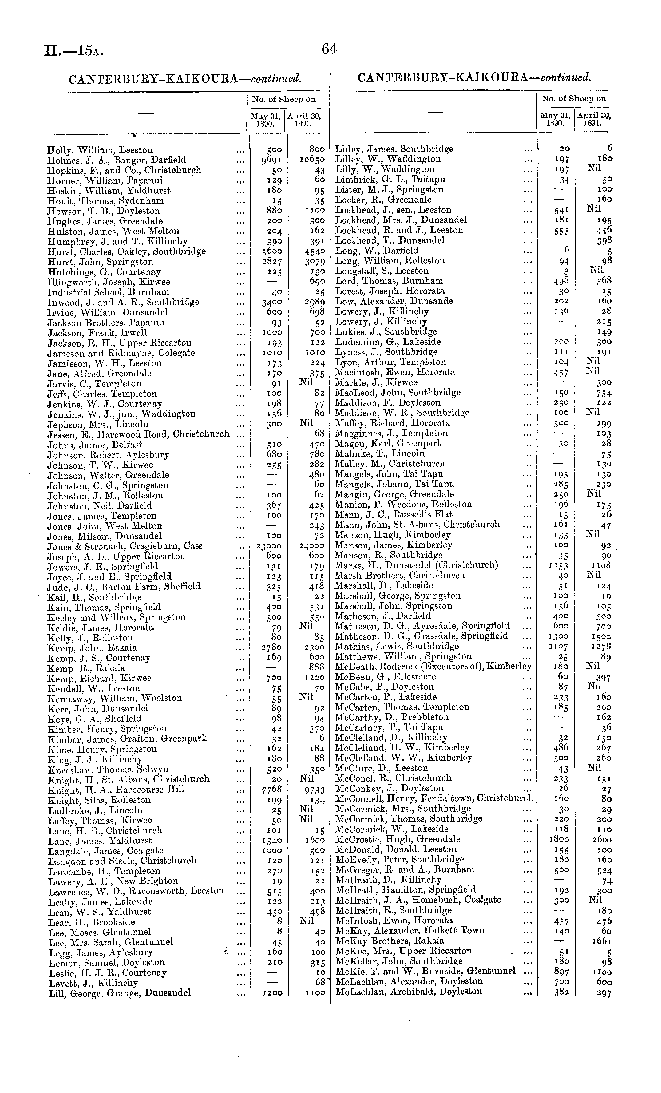 No. of Sheep on May 3], April 30, 1890. 1891. Lilley, James, Southbridge Lilley, W., Waddington Lilly, W., Waddington Limbrick, Q-. L., Taitapu Lister, M. J., Springston Locker, R., Greendale Lockhead, J., sen., Leeston Lockhead, Mrs. J., Dunsandel Lockhead, R. and J., Leeston Lockhead, T., Dunsandel Long, W., Darfield Long, William, Rolleslon Longstaff, S., Leeston Lord, Thomas, Burnham Lorelt, Joseph, Hororata Low, Alexander, Dunsande Lowery, J., Killinchy Lowery, J. Killincby Lukies, J., Southbridge Ludeminn, G-., Lakeside Lyness, J., Southbridge Lyon, Arthur, Templeton Macintosh, Ewen, Hororata Mackle, J., Kirweo MacLeod, John, Southbridge Maddison, F., Doyleston Maddison, W. R., Southbridge Maffey, Richard, Hororata Magginnes, J., Templeton Magon, Karl, Greenpark Malmkc, T., Lincoln Malley. M., Christehurch Mangels, John, Tad Tapu Mangels, Johann, Tai Tapu Man gin, George, G-reendale Manion, P. Weedons, Rolleston Mann, J. C, Russell's Flat Mann, John, St. Albans, Christehurch Manson, Hugh, Kimberley Manaon, James, Kimberley Manson, R., Southbridge Marks, H., Dunsandel (Christchurcb) Marsh Brothers, Christchurcb Marshall, D., Lakeside Marshall, George, Springston Marshall, John, Springston Matheson, J., Darfield Matheson, D. G-., Ayresdale, Springfield Matheson, D. Or., G-rassdale, Springfield Mathias, Lewis, Southbridge Matthews, William, Springston McBoath, Roderick (Executors of), Kimberley McBean, Gk, Ellesmere McCabe, P., Doyleston McCarten, P., Lakeside McCarten, Thomas, Templeton McCarthy, D., Prebbleton McCartney, T., Tai Tapu McClelland, D., Killinchy McClelland, H. W., Kimberley McClelland, W. W., Kimberley MeClure, D., Leeston McConel, R., Christohureh McConkey, J., Doyleston McConnell, Henry, Fendaltown, Christclrurch McCormick, Mrs., Southbridgo McCormick, Thomas, Southbridge McCormick, W., Lakeside McCrostio, Hugh, Greendale McDonald, Donald, Leeston McEvedy, Peter, Southbridge McGregor, R. and A., Burnham Mcllraith, D., Killinchy Mcllrath, Hamilton, Springfield Mcllraith, J. A., Homebush, Coalgate Mcllraith, R., Southbridge Mclntosh, Ewen, Hororata McKay, Alexander, Halkett Town McKay Brothers, Rakaia McKee, Mrs., Upper Riccarton . ... McKellar, John, Southbridge McKie, T. and W., Burnside, Gtlentunnel ... McLachlan, Alexander, Doyleston McLachlan, Archibald, Doyleston 20 •97 '97 34 54i 181 555 6 9-1 3 498 3° 202 136 200 111 104 457 '5° 230 100 300 3° 195 285 250 196 '5 161 133 100 35 '253 40 5 1 100 .56 400 600 180 Nil 5° 100 160 Nil 195 446 398 5 98 Nil 368 '5 160 28 215 149 300 191 Nil Nil 300 754 122 Nil 299 103 28 75 130 130 230 Nil 173 26 47 Nil 92 go 1108 Nil 124 10 '°5 300 700 1500 1278 89 Nil 1300 2107 25 180 60 87 233 '85 397 Nil 160 200 162 36 150 267 260 Nil •5 1 27 80 29 32 486 300 43 233 26 160 3° 220 118 1800 200 '55 180 500 110 2600 100 160 192 300 457 140 524 74 300 Nil 180 476 60 1661 5 98 1100 600 297 51 180 897 700 382