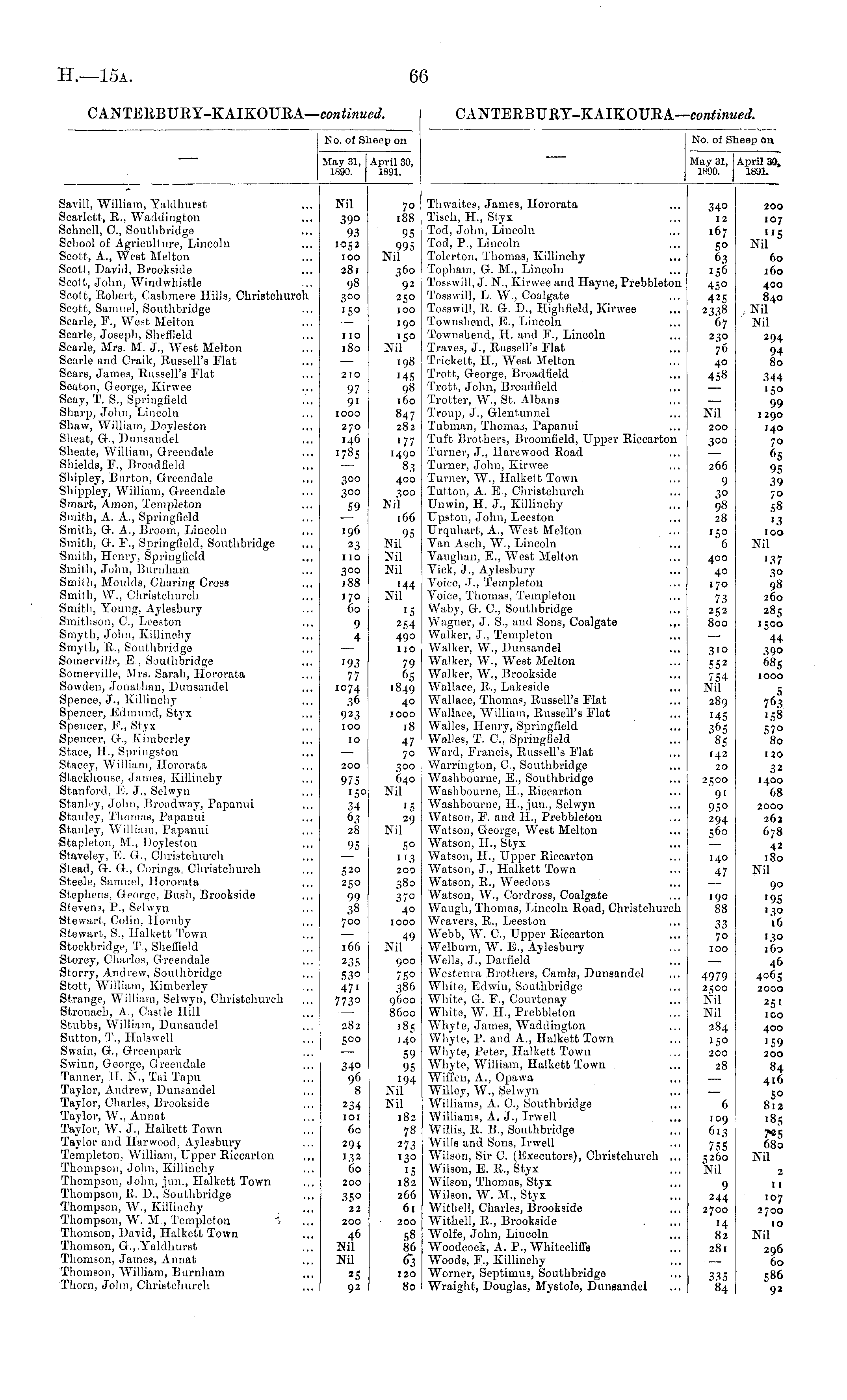 No. of Sheep on May 31, April 30, 1890. 1891. Savill, William, Ynldhurst Scarlett, R., Waddington Sclmell, C, Soutlibridge Seliool of Agriculture, Lincoln Scott, A., West Melton Scott, David, Brookside Scolt, John, Wind whistle Scott, Eobert, Cashmere Hills, Ckristchurch Scott, Samuel, Southbridge Searle, F., West Melton Searle, Joseph, Sheffield Searle, Mrs. 11. J., West Melton Searle nnd Craik, Russell's Flat Sears, James, Russell's Flat Seaton, George, Kirwee Seay, T. S., Springfield Sharp, Jolin, Lincoln Shaw, William, Doyleston Sheat, G., Dunsandel Sheate, William, Greendale Shields, F., Broadfleld Shipley, Burton, Greendale Shippley, William, Greendale Smart, Amon, Templeton Smith, A. A., Springfield Smith, d. A., Broom, Lincoln ... Smith, G. F., Springfield, Soutlibridge Smith, Henry, Springfield Smith, John, Burnham Smith, Moulds, Charing Cross Smith, W., Christehurch Smith, Young, Aylesbury Smitheon, C, Leeston Smyth, John, Killinchy Smyth, R., Soutlibridge Somerville, E., Southbridge Somerville, Mrs. Sarah, Hororata Sowden, Jonathan, Dunsandel Spence, J., Killinehy Spencer, Edmund, Styx Spencer, F., Styx Spencer, G., Kimbcrley Stace, H., Springston ... Stacey, William, Ilororata Stackhouse, James, Killinehy Stanford, E. J., Selwyn Stanley, John, Broadway, Papanui Stanley, Thomas, Papanui Stanley, William, Papanui Stapleton, M., Doyleston Stayeley, E. G., Christehurch Stead, G. G., Coringa, Christehurch Steele, Samuel, Ilororata Stephens, George, Bush, Brookside SteYen;, P., Selwyn Stewart, Colin, Hornby Stewart, S., Halkett Town Stockbridge, T., Sheffield Storey, Charles, Greendale Storry, Andrew, Southbridge Stott, William, Kimberley Strange, William, Selwyn, Christehurch Stronaeh, A., Castle Hill Stubbs, William, Dunsandel Sutton, T., Halswell Swain, G., Greenpark Swinn, George, Greendale Tanner, IX. N., Tai Tapu Taylor, Andrew, Dunsandel Taylor, Charles, Brookside Taylor, W., Annat Taylor, W. J., Halkett Town Taylor and Harwood, Ayleabul'y Templeton, William, Upper Riccarton Thompson, John, Killinehy Thompson, John, jun., Halkett Town Thompson, R. D., Soutlibridge Thompson, W., Killinehy Thompson, W. M., Templeton Thomson, DaTid, Halkett Town Thomson, G., Yuldhurst Thomson, James, Annat Thomson, William, Burnham Thorn, John, Christchurch Nil 39° 93 1052 100 281 98 3°° '5° 110 180 210 97 91 1000 270 146 1785 300 300 59 196 23 110 300 188 170 60 9 4 193 77 1074 36 923 100 10 70 188 95 995 Nil 360 92 250 100 190 '5° Nil 198 ■45 98 I 60 847 282 177 ■49° 83 400 300 Nil 166 95 Nil Nil Nil 144 Nil 15 254 490 no 79 65 1849 40 1000 18 47 70 300 640 Nil 200 975 "5° 34 63 28 95 15 29 Nil 520 250 99 38 700 166 235 53° 47i 773° 282 500 5° "3 200 380 37° 40 1000 49 Nil 34° 96 8 900 75° 386 9600 8600 >«5 140 59 95 194 Nil Nil 182 78 273 130 1.5 182 266 61 234 101 60 29* 132 60 200 35° 22 200 46 Nil Nil »5 92 200 58 86 63 120 80