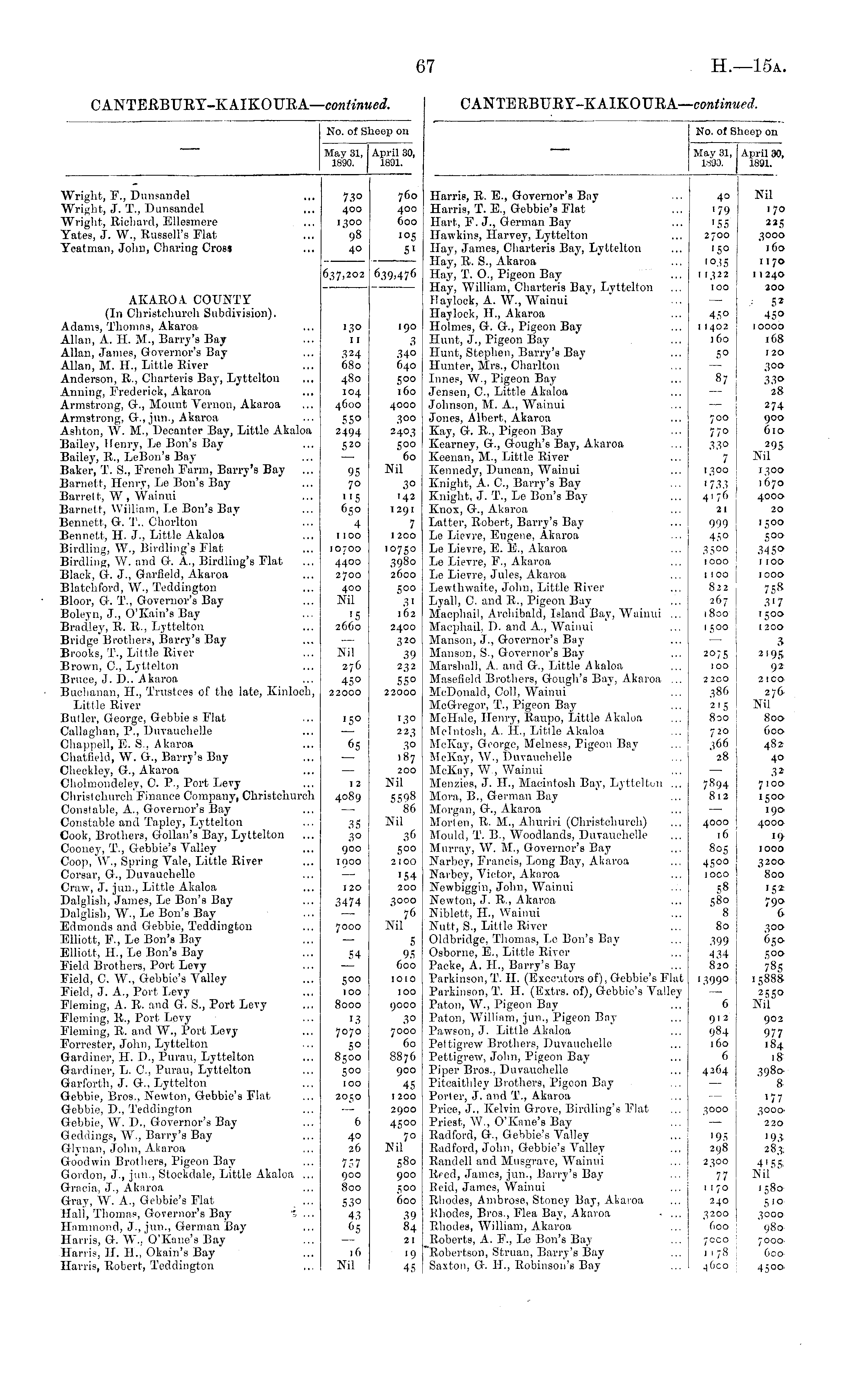 No. of Sheep on May 31, April 3C 1S90. 1891. April 30, 1891. Harris, R. E., Governor's Bay Harris, T. E., Gebbie's Flat ' Hart, F. J., German Bay Hawkins, Harvey, Lyttelton Hay, James, Cliarteris Bay, Lyttelton Hay, R. S., Akaroa Hay, T. O., Pigeon Bay Hay, William, Cliarteris Bay, Lyttelton Haylock, A. W., Wainui Haylock, H., Akaroa Holmes, G. G., Pigeon Bay Hunt, J., Pigeon Bay Hunt, Stephen, Barry's Bay Hunter, Mrs., Charlton Line?, W,, Pigeon Bay Jensen, C, Little Akaloa Johnson, M. A., Wainui Jones, Albert, Akaroa Kay, G. R., Pigeon Bay Kearney, G., Gougli's Bay, Akaroa Keenan, M., Little River Kennedy, Duncan, Wainui Knight, A. C, Barry's Bay Knight, J. T., Le Bon's Bay Knox, G., Akaroa Latter, Robert, Barry's Bay Le Lievre, Eugene, Akaroa Le Lievre, E. E., Akaroa Le Lievre, F., Akaroa Le Lievre, Jules, Akaroa Lewthwaile, John, Little River Lyall, C. and R., Pigeon Bay Macphail, Archibald, Island Bay, Wainui ... Macphail, D. and A., Wainui Manson, J., Governor's Buy Manson, S., Governor's Bay Marshall, A. and G., Little Akaloa Maselield Brothers, Gough's Bay, Akaroa ... McDonald, Coll, Wainui McGregor, T., Pigeon Bay McIIale, Henry, Raupo, Little Akaloa Melntosh, A. ii., Little Akaloa McKay, George, Melness, Pigeon Bay McKay, W., Dnvauehello McKay, W, Wainui Menzies, J. II., Macintosh Bay, Lytteltun ... Mora, B., German Bay Morgan, G., Akaroa Morten, R. M., Ahuriri (Clii'istchurcli) Mould, T. B., Woodlands, Duvauchelle Murray, W. M., Governor's Bay Narbey, Francis, Long Bay, Akaroa Narbey, Victor, Akaroa Newbiggin, John, Wainui Newton, J. R., Akaroa Niblett, II., Wainui Nult, S., Little River Oldbridge, Thomas, Le Bon's Bay Osborne, E., Little River Packe, A. II., Barry's Bay Parkinson, T. II. (Executors of), Gebbie's Flat Parkinson, T. H. (Extra, of), Gebbie's Yalley Paton, W., Pigeon Bay Paton, William, jun., Pigeon Bay Paweon, J. Little Akaloa Peltigrew Brothers, Duvauchelle Pettigrew, John, Pigeon Bay Piper Bros., Duvauchelle Piteaitliley Brothers, Pigeon Bay Porter, J. and T., Akaroa Price, J., Kelvin Grove, Birdling's Flat Priest, W., O'Knne's Bay Radford, G., Gebbie's Valley Radford, John, Gebbie's Valley Randeli and Mnsgrave, Wainui Rfed, James, jun., Barry's Bay Reid, James, Wainui Rhodes, Ambrose, Stoney Bay, Akaroa Hhodes, Bros., Flea Bay, Akaroa • ... Rhodes, William, Akaroa Roberts, A. E., Le Bon's Bay Robertson, Struan, Barry's Bay Saxton, G. 11., Robinson's Bay 40 '79 '55 2700 '5° lo.i5 I I 322 100 45° i (402 160 5° 87 700 77° 33° t 1300 1 733 4176 21 999 450 35°° ! 000 1 100 $12 2(, 7 1800 I5OO 20; s 100 2 2CO 386 2'5 800 720 366 28 1 I Nil 170 22; 3000 j6o 1170 11240 200 - S 2 45° 10000 168 120 300 .3 30 28 274 900 610 295 Nil 1300 1670 4000 20 i;oo 50034S° 1100 I COO 758 317 1 500 1200 3 2'95 92 2 ICO 276 Nil 800 600 482 40 3* 7100 1500 190 4000 19 1000 7894 812 4000 16 805 4500 1000 58 580 8 80 399 434 820 13990 6 3200 '800 IS* 79a 6 300 650 1500 78s 15888. 2550 Nil 902 977 184 18 398o 8 '77 3000220 912 984 160 6 4264 3000 '95 298 2300 ' 77 1170 240 3200 600 193 283: 4 '55. Nil 1580 a'o 3000 980 7000 Ooo 7000 ,,78 j6co 4:00.