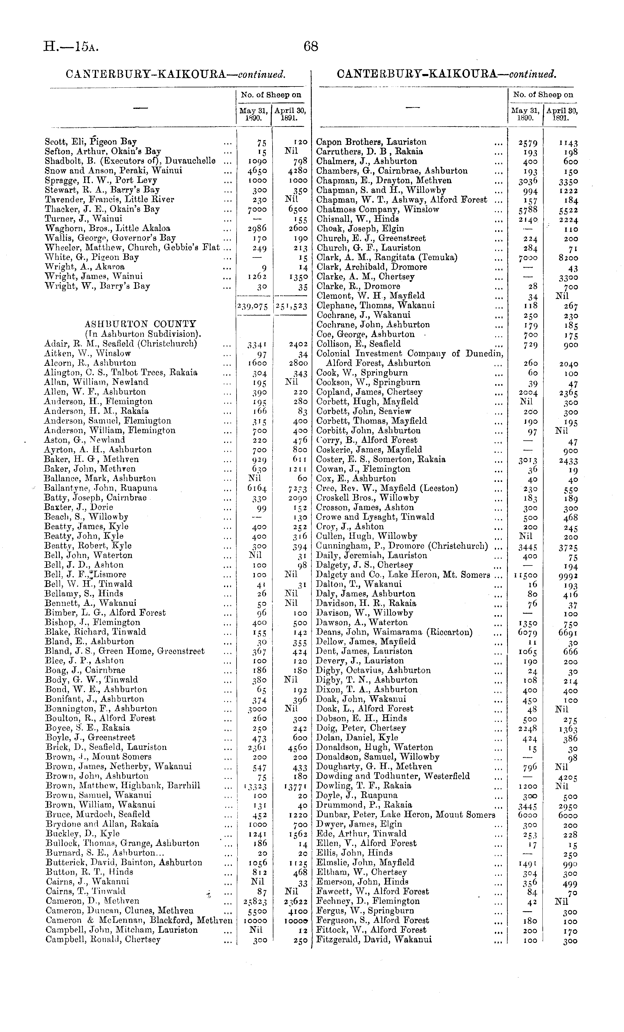 No. of Sheep on May 31, April 30, 1890. 1891. Capon Brothers, Lauriaton Carruthers, D. B , Eakaia Chalmers, J., Ashburton Chambers, Q-., Cairnbrae, Ashburton Chapman, E., Drayton, Methven Chapman, S. and H., Willowby Chapman, W. T., Ashway, Alford Forest ... Chatmoss Company, Winsiow Ohisnall, W., Hinds Choak, Joseph, Elgin Church, E. J., Crreenstreet Church, Gr. P., Lauriston Clark, A. M., Eangitata (Temuka) Clark, Archibald, Dromore Clarke, A. M., Chertsey Clarke, E., Dromore Clemont, W. H , Mayfield Olephane, Thomas, Wakanui Cochrane, J., Wakanui Cochrane, John, Ashburton Ooe, Greorge, Ashburton Oollison, E., Seafleld Colonial Investment Company of Dunedin, Alford Forest, Ashburton Cook, W., Springburn Cookson, W., Springburn Copland, James, Chertsey Corbett, Hugh, Mayfield Oorbett, John, Seaview Corbett, Thomas, Mayfield Corbitt, John, Ashburton lorry, B., Alford Forest Ooskerie, James, Mayfield Coster, E. S., Somerton, Eakaia Cowan, J., Flemington Cox, E., Ashburton Dree, Eev. W., Mayfield (Leeston) Oroskell Bros., Willowby Crosson, James, Ashton Crowe and Lygaght, Tinwald Croy, J., Ashton Cullen, Hugh, Willowby Cunningham, P., Dromore (Christchurch) ... Daily, Jeremiah, Lauriston Dalgety, J. S., Chertsey Dalgety and Co., Lake Heron, Mt. Somers ... Dalton, T., Wakanui Daly, James, Ashburton ... Davidson, H. E., Eakaia Davison, W., Willowby Dawson, A., Waterton Deans, John, Waimarama (Rieearton) Dellow, James, Mayfield Dent, James, Lauriston Devery, J., Lauriston Digby, Octavius, Ashburton Digby, T. N., Ashburton Dixon, T. A., Ashburton Doak, John, Wakanui Doak, L., Alford Forest Dobson, E. H., Hinds Doig, Peter, Chertsey Dolan, Daniel, Kyle Donaldson, Hugh, Waterton Donaldson, Samuel, Willowby Dougharty, Q-. H., Methven Dowding and Todhunter, Westerfield Dowling, T. F., Eakaia Doyle, J., Euapuna Drummond, P., Rakaia Dunbar, Peter, Lake Heron, Mount Somers Dwyer, James, Elgin Ede, Arthur, Tinwald Ellen, V., Alford Forest Ellis, John, Hinds Elmslie, John, Mayfield Eltham, W., Chertsey Emerson, John, Hinds Fawcett, W., Alford Forest Fechney, D., Flemington Fergus, W., Springburn Ferguson, S., Alford Forest Fittock, W., Alford Forest Fitzgerald, David, Wakanui 2579 193 400 193 3°36 994 157 s7 88 2140 224 28 4 yooo 28 34 118 250 '79 700 729 260 60 39 2004 Nil 200 190 97 3°'3 36 40 230 183 300 500 200 Nil 1143 198 600 150 335° 1222 .84 5522 2224 no 200 7 1 8200 43 3300 700 Nil 267 2^0 185 '75 900 2040 100 47 2365 300 300 19.5 Nil 47 900 2433 '9 40 55° 189 300 468 245 200 3725 75 194 999' i93 416 37 100 75° 6691 3° 666 3445 400 11500 16 80 76 1350 6079 11 1065 190 24 108 200 400 45° 48 500 2248 424 "5 30 214 400 ICO Nil 275 386 3° 98 Nil 796 1200 4205 Nil 300 3445 6000 500 2950 6000 200 228 iS 250 990 300 499 70 Nil 300 253 '7 149 1 304 356 84 42 180 200 300 100 170 300 100