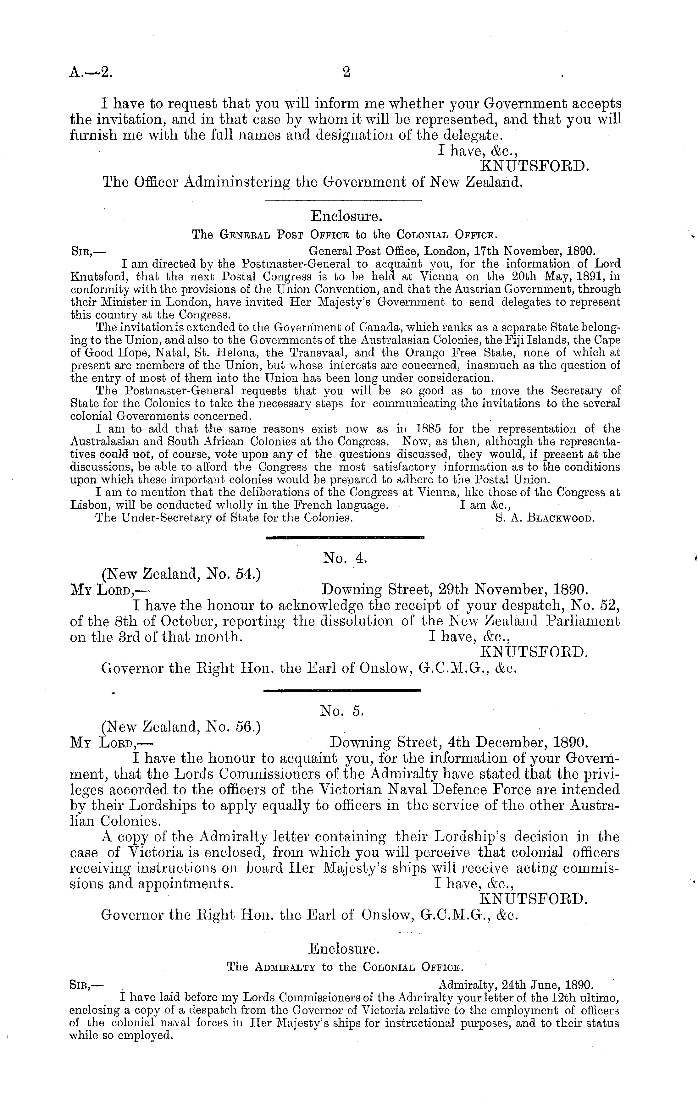 No. 5. (New Zealand, No. 56.) My Lord, — Downing Street, 4th December, 1890. I have the honour to acquaint you, for the information of your Government, that the Lords Commissioners of the Admiralty have stated that the privileges accorded to the officers of the Victorian Naval Defence Force are intended by their Lordships to apply equally to officers in the service of the other Australian Colonies. A copy of the Admiralty letter containing their Lordship's decision in the case of Victoria is enclosed, from which you will perceive that colonial officers receiving instructions on board Her Majesty's ships will receive acting commissions and appointments. I have, &c, KNUTSFOBD. Governor the Bight Hon. the Earl of Onslow, G.C.M.G., &c.