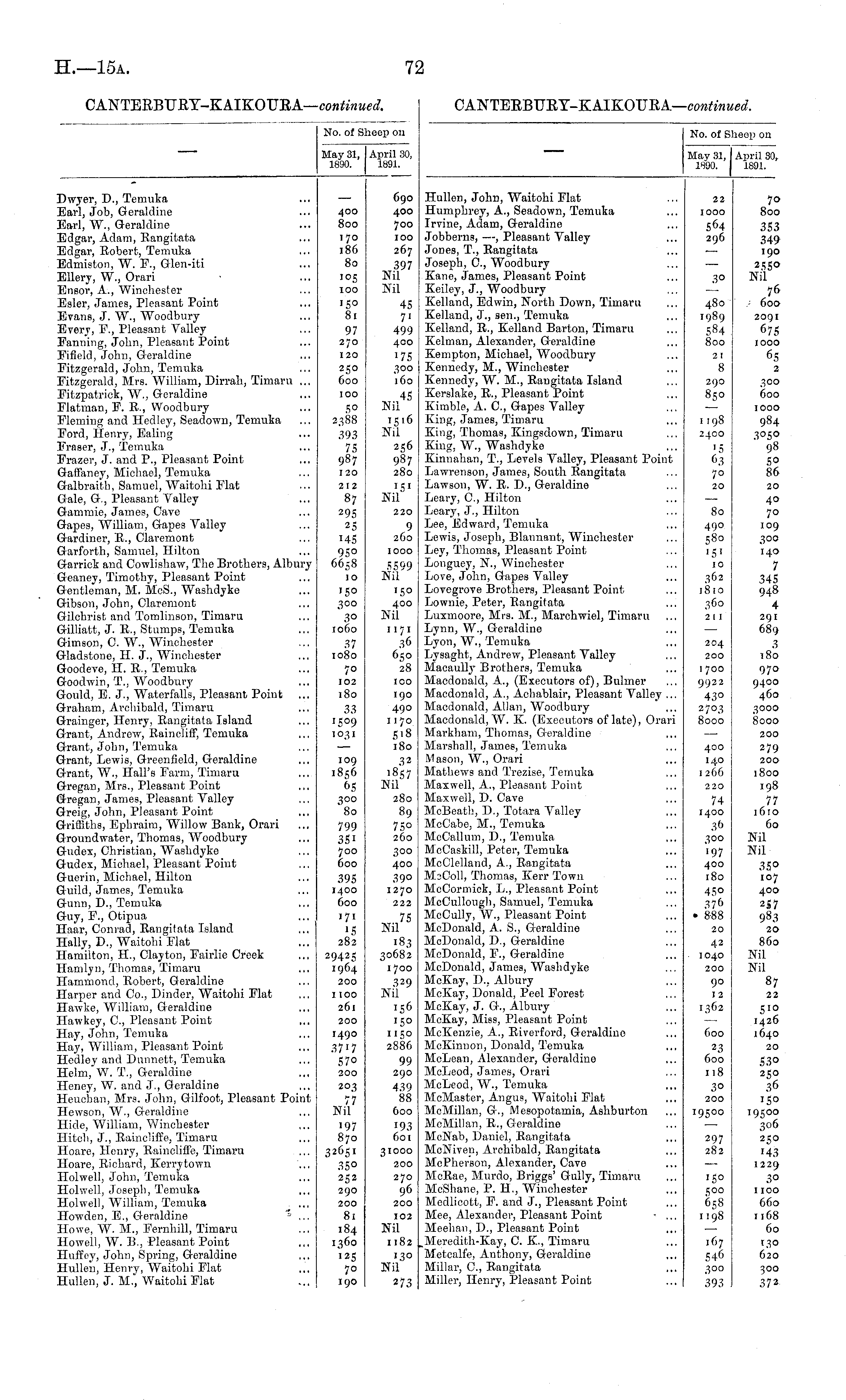 '0. 01 hoop on May 31, April 30, M90. 1891. Hullen, John, Waitohi Flat Humphrey, A., Seadown, Temuka Irvine, Adam, Greraldine Jobberns, —, Pleasant Valley Jones, T., Rangitata Joseph, C., Woodbury Kane, James, Pleasant Point Keiley, J., Woodbury Kelland, Edwin, North Down, Timaru Kelland, J., sen., Temuka Kelland, B., Kelland Barton, Timaru Kelman, Alexander, Gferaldine Kempton, Michael, Woodbury Kennedy, M., Winchester Kennedy, W. M., Rangitata Island Kerslake, B>., Pleasant Point Kimble, A. C., Grapes Valley King, James, Timaru King, Thomas, Kingsdown, Timaru King, W., Washdyke Kinnahan, T., Levels Valley, Pleasant Point Lawrenson, James, South Eangitata Lawson, W. R. D., Gferakline Leary, C, Hilton Leary, J., Hilton Lee, Edward, Temuka Lewis, Joseph, Blannant, Winchester Ley, Thomas, Pleasant Point Longuey, N., Winchester Love, John, Grapes Valley Lovegrove Brothers, Pleasant Point Lownie, Peter, Eangitata Luxmoore, Mrs. M., Marchwiel, Timaru Lynn, W., Greraldine Lyon, W., Temuka Lysaght, Andrew, Pleasant Valley Macaully Brothers, Temuka Macdonald, A., (Executors of), Buhner Macdouald, A., Achablair, Pleasant Valley ... Macdonald, Allan, Woodbury Macdonald, W. K. (Executors of late), Orari Markham, Thomas, G-eraldine Marshall, James, Temuka Mason, W., Orari Mathews and Trezise, Temuka Maxwell, A., Pleasant Point Maxwell, D. Cave McBeath, D., Totara Valley McCabe, M., Temuka McCallum, D., Temuka McCaskill, Peter, Temuka McClelland, A., Rangitata M2C0II, Thomas, Kerr Town McCormick, L., Pleasant Point McCullougli, Samuel, Temuka MoCully, W., Pleasant Point McDonald, A. S., Greraldine McDonald, D., Greraldine McDonald, E., Greraldine McDonald, James, Washdyke McKay, D., Albury McKay, Donald, Peel Forest McKay, J. G\, Albm-y McKay, Miss, Pleasant Point McKenzie, A., Eiverford, Greraldine McKinnon, Donald, Temuka McLean, Alexander, Greraldine McLeod, James, Orari McLeod, W., Temuka McMaster, Angus, Waitohi Flat McMillan, Gr., Mesopotamia, Ashburton McMillan, R., Greraldine McNab, Daniel, Eangitata McNiven, Archibald, Rangilata McPherson, Alexander, Cave McRae, Murdo, Briggs' Gully, Timaru MeShane, P. H., Winchester Medlicott, E. and J., Pleasant Point Mee, Alexander, Pleasant Point • ... Meeiian, D., Pleasant Point Meredith-Kay, C. K., Timaru Metcalfe, Anthony, Greraldine Millar, C, Rangitata Miller, Henry, Pleasant Point 22 1000 Sf>4 296 3° 480 1989 584 800 21 8 290 85° 1198 2400 '5 70 20 80 490 580 '5> 10 362 1810 360 2 11 204 200 1700 9922 43° 2703 8000 400 140 1266 70 800 353 349 190 255° Nil 76 60C> 2091 675 1000 6S 2 300 600 1000 984 3°5° 98 5° 86 20 40 70 109 300 140 7 34S 948 4 291 689 3 i8o 970 9400 460 3000 8000 200 279 200 1800 198 77 1610 60 Nil Nil. 220 74 I4OO 36 300 197 400 180 45° 3/6 • 8-88 20 42 1040 200 90 12 1362 600 23 600 118 3° 200 35° 107 4OO 217 983 20 860 Nil Nil 87 22 S'° 1426 1640 20 53° 250 36 150 19500 306 250 143 1229 3° 1 100 660 1168 60 19500 297 282 'a 0 658 1198 .67 546 300 393 130 620 300 372